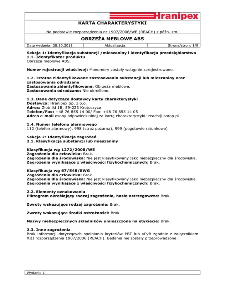 KARTA CHARAKTERYSTYKI Na podstawie rozporządzenia nr 1907/2006/WE (REACH) z późn. zm. OBRZEŻA MEBLOWE ABS Data wydania: 28.10.2011 Aktualizacja: Strona/stron: 1/9 Sekcja 1: Identyfikacja substancji /mieszaniny i identyfikacja przedsiębiorstwa 1.1. Identyfikator produktu Obrzeża meblowe ABS. Numer rejestracji właściwej: Monomery zostały wstępnie zarejestrowane. 1.2. Istotne zidentyfikowane zastosowania substancji lub mieszaniny oraz zastosowania odradzane Zastosowania zidentyfikowane: Obrzeża meblowe. Zastosowania odradzane: Nie określono. 1.3. Dane dotyczące dostawcy karty charakterystyki Dostawca: Hranipex Sp. z o.o. Adres: Złotniki 18; 59-223 Krotoszyce Telefon/Fax: +48 76 855 14 00/ Fax: +48 76 855 14 05 Adres e-mail osoby odpowiedzialnej za kartę charakterystyki: [email protected] 1.4. Numer telefonu alarmowego 112 (telefon alarmowy), 998 (straż pożarna), 999 (pogotowie ratunkowe) Sekcja 2: Identyfikacja zagrożeń 2.1. Klasyfikacja substancji lub mieszaniny Klasyfikacja wg 1272/2008/WE Zagrożenia dla człowieka: Brak. Zagrożenia dla środowiska: Nie jest klasyfikowany jako niebezpieczny dla środowiska. Zagrożenia wynikające z właściwości fizykochemicznych: Brak. Klasyfikacja wg 67/548/EWG Zagrożenia dla człowieka: Brak. Zagrożenia dla środowiska: Nie jest klasyfikowany jako niebezpieczny dla środowiska. Zagrożenia wynikające z właściwości fizykochemicznych: Brak. 2.2. Elementy oznakowania Piktogram określający rodzaj zagrożenia, hasło ostrzegawcze: Brak. Zwroty wskazujące rodzaj zagrożenia: Brak. Zwroty wskazujące środki ostrożności: Brak. Nazwy niebezpiecznych składników umieszczone na etykiecie: Brak. 2.3. Inne zagrożenia Brak informacji dotyczących spełniania kryteriów PBT lub vPvB zgodnie z załącznikiem XIII rozporządzenia 1907/2006 (REACH). Badania nie zostały przeprowadzone. Wydanie 1 KARTA CHARAKTERYSTYKI Na podstawie rozporządzenia nr 1907/2006/WE (REACH) z późn. zm. OBRZEŻA MEBLOWE ABS Data wydania: 28.10.2011 Aktualizacja: Strona/stron: 2/9 Sekcja 3: Skład/ informacja o składnikach 3.1. Substancje Nazwa substancji: Zakres stężeń [%]: Numer CAS: Numer WE: Klasyfikacja 67/548/EWG: Klasyfikacja 1272/2008/WE: Kopolimer akrylonitrylo-butadienowostyrenowy ≥ 99 9003-56-9 - 3.2. Mieszaniny Nie dotyczy. Sekcja 4: Środki pierwszej pomocy 4.1. Opis środków pierwszej pomocy Narażenie drogą oddechową: Mało prawdopodobne. W przypadku wystąpienia niepokojących objawów zasięgnąć porady lekarskiej. Kontakt ze skórą: W przypadku wystąpienia niepokojących objawów zasięgnąć porady lekarskiej. Kontakt z oczami: Usunąć szkła kontaktowe. Przemywać zanieczyszczone oczy większą ilością letniej wody, przy wywiniętych powiekach. Co pewien czas nakładać górną na dolną powiekę. W przypadku wystąpienia niepokojących objawów zasięgnąć porady lekarskiej. Po spożyciu: Mało prawdopodobne. W przypadku wystąpienia niepokojących objawów zasięgnąć porady lekarskiej. 4.2. Najważniejsze ostre i opóźnione objawy oraz skutki narażenia W normalnych warunkach stosowania żadne niekorzystne skutki narażenia nie są spodziewane. 4.3. Wskazania dotyczące wszelkiej natychmiastowej pomocy lekarskiej i szczególnego postępowania z poszkodowanym Wyprowadzić poszkodowaną osobę z zanieczyszczonego produktem środowiska. W razie wystąpienia problemów zdrowotnych, skontaktować się z lekarzem lub centrum toksykologicznym. Przekazać informacje zawarte w karcie charakterystyki. Osobie nieprzytomnej nie podawać niczego doustnie. Sekcja 5: Postępowanie w przypadku pożaru 5.1. Środki gaśnicze Odpowiednie środki gaśnicze: Rozproszony strumień wody, proszki gaśnicze, ditlenek węgla (CO2), piana gaśnicza. Niewłaściwe środki gaśnicze: Nie określono. 5.2. Szczególne zagrożenia związane z substancją lub mieszaniną Produkt palny. Podczas spalania mogą tworzyć się niebezpieczne produkty, np. tlenek węgla, akrylonitryl, butadien, styren. Należy unikać wdychania produktów spalania ponieważ mogą stwarzać zagrożenie dla zdrowia. Wydanie 1 KARTA CHARAKTERYSTYKI Na podstawie rozporządzenia nr 1907/2006/WE (REACH) z późn. zm. OBRZEŻA MEBLOWE ABS Data wydania: 28.10.2011 Aktualizacja: Strona/stron: 3/9 5.3. Informacje dla straży pożarnej Stosować pełne wyposażenie ochronne oraz aparaty izolujące drogi oddechowe z niezależnym obiegiem powietrza. Pojemniki narażone na działanie ognia lub wysokiej temperatury chłodzić wodą i w miarę możliwości usunąć z zagrożonego obszaru. Chronić kanalizację, wody powierzchniowe i glebę przed zanieczyszczeniem. Wody popożarowe traktować jako niebezpieczne zanieczyszczenie i gromadzić w oddzielnych pojemnikach. Sekcja 6: Postępowanie w przypadku niezamierzonego uwolnienia do środowiska 6.1. Indywidualne środki ostrożności, wyposażenie ochronne i procedury w sytuacjach awaryjnych Dla osób nienależących do personelu udzielającego pomocy: Należy ograniczyć dostęp osób postronnych do obszaru awarii do czasu zakończenia procesu usuwania produktu. Dla osób udzielających pomocy: Stosować odpowiednią odzież ochronną. 6.2. Środki ostrożności w zakresie ochrony środowiska Zabezpieczyć studzienki ściekowe. Nie dopuszczać do skażenia wód powierzchniowych i gruntu. W przypadku poważnego zanieczyszczenia jakiegokolwiek elementu środowiska, powiadomić odpowiednie władze administracyjne i kontrolne oraz organizacje ratownicze. Zużyte opakowania dostarczać do uprawnionych do ich przerabiania przedsiębiorstw. 6.3. Metody i materiały zapobiegające rozprzestrzenianiu się skażenia i służące do usuwania skażenia Zabezpieczyć uszkodzone opakowania. Rozsypany produkt zebrać mechanicznie. Zebrany ze środowiska produkt umieścić w opakowaniu zastępczym, ponownie wykorzystać lub skierować do zniszczenia. 6.4. Odniesienia do innych sekcji Postępowanie z odpadami – patrz sekcja 13. Środki ochrony indywid