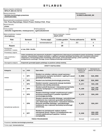 SYLABUS Nazwa programu kształcenia: WPiA-P-JM-O-N-16/17Z Nazwa przedmiotu: Kod przedmiotu: łacińska terminologia prawnicza (KIERUNKOWE) 10.0WI27AJMJ2465_6N Nazwa jednostki prowadzącej przedmiot / moduł: Kat. Prawa Rzymskiego, Historii Prawa i Doktryn Polit. -Praw Nazwa kierunku: prawo Forma studiów: Profil kształcenia: Specjalność: Jednolite magisterskie, niestacjonarne ogólnoakademicki Status przedmiotu / modułu: Język przedmiotu / modułu: język polski obowiązkowy Rok Semestr Forma zajęć Liczba godzin Forma zaliczenia ECTS 1 1 konwersatorium 20 ZO 4 Razem Koordynator przedmiotu / modułu: 20 4 dr hab. EWA GAJDA Prowadzący zajęcia: Cele przedmiotu / modułu: Wymagania wstępne: Celem przedmiotu jest zapoznanie studentów z zagadnieniami dotyczącymi pochodzenia języka łacińskiego, zasadami wymowy i akcentowania w języku łacińskim, z ogólnymi zasadami gramatyki łacińskiej oraz z łacińskimi paremiami związanymi z terminologią prawa rzymskiego, teorii prawa, prawa konstytucyjnego, prawa cywilnego i karnego, postępowania cywilnego i karnego, prawa międzynarodowego publicznego. Znajomość gramatyki języka polskiego na poziome szkoły średniej. EFEKTY KSZTAŁCENIA Kategoria Odniesienie do efektów dla programu Odniesienie do efektów dla obszaru Student ma wiedzę z zakresu zasad wymowy i akcentowania wyrazów łacińskich i ogólnych zasad gramatyki łacińskiej. K_W06 S2A_W06 EP2 Student zna łacińską terminologię prawniczą. K_W01 S2A_W05 1 EP3 Student rozumie i poprawnie stosuje łacińskie paremie oraz zwroty prawnicze. K_U11 S2A_U06 2 EP4 Student potrafi tłumaczyć i interpretować łacińskie paremie występujące w orzecznictwie sądów polskich. K_U20 S2A_U09 S2A_U10 3 EP5 Student dostrzega związki współczesnych pojęć i terminów prawniczych z prawem rzymskim i terminologią łacińską. K_U19 S2A_U05 K_K01 S2A_K01 K_K08 H2A_K05 S2A_K04 Semestr Liczba godzin Lp KOD Opis efektu 1 EP1 2 wiedza umiejętności 1 Student rozumie potrzebę dalszego, samodzielnego kształcenia się w zakresie gramatyki łacińskiej w celu właściwego tłumaczenia i rozumienia tekstów. Rozumie potrzebę dalszego, samodzielnego kształcenia się w zakresie łacińskiej terminologii prawniczej. EP6 kompetencje społeczne 2 Student ma świadomość wpływu kultury starożytnej Grecji i Rzymu na kształtowanie się i rozwój współczesnych języków i kultury europejskiej. EP7 TREŚCI PROGRAMOWE Przedmiot: łacińska terminologia prawnicza Forma zajęć: konwersatorium 1/2 1. Pochodzenie języka łacińskiego, zasady wymowy i akcentowanie w j. łac. oraz ogólne zasady gramatyki łacińskiej. 2. Łacińskie paremie związane z terminologią prawa rzymskiego, teorii prawa, prawa konstytucyjnego, prawa cywilnego i karnego, postępowania cywilnego i karnego, prawa międzynarodowego publicznego. Przykłady powoływania paremii w orzecznictwie sądów polskich i europejskich. Metody kształcenia 1 5 1 15 Praca w grupach, dyskusja, rozwiązywanie ćwiczeń, wykład, analiza i interpretacja tekstów łacińskich. Nr efektu kształcenia z sylabusa Metody weryfikacji efektów kształcenia KOLOKWIUM EP1,EP2,EP3,EP4,E P5 SPRAWDZIAN EP1,EP2,EP3,EP4,E P5,EP6,EP7 ZAJĘCIA PRAKTYCZNE (WERYFIKACJA POPRZEZ OBSERWACJE) EP2,EP6,EP7 Metody oceniania: 1) ocena bieżącego przygotowania do zajęć i aktywności na zajęciach, 2) cykliczne sprawdziany ze znajomości łacińskich paremii i zwrotów prawniczych. Kryteria oceniania: 1) pozytywna ocena z pisemnego kolokwium z podstaw gramatyki i terminologii (ocena pozytywna), 2) obecność i aktywność na zajęciach (ocena pozytywna), 3) praca pisemna na uzgodniony wcześniej temat (ocena od 4 do 5). Forma i warunki zaliczenia Ocenę z zaliczenia stanowi średnia arytmetyczna ocen z cyklicznych sprawdzianów, pisemnego kolokwium oraz aktywności. Zasady wyliczania oceny z przedmiotu Ocenę z przedmiotu stanowi ocena uzyskana z zaliczenia Gajda E., Lubińska B. (2014): Ignorantia iuris nocet. Łacińska terminologia prawnicza., Toruń, TNOiK Literatura podstawowa Sondel J. (1997): Słownik łacińsko- polski dla prawników i historyków., Kraków Korpanty J. (2001): Mały słownik łacińsko - polski., Warszawa Literatura uzupełniająca Kumaniecki K. (1999): Słownik łacińsko - polski., Warszawa NAKŁAD PRACY STUDENTA Liczba godzin Zajęcia dydaktyczne 20 Udział w egzaminie/zaliczeniu 1 Przygotowanie się do zajęć 15 Studiowanie literatury 30 Udział w konsultacjach 15 Przygotowanie projektu / eseju / itp. 4 Przygotowanie się do egzaminu/zaliczenia 15 Inne 0 ŁĄCZNY nakład pracy studenta w godz. 100 Liczba punktów ECTS 4 2/2