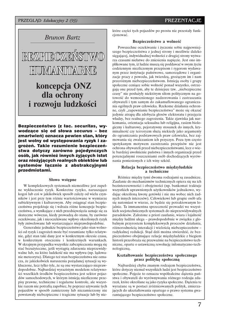 PRZEGLĄD Edukacyjny 2 (93) Brunon Bartz koncepcja ONZ dla ochrony i rozwoju ludzkości Bezpieczeństwo (z łac. securitas, wywodzące się od słowa securus – bez zmartwień) oznacza pewien stan, który jest wolny od występowania ryzyk i zagrożeń. Takie rozumienie bezpieczeństwa dotyczy zarówno pojedynczych osób, jak również innych żyjących istot oraz nieżyjących realnych obiektów lub systemów łącznie z abstrakcyjnymi przedmiotami. Słowo wstępne W kompleksowych systemach niemożliwe jest zupełne wykluczenie ryzyk. Konkretne ryzyko, naruszające kogoś lub coś w jakikolwiek sposób zależy od wielu czynników i jest przy tym różnie wartościowane w wymiarze subiektywnym i kulturowym. Aby osiągnąć stan bezpieczeństwa projektuje się i wdraża różne koncepcje bezpieczeństwa, a wynikające z nich przedsięwzięcia uznaje się za skuteczne wówczas, kiedy prowadzą do stanu, by zarówno oczekiwane, jak i nieoczekiwane wpływy określonych ryzyk były zniwelowane lub wystarczająco nieprawdopodobne. Generalnie jednakże bezpieczeństwo jako stan wolności od ryzyk i zagrożeń może być rozumiane tylko relatywnie, gdyż stan taki dany jest w konkretnym okresie czasu, w konkretnym otoczeniu i konkretnych warunkach. W skrajnym przypadku wszystkie zabezpieczenia mogą się stać bezużyteczne, jeśli wystąpią zdarzenia nieprzewidywalne lub, na które ludzkość nie ma wpływu (np. lądowanie meteorytu). Dlatego też stan bezpieczeństwa nie oznacza, że jakiekolwiek naruszenia pożądanej sytuacji są wykluczone, lecz tylko tyle, że są one wystarczająco nieprawdopodobne. Najbardziej wyrazistym modelem relatywności wszelkich środków bezpieczeństwa jest sektor pojazdów samochodowych, w którym istnieją niezliczone przepisy prawne, techniczne i regularne kontrole, ale wszystkie razem nie potrafią zapobiec, by poprzez używanie tych pojazdów w sposób zamierzony lub niezamierzony nie powstawały niebezpieczne i tragiczne sytuacje lub by nie- PREZENTACJE które części tych pojazdów po prostu nie przestały funkcjonować. Bezpieczeństwo a wolność Powszechne oczekiwanie i życzenie sobie najpewniejszego bezpieczeństwa z jednej strony i możliwie daleko sięgającej, indywidualnej wolności z drugiej strony wytwarza czasami niełatwe do zniesienia napięcie. Jest ono implikowane tym, iż ludzie muszą się poddawać w swym życiu codziennym niezliczonym przepisom i rygorom wydawanym przez instytucje państwowe, samorządowe i organizacje pracy z powodu, jak twierdzą, grożącym im i nam przeróżnym niebezpieczeństwom. Istnieją osoby i grupy społeczne ceniące sobie wolność ponad wszystko, ostrzegają one przed tym, aby te dzisiejsze tzw. „niebezpieczne czasy” nie posłużyły niektórym siłom politycznym na gotowość do wzmocnionego nadzorowania i zastraszania obywateli i tym samym do zakamuflowanego ograniczania ogólnych praw człowieka. Rzekome działania ochronne, czyli „zapewnianie bezpieczeństwa” może się okazać jedynie atrapą dla zdobycia głosów elektoratu i przejęcia władzy, bez realnego zagrożenia. Takie zjawiska jak narkomania, orientacja seksualna lub religijna, rasizm biologiczny i kulturowy, pejoratywny stosunek do innych, kryminalność czy terroryzm służą niekiedy jako argumenty do ograniczania podstawowych praw człowieka, bez zajmowania się zwalczaniem ich przyczyn. Poza tym często spotykanym motywem zaostrzania przepisów nie jest ochrona obywateli przed niebezpieczeństwami, lecz o wiele bardziej uwolnienie państwa i innych organizacji przed potencjalnymi roszczeniami osób dochodzących wyrównania poniesionych z ich winy szkód. Relacja bezpieczeństwo międzyludzkie a techniczne Różnice między tymi dwoma rodzajami są zasadnicze. Zaufanie do mechanizmów technicznych opiera się na ich bezinteresowności i obojętności (np. bankomat traktuje wszystkich uprawnionych użytkowników jednakowo, wydając określoną kwotę gotówki i nie ma wobec nich żadnych innych interesów). Człowiekowi lub grupie osób ufa się natomiast w wierze, że będzie się potraktowanym lojalnie. Ta immanentna sprzeczność prowadzi we wszystkich socjotechnicznych systemach do nieprzewidywalnych paradoksów. Założone a priori zaufanie, wiara i lojalność między ludźmi ulega – prawdopodobnie w związku z globalnym przyrostem kompleksowych procesów działania, różnorodnością interakcji i wielością niebezpieczeństw – radykalnej redukcji. Stąd dziś można stwierdzić, że bezpieczeństwo obejmujące relacje międzyludzkie z biegiem historii przeobraża się przeważnie na bezpieczeństwo techniczne, oparte o ustawiczną rewolucję infomatyczno-technologiczną. Kształtowanie bezpieczeństwa społecznego przez politykę społeczną Najbardziej chyba znanym rodzajem bezpieczeństwa, które dotyczy niemal wszystkich ludzi jest bezpieczeństwo społeczne. Pojęcie to oznacza współzależne dążenia państwa i obywateli do wyrównywania różnego rodzaju zdarzeń, które określane są jako ryzyka społeczne. Dążenia te wyrażane są w postaci zróżnicowanych polityk, zmierzających do ukształtowania opartego o prawo systemu gwarantującego bezpieczeństwo społeczne. 7 PREZENTACJE Państwo, które chce zabezpieczyć swoich obywateli przed różnymi ryzykami i ratyfikować Konwencję 102 Międzynarodowej Organizacji Pracy (ILO), musi zabezpieczyć społeczeństwo przed co najmniej trzema z dziewięciu ryzyk społecznych i przy tym spełniać konkretnie ustaloną liczbę wymagań minimalnych. Do dziewięciu ryzyk społecznych zaliczono: choroby (wymagające opieki medycznej), choroby (jako powody do wyrównania straty dochodu), bezrobocie, starzenie się, wypadki w pracy i choroby zawodowe, macierzyństwo, niezdolność do pracy, śmierć, obciążenia rodzinne. Przy kształtowaniu systemu bezpieczeństwa społecznego polityka ta orientuje się na ustalone wyobrażenie społeczeństwa o sprawiedliwości
