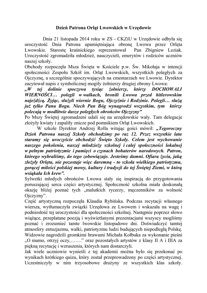 Dzień Patrona Orląt Lwowskich w Urzędowie Dnia 21 listopada 2014 roku w ZS - CKZiU w Urzędowie odbyła się uroczystość Dnia Patrona upamiętniająca obronę Lwowa przez Orlęta Lwowskie. Starostę kraśnickiego reprezentował Pan Zbigniew Leziak. Uroczystość zgromadziła młodzież, nauczycieli, emerytów i rodziców uczniów naszej szkoły. Obchody rozpoczęła Msza Święta w Kościele p.w. Św. Mikołaja w intencji społeczności Zespołu Szkół im. Orląt Lwowskich, wszystkich poległych za Ojczyznę, a szczególnie spoczywających na cmentarzach we Lwowie. Dyrektor zacytował napis z symbolicznej mogiły żołnierzy drugiej obrony Lwowa: „W tej dolinie spoczywa tysiąc żołnierzy, którzy DOCHOWALI WIERNOŚCI… polegli w walkach, bronili Lwowa przed hitlerowskim najeźdźcą. Żyjąc, służyli wiernie Bogu, Ojczyźnie i Rodzinie. Polegli… służą już tylko Panu Bogu. Niech Pan Bóg wynagrodzi wszystkim, tym którzy polecają w modlitwie dusze poległych obrońców Ojczyzny” Po Mszy Świętej zgromadzeni udali się na urzędowskie wały. Tam delegacje złożyły kwiaty i zapaliły znicze pod pomnikiem Orląt Lwowskich. W szkole Dyrektor Andrzej Rolla witając gości mówił: „Tegoroczny Dzień Patrona naszej Szkoły obchodzimy po raz 12. Przez wszystkie lata staramy się uroczyście obchodzić Święto Szkoły. Celem jest wychowanie naszego pokolenia, naszej młodzieży szkolnej i całej społeczności lokalnej w pełnym patriotyzmie i pamięci o czynach bohaterów narodowych. Patron, którego wybraliśmy, do tego zobowiązuje. Jesteśmy dumni. Ofiara życia, jaką złożyły Orlęta, nie pozostaje więc daremną - to szkoła wielkiego patriotyzmu, gorącej miłości polskiej mowy, kultury i tradycji do tej Świętej Ziemi, w którą wsiąkała Ich krew”. Sylwetki młodych obrońców Lwowa stały się inspiracją do przygotowania poruszającej serca części artystycznej. Społeczność szkolna miała doskonałą okazję bliżej poznać tych „malutkich rycerzy, męczenników za wolność Ojczyzny”. Część artystyczną rozpoczęła Klaudia Rybińska. Podczas recytacji własnego wiersza, wytłumaczyła związki Urzędowa ze Lwowem i wskazała na wagę i podniosłość tej uroczystości dla społeczności szkolnej. Następnie poprzez słowo wiążące, przeplatane poezją i wyświetlanymi prezentacjami wszyscy mogliśmy poznać i zrozumieć tamte lwowskie listopadowe dni. Doświadczyć tamtej atmosfery entuzjazmu, walki, patriotyzmu ludzi budujących niepodległą Polskę. Widzowie nagrodzili gromkimi brawami Michała Kołbuka za wykonanie pieśni „O mamo, otrzyj oczy,…….” oraz pozostałych artystów z klasy II A i IIIA za piękną recytację i wzruszenia, których nam dostarczyli. Jak wiele uczniowie wynieśli z tej akademii można było się przekonać po wynikach krótkiego quizu, który został przeprowadzony po części artystycznej. Uczestniczyły w nim trzyosobowe drużyny ze wszystkich klas szkoły. Uczestnicy wykazali się bardzo dużą wiedzą na temat patrona szkoły i listopadowych walk o Lwów z 1918 roku. Najlepiej z pytaniami poradziła sobie klasa I A, która wygrała ten konkurs. Zwycięzcy otrzymali atrakcyjne nagrody. Święto Patrona Szkoły to również czas rozstrzygnięcia konkursów o Patronie. Konkurs na tekst literacki o Patronie Szkoły: „ORLĘTA LWOWSKIEPATRON BLISKI CZY DALEKI?” – nagrodzeni uczniowie: Klaudia Rybińska, Anna Łoboda, Eliza Kania, Paulina Suchanowska. Konkurs na plakat o Patronie Szkoły: „BLIZEJ PATRONA SZKOŁY” nagrodzeni uczniowie: Anna Łoboda, Patrycja Stęgierska. Dyrektor szczególne podziękowanie skierował do Michała Kołbuka, który zawsze uroczystości szkolne uświetnia śpiewem i grą na trąbce. Dzień Patrona uzmysłowił, że pamięć o Orlętach Lwowskich jest wciąż żywa. Heroiczna postawa młodych bohaterów Lwowa jest godna podziwu, a wartości prezentowane przez nich są wciąż aktualne. Legenda Orląt Lwowskich łączy pokolenia. Dzień Patrona naszej Szkoły to wyraz wielkiego patriotyzmu i wdzięczności wobec tych, którzy w tamtych czasach nie poddali się ciężarom niewoli i nie przestali wierzyć, że nadejdzie kiedyś jutrzenka wolności i dali świadectwo bohaterstwa i umiłowania Ojczyzny. Andrzej Rolla