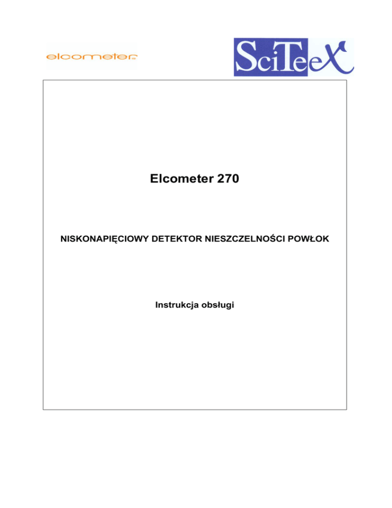 Elcometer 270 NISKONAPIĘCIOWY DETEKTOR NIESZCZELNOŚCI POWŁOK Instrukcja obsługi Spis treści 1. Ogólne informacje o mierniku………………………………………3 2. Uruchomienie…………………………………………………………5 3. Obsługa detektora……………………………………………………7 4. Specyfikacja techniczna……………………………………………..8 5. Części zamienne i akcesoria………………………………………..9 6. Regulacje………………………………………………………………11 7. Wyposażenie powiązane…………………………………………….11 SciTeeX Spółka z o.o. 2 Instrukcja obsługi Elcometer 270 1. Ogólne informacje o mierniku Detektor nieszczelności powłok Elcometer 270 wykorzystuje do badań metodę „mokrej gąbki” .W chwili gdy wilgotna gąbka znajduje się ponad nieszczelnością w badanej powłoce, dzięki wilgoci możliwy jest przepływ prądu przez otwór w powłoce do podłoża i dalej przez podłoże i przewód z powrotem do miernika. Przepływ prądu powoduje automatyczne włączenie sygnalizacji dźwiękowej i świetlnej. W zależności od modelu, tester Elcometer 270 może pracować przy napięciu 9 V, 67,5 V i 90 V. SciTeeX Spółka z o.o. 3 Instrukcja obsługi Elcometer 270 1.1. Zakres instrukcji Niniejsza instrukcja opisuje obsługę następujących modeli detektora Elcometer 270: • Elcometer 270/1: 9V • Elcometer 270/2: 67,5 V • Elcometer 270/3: 9 V i 90 V ( dwu napięciowy) • Elcometer 270/4: 9 V, 67,5 V i 90 V (trzy napięciowy) Wybór napięcia w modelach dwu- i trzy- napięciowych jest dokonywany przez użytkownika. 1.2. Normy Detektor Elcometer 270 spełnia wymagania z zakresu prowadzenia badań określone m.in. w następujących normach: BS 1344-11, BS 7295-1’ BS 7793-2, EN ISO 8289 A, NACE RP 0188, ASTM G6-83, ASTM G62-87, ASTM D-5162 1.2. Zakres dostawy • Detektor Elcometer 270 • Standardowy uchwyt z gąbką • Przewód z zaciskiem • Baterie (3 szt) • Instrukcja obsługi Całość jest dostarczana w kartonowym pudełku. Należy zwrócić uwagę aby uchronić zawartość przed zewnętrznym uszkodzeniem. SciTeeX Spółka z o.o. 4 Instrukcja obsługi Elcometer 270 Aby zapewnić jak najlepsze wykorzystanie możliwości urządzenia, proszę poświęcić trochę czasu i zapoznać się z niniejszą instrukcją. W przypadku wątpliwości proszę się skontaktować z firmą Elcometer lub jej najbliższym przedstawicielem. 2. Uruchomienie 2.1. Montaż baterii 1. Wyłączyć detektor 2. Okręcić i zdjąć osłonę baterii 3. Włożyć trzy baterie zwracając uwagę na ich właściwe zamontowanie 4. Założyć osłonę baterii. Baterie alkaiczne powinny być używane i utylizowane zgodnie z lokalnymi wymogami chroniącymi środowisko Nie należy wrzucać zużytych baterii do ognia. 2.2. Jakość baterii Jeżeli poziom energii baterii jest wystarczający, nie będzie się świecił LED informujący o poziomie zasilania baterii Przy 10% poziomie zasilania baterii LED świeci się w sposób ciągły Jeżeli LED mruga, baterie muszą być wymienione. SciTeeX Spółka z o.o. 5 Instrukcja obsługi Elcometer 270 2.3. Włączanie i wyłączanie Aby włączyć przyrząd należy wcisnąć i przytrzymać przycisk . Detektor wyemituje sygnał dźwiękowy i włączy się. Aby wyłączyć przyrząd należy wcisnąć i przytrzymać . Detektor wyemituje sygnał dźwiękowy i przycisk wyłączy się. 2.4. Wybór napięcia Dotyczy przyrządów z dwoma lub trzema napięciami roboczymi Aby zmienić napięcie pracy należy wcisnąć przycisk Detektor wyemituje sygnał dźwiękowy i przełączy się na inne napięcie. Zaświeci się LED odpowiedni dla wybranego napięcia. Wybrane napięcie będzie zapamiętane przez miernik. Po wyłączeniu i ponownym włączeniu będzie ono wybranym napięciem pracy. 2.5. Sprawdzenie kalibracji Podczas włączania detektora lub przy zmianie napięcia pracy urządzenie wykonuje sprawdzenie kalibracji wewnętrznego napięcia i swojej czułości. To sprawdzenie zajmuje kilka sekund. Podczas sprawdzenia wskaźnik napięcia LED mruga najpierw powoli a po chwili szybko. Po zakończeniu sprawdzenia LED świeci w sposób ciągły a miernik emituje podwójny sygnał dźwiękowy oznaczający pozytywny wynik sprawdzenia. W bardzo rzadkich przypadkach, jeżeli test nie wypadnie pomyślnie należy przede wszystkim sprawdzić stan baterii. W przypadku braku poprawnego sprawdzenia w dalszym ciągu należy zwrócić się do dostawcy urządzenia. SciTeeX Spółka z o.o. 6 Instrukcja obsługi Elcometer 270 3. Obsługa detektora 1. Podłączyć przewód zamykający obwód do niepokrytej powierzchni podłoża metalowego badanego elementu za pomocą zacisku „krokodylkowego” 2. Zmoczyć gąbkę czystą wodąa,b 3. Trzymając wilgotną gąbkę nad badaną powierzchnią, włączyć detektor 4. Odczekać parę sekund do usłyszenia podwójnego sygnału dźwiękowego, sygnalizującego sprawdzenie wewnętrznej kalibracji urządzenia. 5. W przypadku używania detektora dwu lub trzy napięciowego, wybrać właściwe do badania napięcie: • 9 V: odpowiednie dla powłok o grubości do 300 µm • 90 V: odpowiednie dla powłok o grubości do 500 µm • 67,5 V odpowiadające wymaganiom norm amerykańskich 6. Położyć gąbkę na pokrytej powierzchni. Jeżeli gąbka znajdzie się nad nieszczelnością powłoki, zapali się LED oraz rozlegnie się sygnał dźwiękowy informujący o nieszczelności. Sygnał nie będzie emitowany po usunięciu gąbki z nad nieszczelności. 7. Aby zlokalizować nieszczelność bardziej precyzyjnie należy przeszukać obszar za pomocą krawędzi lub samego rogu gąbki. a). Woda powinna zawierać sole pozwalające przewodzić elektryczność b). Maksymalną efektywność detektora możemy uzyskać stosując do nawilżania roztwór 600:1 wody ze środkami takimi jak m.in. Kodak Photo-floTM SciTeeX Spółka z 