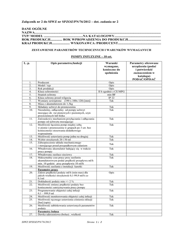Załącznik nr 2 do SIWZ nr SPZOZ/PN/76/2012 – dot. zadania nr 2 DANE OGÓLNE NAZWA..................................................................................................................................................... TYP/ MODEL ..............................................NA KATALOGOWY....................................................... ROK PRODUKCJI.............. ROK WPROWADZENIA DO PRODUKCJI....................................... KRAJ PRODUKCJI..................... WYKONAWCA /PRODUCENT................................................... ZESTAWIENIE PARAMETRÓW TECHNICZNYCH I WARUNKÓW WYMAGANYCH POMPY INFUZYJNE – 10 szt. L. p. 1. 2. 3. 4. 5. 6. 7. 8. 9. 10. 11. 12. 13. 14. 15. 16. 17. 18. 19. 20. 21. 22. 23. 24. 25. 26. 27. Opis parametru,funkcji Warunki wymagane, konieczne do spełnienia Producent Model / typ Rok produkcji Klasa ochronności Stopień ochrony Klasa ochrony przed wilgocią Wymiary zewnętrzne (190 x 100x 120) [mm] Masa z akumulatorem do 1,5kg Składany uchwyt do przenoszenia Niezależny, odłączalny od pompy uchwyt mocujący do rur pionowych i poziomych, szyn przyściennych lub łóżka Zatrzaskowy mechanizm przyłączania i odłączania pompy od uchwytu mocującego Możliwość łączenia pomp między sobą w pionie i przenoszenia w grupach po 3 szt. bez konieczności stosowania dodatkowego wyposażenia Możliwość ustawiania pomp jedna na drugiej Wybór strzykawek 20 i 50 ml Zabezpieczenie układu mechanicznego i sterującego przed przypadkowym zalaniem Wbudowany akumulator ładujący się w trakcie pracy pompy Wbudowany zasilacz sieciowy Maksymalny czas pracy przy zasilaniu akumulatorowym podać prędkość przepływu ml/h min. 10 godzin przy przepływie 10 ml/h Możliwość zasilania z instalacji karetki Parametry pracy Zakres prędkości podaży ml/h (min-max) dla jakich wielkości strzykawek 0,1-99,9 ml/h co 0,1ml Dokładność podaży min.+/- 2 % Możliwość zmiany prędkości podaży bez konieczności zatrzymywania pracy pompy Programowanie objętości całej infuzji 0,1 – 999,9 ml Możliwość monitorowania objętości całej infuzji Możliwość ręcznego ustawienia ciśnienia okluzji [bar] (opis) Możliwość zablokowania ustawionych parametrów podaży Parametry bolusa Dawka uderzeniowa (bolus) , wielkość Opis Opis Opis II b zgodnie z CE/MPG min BF IP 22 Tak SIWZ SPZOZ/PN/76/2012 Strona 1 z 2 Tak Tak Tak Tak Tak Tak Tak Tak Tak Tak Tak Opis Tak Tak Tak Tak Tak Tak Tak Parametry oferowane urządzenia (podać i potwierdzić zaznaczeniem w katalogu) PODAĆ/OPISAĆ 28. 29. 30. 31. 32. 33. 34. 35. 36. 37. 38. 39. 40. 41. 42. 43. 44. do 50 ml Prędkość podaży dawki uderzeniowej – bolusa 800 ml/h Kontrola objętości podawanej dawki uderzeniowej - bolusa w czasie jej infuzji Możliwość podania dawki uderzeniowej – bolusa bez zatrzymywania infuzji Wyświetlacz Wyświetlacz tekstowy , komunikaty w jęz. polskim Rozmiar wyświetlacza Wyświetlane informacje: Typ i wielkość strzykawki, prawidłowość umocowania strzykawki, prędkość przepływu, praca pompy, podana objętość, alarm okluzji, zasilanie z sieci lub akumulatora, poziom naładowania akumulatora, przyczyna alarmu. Klawiatura Klawiatura numeryczna System zabezpieczeń Automatyczne rozpoznanie typu , wielkości strzykawki i prawidłowego zamocowania Możliwość ręcznego wyboru poziomu alarmu okluzji: 0,3/0,6/1,2 bar Alarm niewłaściwego zamocowania strzykawki Automatyczna redukcja zgromadzonej objętości bolusa po uruchomieniu się alarmu okluzji Alarmy wstępne: 3 minuty przed opróżnieniem strzykawki, 30 minut przed rozładowaniem akumulatora Alarmy wizualne i akustyczne z automatycznym zatrzymaniem podaży: nieprawidłowe zamocowanie strzykawki, okluzja, koniec wlewu, pusta strzykawka, rozładowany akumulator Wezwanie personelu Inne alarmy Inne cechy Licznik całkowitego czasu pracy pompy, przetoczonej objętości itp. Eksploatacja Możliwość wymiany oprogramowania za pomocą złącza RS 232 ...........................dnia............................ Tak Tak Tak Tak Opis Tak Tak Tak Tak Tak Tak Tak Tak Tak Opis Tak Tak ............................................... (podpis osoby – osób uprawnionych do składania oświadczeń woli wraz z pieczątką imienną) SIWZ SPZOZ/PN/76/2012 Strona 2 z 2