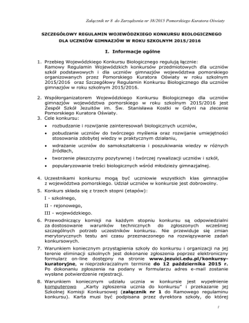 Załącznik nr 8 do Zarządzenia nr 38/2015 Pomorskiego Kuratora Oświaty SZCZEGÓŁOWY REGULAMIN WOJEWÓDZKIEGO KONKURSU BIOLOGICZNEGO DLA UCZNIÓW GIMNAZJÓW W ROKU SZKOLNYM 2015/2016 I. Informacje ogólne 1. Przebieg Wojewódzkiego Konkursu Biologicznego regulują łącznie: Ramowy Regulamin Wojewódzkich konkursów przedmiotowych dla uczniów szkół podstawowych i dla uczniów gimnazjów województwa pomorskiego organizowanych przez Pomorskiego Kuratora Oświaty w roku szkolnym 2015/2016 oraz Szczegółowy Regulamin Konkursu Biologicznego dla uczniów gimnazjów w roku szkolnym 2015/2016. 2. Współorganizatorem Wojewódzkiego Konkursu Biologicznego dla uczniów gimnazjów województwa pomorskiego w roku szkolnym 2015/2016 jest Zespół Szkół Jezuitów im. Św. Stanisława Kostki w Gdyni na zlecenie Pomorskiego Kuratora Oświaty. 3. Cele konkursu: rozbudzanie i rozwijanie zainteresowań biologicznych uczniów, pobudzanie uczniów do twórczego myślenia oraz rozwijanie umiejętności stosowania zdobytej wiedzy w praktycznym działaniu, wdrażanie uczniów do samokształcenia i poszukiwania wiedzy w różnych źródłach, tworzenie płaszczyzny pozytywnej i twórczej rywalizacji uczniów i szkół, popularyzowanie treści biologicznych wśród młodzieży gimnazjalnej. 4. Uczestnikami konkursu mogą być uczniowie wszystkich klas gimnazjów z województwa pomorskiego. Udział uczniów w konkursie jest dobrowolny. 5. Konkurs składa się z trzech stopni (etapów): I - szkolnego, II - rejonowego, III - wojewódzkiego. 6. Przewodniczący komisji na każdym stopniu konkursu są odpowiedzialni za dostosowanie warunków technicznych do zgłoszonych wcześniej szczególnych potrzeb uczestników konkursu. Nie przewiduje się zmian merytorycznych testu ani czasu przeznaczonego na rozwiązywanie zadań konkursowych. 7. Warunkiem koniecznym przystąpienia szkoły do konkursu i organizacji na jej terenie eliminacji szkolnych jest dokonanie zgłoszenia poprzez elektroniczny formularz on-line dostępny na stronie www.jezuici.edu.pl/konkursykuratoryjne, w nieprzekraczalnym terminie do 12 października 2015 r. Po dokonaniu zgłoszenia na podany w formularzu adres e-mail zostanie wysłane potwierdzenie rejestracji. 8. Warunkiem koniecznym udziału ucznia w komputerowo „Karty zgłoszenia ucznia do Szkolnej Komisji Konkursowej (załącznik nr konkursu). Karta musi być podpisana przez konkursie jest wypełnienie konkursu” i przekazanie jej 1 do Ramowego regulaminu dyrektora szkoły, do której 1 Załącznik nr 8 do Zarządzenia nr 38/2015 Pomorskiego Kuratora Oświaty uczęszcza uczeń i przez rodzica (prawnego opiekuna). Podpis rodzica automatycznie jest zgodą na uczestnictwo dziecka w konkursie i na przetwarzanie jego danych na potrzeby konkursu oraz na publikację wyników konkursowych w internecie. 9. Uczeń może przystąpić do odpowiedniego stopnia konkursu po okazaniu komisji konkursowej aktualnej legitymacji szkolnej lub innego dokumentu potwierdzającego tożsamość. 10.Uczestnicy stopnia II i III winni stawić się w miejscu odbywania konkursu na pół godziny przed jego rozpoczęciem. Niestawienie się ucznia o godzinie rozpoczęcia konkursu oznacza rezygnację z udziału w konkursie. II. Organizacja i przebieg konkursu Terminy Stopień I - szkolny II - rejonowy Termin 4 listopada 2015 r. (środa) godz. 14.00 Miejsce szkoła macierzysta ucznia 20 stycznia 2016 r. (środa) według przypisanych godz. 14.00 rejonów Zespół Szkół Jezuitów III - 2 marca 2016 r. (środa) im. Św. Stanisława Kostki wojewódzki godz. 12.00 ul. Tatrzańska 35 81-313 Gdynia I stopień - szkolny 1. W I stopniu (szkolnym) konkursu może wziąć udział każdy uczeń gimnazjum. 2. Eliminacje odbędą się dnia 4 listopada 2015 r. o godzinie 14.00. 3. Eliminacje szkolne organizują i przeprowadzają Szkolne Komisje Konkursowe (SKK) powołane przez dyrektorów szkół gimnazjalnych. 4. Przewodniczący Wojewódzkiej Komisji Konkursowej przygotowuje zestaw zadań konkursowych i przesyła je w formacie PDF dnia 2 listopada 2015 r. pocztą emailową na adres szkoły podany w formularzu rejestracyjnym. SKK powielają zestawy zadań dla wszystkich uczniów, którzy zgłosili chęć udziału w konkursie. W przypadku nieotrzymania zestawu zadań Przewodniczący SKK niezwłocznie powiadamia przewodniczącą WKK telefonicznie (58) 661-61-80. 5. Zestaw zadań konkursowych może zawierać zadania otwarte oraz zamknięte. 6. Czas rozwiązywania zadań na etapie szkolnym wynosi 60 minut. 2 Załącznik nr 8 do Zarządzenia nr 38/2015 Pomorskiego Kuratora Oświaty 7. Na etapie szkolnym obowiązuje materiał zawarty w podstawie programowej nauczania biologii w gimnazjum (rozporządzeniu Ministra Edukacji Narodowej z dnia 27 sierpnia 2012 r. w sprawie podstawy programowej wychowania przedszkolnego oraz kształcenia ogólnego w poszczególnych typach szkół.) 8. Szkolne Komisje Konkursowe, po przeprowadzeniu konkursu i sprawdzeniu prac uczniowskich wg przesłanego klucza odpowiedzi sporządzają protokół (załącznik nr 4 do Ramowego regulaminu) z przebiegu eliminacji szkolnych konkursu przedmiotowego. 9. Do udziału w II stopniu konkursu typuje się uczniów, którzy uzyskali co najmniej 70% punktów możliwych do uzyskania w eliminacjach szkolnych (I stopień konkursu). 10. Do 9 listopada 2015 r. przewodniczący SKK przesyła listem poleconym lub dostarcza osobiście do właściwej Rejonowej Komisji Konkursowej (RKK): a) potwierdzony przez Dyrektora szkoły, wypełniony komputerowo, protokół (załącznik nr 4 do Ramowego regulaminu) przebiegu stopnia I konkursu, zawierający informację o uczniach wytypowanych przez SKK do udziału w II stopniu konkursu, b) prace uczestników I stopnia konkursu, którzy uzyskali co najmniej 70% możliwych do zdobycia punktów, c) wypełnione i podpisane „Karty zgłoszenia ucznia do konkursu” uczniów zakwalifikowanych do II stopnia, d) informację o potrzebie dostosowania warunków 