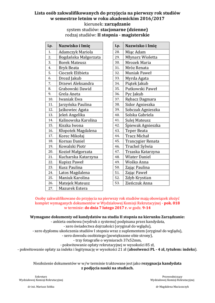 Lista osób zakwalifikowanych do przyjęcia na pierwszy rok studiów w semestrze letnim w roku akademickim 2016/2017 kierunek: zarządzanie system studiów: stacjonarne (dzienne) rodzaj studiów: II stopnia - magisterskie Lp. 1. 2. 3. 4. 5. 6. 7. 8. 9. 10. 11. 12. 13. 14. 15. 16. 17. 18. 19. 20. 21. 22. 23. 24. 25. 26. 27. Nazwisko i Imię Adamczyk Mariola Bogdańska Małgorzata Borek Mateusz Bryk Beata Cioczek Elżbieta Drozd Jakub Drzewi Aleksandra Grabowski Dawid Grela Aneta Iwaniak Ewa Jarzyńska Paulina Jaśkowiec Agata Jeleń Angelika Kalinowska Karolina Kiszka Iwona Kłopotek Magdalena Korec Mikołaj Kornas Daniel Kowalski Piotr Kozioł Małgorzata Kucharska Katarzyna Kupisz Paweł Kusz Paulina Latos Magdalena Maniuk Karolina Matejek Mateusz Mazurek Estera Lp. 28. 29. 30. 31. 32. 33. 34. 35. 36. 37. 38. 39. 40. 41. 42. 43. 44. 45. 46. 47. 48. 49. 50. 51. 52. 53. 54. Nazwisko i Imię Miąc Adam Młynarz Wioletta Mrozek Maria Mróz Renata Muniak Paweł Myrda Agata Piątek Jakub Putkowski Paweł Pyc Jakub Rębacz Dagmara Sidor Agnieszka Sobczak Agnieszka Solska Gabriela Sulej Mateusz Śpiewak Agnieszka Teper Beata Tracz Michał Trancygier Renata Truchel Sylwia Trzaska Katarzyna Wiater Daniel Wośko Anna Zając Paulina Zając Paweł Zdyb Krystian Zieńczuk Anna Osoby zakwalifikowane do przyjęcia na pierwszy rok studiów mają obowiązek złożyć komplet wymaganych dokumentów w Wydziałowej Komisji Rekrutacyjnej - pok. 018 w terminie: do dnia 7 lutego 2017 r. w godz. 9-14 Wymagane dokumenty od kandydatów na studia II stopnia na kierunku Zarządzanie: - ankieta osobowa (wydruk z systemu) podpisana przez kandydata, - xero świadectwa dojrzałości (oryginał do wglądu), - xero dyplomu ukończenia studiów I stopnia wraz z suplementem (oryginał do wglądu), - xero dowodu osobistego (powiększone obie strony), - trzy fotografie o wymiarach 37x52mm, - pokwitowanie opłaty rekrutacyjnej w wysokości 85 zł, - pokwitowanie opłaty za indeks i legitymację w wysokości 21 zł (absolwenci PL - 4 zł, tytułem: indeks). Niezłożenie dokumentów w w/w terminie traktowane jest jako rezygnacja kandydata z podjęcia nauki na studiach. Sekretarz Wydziałowej Komisji Rekrutacyjnej Przewodniczący Wydziałowej Komisji Rekrutacyjnej dr inż. Mariusz Sobka dr Magdalena Maciaszczyk