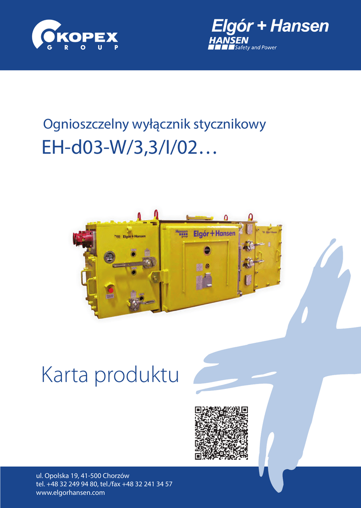 Ognioszczelny wyłącznik stycznikowy EH-d03-W/3,3/I/02… Karta produktu ul. Opolska 19, 41-500 Chorzów tel. +48 32 249 94 80, tel./fax +48 32 241 34 57 www.elgorhansen.com CECHY CHARAKTERYSTYCZNE Wyłącznik stycznikowy typu EH-d03-W/3,3/I/02… jest łącznikiem manewrowym w osłonie ognioszczelnej przeznaczonym do łączenia i sterowania odbiorników trójfazowych stosowanych w napędach maszyn i urządzeń górniczych średniego napięcia. Zasilanie ognioszczelnego wyłącznika stycznikowego przewidziane jest z sieci o napięciu znamionowym 3,3kV z izolowanym punktem neutralnym transformatora zasilającego. Ognioszczelny wyłącznik stycznikowy przystosowany jest do pracy rewersyjnej realizowanej za pomoca styczników. Cztery odpływy wyposażono w styczniki i uziemniki szybkie. W wyłączniku stycznikowym przewidziano odpływ pomocniczy dla zasilania odbiorników jednofazowych o napięciu znamionowym 42V. Osłona ognioszczelna wyłącznika stycznikowego podzielona jest na trzy wydzielone komory ognioszczelne, zapewniające możliwość rozmieszczenia wyposażenia elektrycznego z zachowaniem bezpieczeństwa dostępu do podzespołów w stanie beznapięciowym. Wyłącznik stycznikowy jest urządzeniem w wykonaniu przeciwwybuchowym i zgodnie z polskimi przepisami wykonawczymi Prawa Geologicznego i Górniczego może być instalowany w podziemnych wyrobiskach zakładów górniczych niemetanowych i metanowych ze stopniem zagrożenia metanowego „a”, „b”, „c” oraz klasy „A” i „B” zagrożenia wybuchem pyłu węglowego. Zastosowane zabezpieczenia elektroenergetyczne oraz przyjęty system sterowania i współpracy z blokadami technologicznymi z wykorzystaniem obwodów iskrobezpiecznych, zapewniają bezpieczną współpracę z zasilanymi urządzeniami i/lub maszynami górniczymi. Konstrukcja wyłącznika stycznikowego opracowana została zgodnie z wymaganiami dyrektywy 94/9/WE (ATEX). Certyfikat zgodności predysponuje stosowanie wyłącznika w pomieszczeniach z atmosferą wybuchową grupy I kategorii M2. Możliwość stosowania wyłącznika stycznikowego w pomieszczeniach z atmosferą wybuchową została wraz z cechami charakterystycznymi podana na tabliczce znamionowej. Opcjonalnie wyłącznik stycznikowy przystosowany jest do podłączenia układu transmisji danych umożliwiający odczyt informacji technologicznych i ich przesył na powierzchnię kopalni (np. do dyspozytora). BUDOWA Osłona ognioszczelna wyłącznika stycznikowego składa sie z trzech zasadniczych komór: • o d strony zasilania, • k omory głównej (aparaturowej), • o d strony odpływu. Komory są bezpośrednio ze sobą połączone, a ich współpraca zapewnia prawidłowe działanie w układzie wyłącznika stycznikowego. Standardowo ognioszczelny wyłącznik stycznikowy wyposażony jest we wpusty przewodowo-kablowe, umożliwiające zadławienie kabla i/lub przewodu oponowego o średnicy zewnętrznej 50÷81mm. W razie potrzeby istnieje możliwość zastosowania wpustów przewodowo-kablowych o możliwościach dławienia kabli i/lub przewodów oponowych w zakresie 9÷81mm. OPIS DZIAŁANIA Obwód główny wyłącznika stycznikowego od strony zasilania wyposażony jest w izolacyjny przełącznik rozłącznikowy zapewniający możliwość przełączania kolejności faz napięcia zasilania oraz uziemnik szybki. Ognioszczelny wyłącznik stycznikowy wyposażony jest w wyłącznik zabezpieczeniowy chroniący odpływy od skutków zwarć. Cztery odpływy wyposażono w styczniki i uziemniki szybkie. W wyłączniku stycznikowym występuje również odpływ przeznaczony do zasilania odbiorników jednofazowych o napięciu znamionowym 42V. Sterowanie zdalne poszczególnych odpływów obwodu głównego z wykorzystaniem pulpitu sterowniczego lub przycisku sterowniczego powinno być realizowane za pomocą zewnętrznych separatorów z obwodami iskrobezpiecznymi (nie stanowią standardowego wyposażenia ognioszczelnego wyłącznika stycznikowego). Odpływy obwodu głównego chronione są przez zabezpieczenia/przekaźniki: • n admiarowopradowe (zwarcie, przeciążenie, asymetria), • s terownicze i kontroli ciągłości uziemienia, • u pływowe blokujące chroniące przed podaniem napięcia na obwody z uszkodzoną izolacją, • temperaturowe silników, • o raz w układ próby izolacji doziemnej, za pomocą którego istnieje możliwość wykonania próby stanu rezystancji izolacji poszczególnych odpływów. www.elgorhansen.com Ognioszczelny wyłącznik stycznikowy EH-d03-W/3,3/I/02… DANE TECHNICZNE Typ EH-d03-W/3,3/I/02… Znamionowe napięcie izolacji i łączeniowe 3,3kV Częstotliwość znamionowa 50Hz Znamionowy prąd ciągły 630A Maksymalny prąd ciągły pojedyńczego odpływu do 320A Ilość odpływów 4 Prąd znamionowy wyłączalny zwarciowy wyłącznika zabezpieczeniowego 20kA Znamionowy prąd odpływu jednofazowego 42V 3,8A Ilość odpływów obwodu 42V 1 Stopień ochrony IP54 Masa 2300kg SCHEMAT URZĄDZENIA F Q01 T01 Q02 T09 F Q10 K11.1 K11.2 K21.1 K21.2 Q11 11.1 11.2 Q01 – izolacyjny przełacznik rozłacznikowy Q02, Q11, Q21 – uziemnik szybki Q10 – wyłacznik zabezpieczeniowy K11.1, K11.2, K21.1, K21.2 – stycznik obwodu głównego K Q21 21.1 21.2 K – stycznik odpływu 42V F – wkładka topikowa T01, T09 – transformator potrzeb własnych i/lub pomocniczy ul. Opolska 19, 41-500 Chorzów tel. +48 32 249 94 80, tel./fax +48 32 241 34 57 www.elgorhansen.com 00. 42V Ognioszczelny wyłącznik stycznikowy EH-d03-W/3,3/I/02… RYSUNEK WYMIAROWY CECHA BUDOWY PRZECIWWYBUCHOWEJ IM2 EX d I 1453 Certyfikat badania typu WE: KOMAG/08/ATEX/95x ZNAK DOPUSZCZENIA GX - 43/08 GX - 44/08 GX - 45/08 ul. Grabowa 1, 40-172 Katowice tel. +48 32 604 70 00, tel./fax +48 32 604 71 00 www.kopex.com.pl