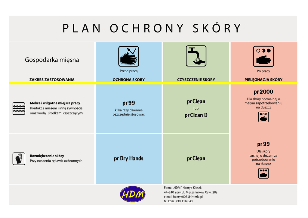 PLAN OCHRONY SKÓRY Gospodarka mięsna Przed pracą ZAKRES ZASTOSOWANIA Mokre i wilgotne miejsca pracy Kontakt z mięsem i inną żywnością oraz wodą i środkami czyszczącymi OCHRONA SKÓRY kilka razy dziennie oszczędnie stosować Po pracy CZYSZCZENIE SKÓRY PIELĘGNACJA SKÓRY lub Dla skóry normalnej o małym zapotrzebowaniu na tłuszcz Dla skóry suchej o dużym za potrzebowaniu na tłuszcz Rozmiękczenie skóry Przy noszeniu rękawic ochronnych Firma „HDM‘‘ Henryk Kłosek 44-240 Zory ul. Meczenników Osw. 28a e mail [email protected] tel.kom. 730 116 043