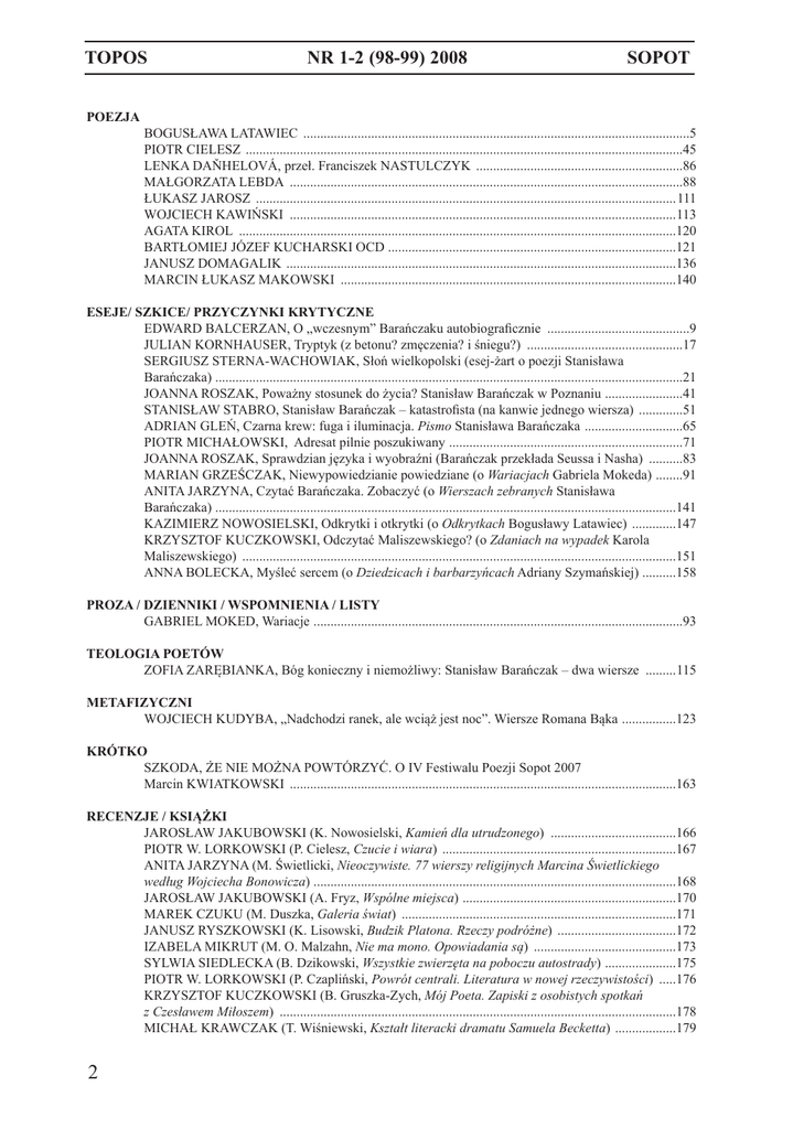 TOPOS POEZJA NR 1-2 (98-99) 2008 SOPOT BOGUSŁAWA LATAWIEC ...................................................................................................................5 PIOTR CIELESZ ..................................................................................................................................45 LENKA DAŇHELOVÁ, przeł. Franciszek NASTULCZYK ..............................................................86 MAŁGORZATA LEBDA .....................................................................................................................88 ŁUKASZ JAROSZ .............................................................................................................................111 WOJCIECH KAWIŃSKI ...................................................................................................................113 AGATA KIROL ..................................................................................................................................120 BARTŁOMIEJ JÓZEF KUCHARSKI OCD .....................................................................................121 JANUSZ DOMAGALIK ....................................................................................................................136 MARCIN ŁUKASZ MAKOWSKI ....................................................................................................140 ESEJE/ SZKICE/ PRZYCZYNKI KRYTYCZNE EDWARD BALCERZAN, O „wczesnym” Barańczaku autobiograficznie ...........................................9 JULIAN KORNHAUSER, Tryptyk (z betonu? zmęczenia? i śniegu?) ...............................................17 SERGIUSZ STERNA-WACHOWIAK, Słoń wielkopolski (esej-żart o poezji Stanisława Barańczaka) ..........................................................................................................................................21 JOANNA ROSZAK, Poważny stosunek do życia? Stanisław Barańczak w Poznaniu . ......................41 STANISŁAW STABRO, Stanisław Barańczak – katastrofista (na kanwie jednego wiersza) ..............51 ADRIAN GLEŃ, Czarna krew: fuga i iluminacja. Pismo Stanisława Barańczaka . ............................65 PIOTR MICHAŁOWSKI, Adresat pilnie poszukiwany .....................................................................71 JOANNA ROSZAK, Sprawdzian języka i wyobraźni (Barańczak przekłada Seussa i Nasha) ...........83 MARIAN GRZEŚCZAK, Niewypowiedzianie powiedziane (o Wariacjach Gabriela Mokeda) . .......91 ANITA JARZYNA, Czytać Barańczaka. Zobaczyć (o Wierszach zebranych Stanisława Barańczaka) ........................................................................................................................................141 KAZIMIERZ NOWOSIELSKI, Odkrytki i otkrytki (o Odkrytkach Bogusławy Latawiec) ..............147 KRZYSZTOF KUCZKOWSKI, Odczytać Maliszewskiego? (o Zdaniach na wypadek Karola Maliszewskiego) .................................................................................................................................151 ANNA BOLECKA, Myśleć sercem (o Dziedzicach i barbarzyńcach Adriany Szymańskiej) ..........158 PROZA / DZIENNIKI / WSPOMNIENIA / LISTY GABRIEL MOKED, Wariacje .............................................................................................................93 TEOLOGIA POETÓW ZOFIA ZARĘBIANKA, Bóg konieczny i niemożliwy: Stanisław Barańczak – dwa wiersze ..........115 METAFIZYCZNI WOJCIECH KUDYBA, „Nadchodzi ranek, ale wciąż jest noc”. Wiersze Romana Bąka . ...............123 KRÓTKO SZKODA, ŻE NIE MOŻNA POWTÓRZYĆ. O IV Festiwalu Poezji Sopot 2007 Marcin KWIATKOWSKI ...................................................................................................................163 RECENZJE / KSIĄŻKI JAROSŁAW JAKUBOWSKI (K. Nowosielski, Kamień dla utrudzonego) ......................................166 PIOTR W. LORKOWSKI (P. Cielesz, Czucie i wiara) ......................................................................167 ANITA JARZYNA (M. Świetlicki, Nieoczywiste. 77 wierszy religijnych Marcina Świetlickiego według Wojciecha Bonowicza) ...........................................................................................................168 JAROSŁAW JAKUBOWSKI (A. Fryz, Wspólne miejsca) . ..............................................................170 MAREK CZUKU (M. Duszka, Galeria świat) ..................................................................................171 JANUSZ RYSZKOWSKI (K. Lisowski, Budzik Platona. Rzeczy podróżne) ....................................172 IZABELA MIKRUT (M. O. Malzahn, Nie ma mono. Opowiadania są) ...........................................173 SYLWIA SIEDLECKA (B. Dzikowski, Wszystkie zwierzęta na poboczu autostrady) . ....................175 PIOTR W. LORKOWSKI (P. Czapliński, Powrót centrali. Literatura w nowej rzeczywistości) ......176 KRZYSZTOF KUCZKOWSKI (B. Gruszka-Zych, Mój Poeta. Zapiski z osobistych spotkań z Czesławem Miłoszem) ......................................................................................................................178 MICHAŁ KRAWCZAK (T. Wiśniewski, Kształt literacki dramatu Samuela Becketta) ...................179 2 KRZYSZTOF KUCZKOWSKI (T. Majewski, Przeplotnia. Wybór reportaży, opowiadań, felietonów i wywiadów 1990-2006; Oj, oj, Ojczyzna. Wybór reportaży, opowiadań, felietonów i wywiadów 1990-2007) . ....................................................................................................................180 10 ZDAŃ Krzysztof BĄK, Znaki wodne; Nadżib MAHFUZ, Złodziej i psy; Andriej KURKOW, Ostatnia miłość prezydenta; Dariusz Cezary MALESZYŃSKI, Księga żalów; Marek WAWRZYŃSKI, 129 wierszy polskich; Janina OSEWSKA, Do czasu przyszłego; Grzegorz WALCZAK, Sopel słońca; Daniela ZAJĄCZKOWSKA, Wagabunda i księżyc; Mariusz APPEL, Blok rysunkowy; Bożena BOBA-DYGA, Kropla. . ....................................