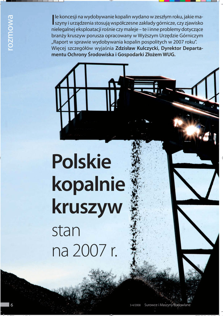 rozmowa I le koncesji na wydobywanie kopalin wydano w zeszłym roku, jakie maszyny i urządzenia stosują współczesne zakłady górnicze, czy zjawisko nielegalnej eksploatacji rośnie czy maleje – te i inne problemy dotyczące branży kruszyw porusza opracowany w Wyższym Urzędzie Górniczym „Raport w sprawie wydobywania kopalin pospolitych w 2007 roku”. Więcej szczegółów wyjaśnia Zdzisław Kulczycki, Dyrektor Departamentu Ochrony Środowiska i Gospodarki Złożem WUG. Polskie kopalnie kruszyw stan na 2007 r. 6 3-4/2008 Surowce i Maszyny Budowlane Ile jest dziś kopalń kruszyw w Polsce? Według stanu na 31.12.2007 r. okręgowe urzędy górnicze sprawowały nadzór nad 4465 odkrywkowymi zakładami wydobywającymi kopaliny pospolite. • Dane o ilości zakładów górniczych to nie jedyne informacje, jakie możemy znaleźć w wydanym przez WUG „Raporcie…”. Jaka jest geneza tego dokumentu? Po noweli Prawa geologicznego i górniczego w 2001 r. ujednolicono nadzór nad wydobywaniem kopalin pospolitych, przekazując go w ręce dyrektorów okręgowych urzędów górnicz ych, w miejsce starostów i wojewodów. Wyższy Urząd Górniczy zadecydował wówczas, że w nowej sytuacji konieczne jest prz ygotowanie odpowiedniego raportu, który określiłby stan polskiego górnictwa kopalin pospolitych. Do tej pory nie przeprowadzono bowiem takiego rozpoznania, brak było systemowego monitoringu. Tak też powstał pierwszy raport, aktualizowany co roku. Całość końcowa to połączone raporty dyrektorów okręgowych urzędów górniczych przesyłanych do Departamentu Ochrony Środowiska i Gospodarki Złożem WUG. „ ciągnięć jest zdecydowanie mniej. Ale do pełnej satysfakcji jeszcze daleka droga. • Skupmy się na raporcie za 2007 rok. Jakie najważniejsze kwestie porusza? Raport pokazuje, jak wyglądało w minionym roku wydawanie koncesji dla przedsiębiorców wydobywających kopaliny pospolite. Zawiera stan ilościowy zakładów, jak również opisuje poziom zatrudnienia, wydobycia, prezentuje systemy prowadzenia robót górniczych. Jest tu też mowa o poziomie bezpieczeństwa, wypadkowości i tak zwanej nielegalnej eksploatacji. Jak już wspomniałem, na koniec roku 2007 na obszarze Polski zarejestrowanych było 4465 odkrywkowych zakładów górniczych wydobywających kopaliny pospolite. W stosunku do roku 2006 ich liczba wzrosła o 269. Najwięcej zlokalizowanych było na terenie województwa wielkopolskiego i mazowieckiego. Do dnia 31.12.2007r. na terenie kraju ilość wydanych koncesji na wydobywanie kopalin pospolitych wynosiła 5310. W ubiegłym roku organy koncesyjne przekazały 505 decyzji. Patrząc na dane z lat 2002-2007 można zauważyć znaczny udział koncesji wydanych przez starostów w stosunku do pozostałych organów. W zeszłym roku było to aż 74%. Wśród firm wydobywających odkrywkowo kopaliny pospolite zdecydowaną większość – 79% – stanowią kopalnie kruszywa naturalnego (piasków i żwirów). Co istotne: wśród zakładów, które uzyskały koncesję na prowadzenie działalności, tylko 66% – w naszej ocenie – aktualnie prowadzi eksploatację. W pozostałych albo nie rozpoczęto jeszcze wydobycia, albo eksploatacja nie jest prowadzona w dłuższym przedziale czasowym, albo też trwa likwidacja zakładu górniczego. rozmowa • Do dnia 31.12.2007r. na terenie kraju ilość wydanych koncesji na wydobywanie kopalin pospolitych wynosiła 5310. W ubiegłym roku organy koncesyjne przekazały 505 decyzji • Jaki obraz branży wyłonił się po opracowaniu pierwszego raportu? Byliśmy poważnie zaniepokojeni, ponieważ sytuacja nie była dobra. W wielu przypadkach brakowało wymaganej dokumentacji. Przedsiębiorcy nie monitorowali prowadzenia działalności, nie wykonywano pomiarów, nie rozliczano się z zasobów złoża, nie nanoszono na mapy przebiegu frontów i rozwoju eksploatacji górniczej. Niejednokrotnie dokumentacja mierniczo-geologiczna, a więc podstawowe źródło informacji o pracach eksploatacyjnych, w ogóle nie była prowadzona. Brakowało też planów, na podstawie których miał być prowadzony ruch zakładu górniczego. Wydobycie prowadziły osoby nieposiadające kwalifikacji wymaganych przez prawo: nie zatrudniano kierowników ruchu czy osób dozoru. Maszyny stosowane na kopalniach, niejednokrotnie nieprzystosowane do wydobywania kopalin, obsługiwane były przez osoby bez odpowiedniego przygotowania, przeszkolenia. • Co wówczas zrobił WUG? Przez pierwsze dwa, trzy lata nie nakładaliśmy rygorystycznych sankcji. Jedynie wyjaśnialiśmy, tłumaczyliśmy konieczność stosowania przepisów prawa, pokazywaliśmy, jakie dokumenty muszą być sporządzone i to, że niezbędne jest zatrudnienie kierownika ruchu czy osób dozoru. Sytuacja stopniowo ulegała poprawie. Podnoszenie świadomości zarządzających kopalniami przynosi efekty – z roku na rok dyrektorzy okręgowych urzędów górniczych stwierdzają kwalifikacje coraz większej liczby osób kierownictwa i dozoru ruchu, a i innych niedo- 3-4/2008 Surowce i Maszyny Budowlane • Jeden punktów „Raportu…” dotyczy wielkości wydobycia. Przy badaniu wielkości wydobycia wprowadziliśmy kilka kategorii. Analizowano mianowicie czynne zakłady górnicze o wydobyciu rocznym kruszyw: do 10 tys. ton, od 10 tys. do 35 tys. ton, od 35 tys. do 100 tys. ton, od 100 tys. do 200 tys. ton i powyżej 200 tys. ton. Z danych wynika, że w blisko 37% czynnych kopalń wydobycie roczne nie przekracza 10 tys. Natomiast zakłady o wydobyciu powyżej 200 tys. stanowią zaledwie 8% całości. Jeśli chodzi o lokalizację zakładów małych, to ich nasycenie jest największe w woj. lubelskim i podkarpackim, natomiast dużych – w woj. śląskim i dolnośląskim. • Jak wygląda średnio poziom zatrudnienia w kopalniach? W zakresie badania zatrudnienia również dokonaliśmy pewnej kategoryzacji – podzieliliśmy przedsiębiorstwa górnicze na jednostki zatrudniające: do 2 pracownik