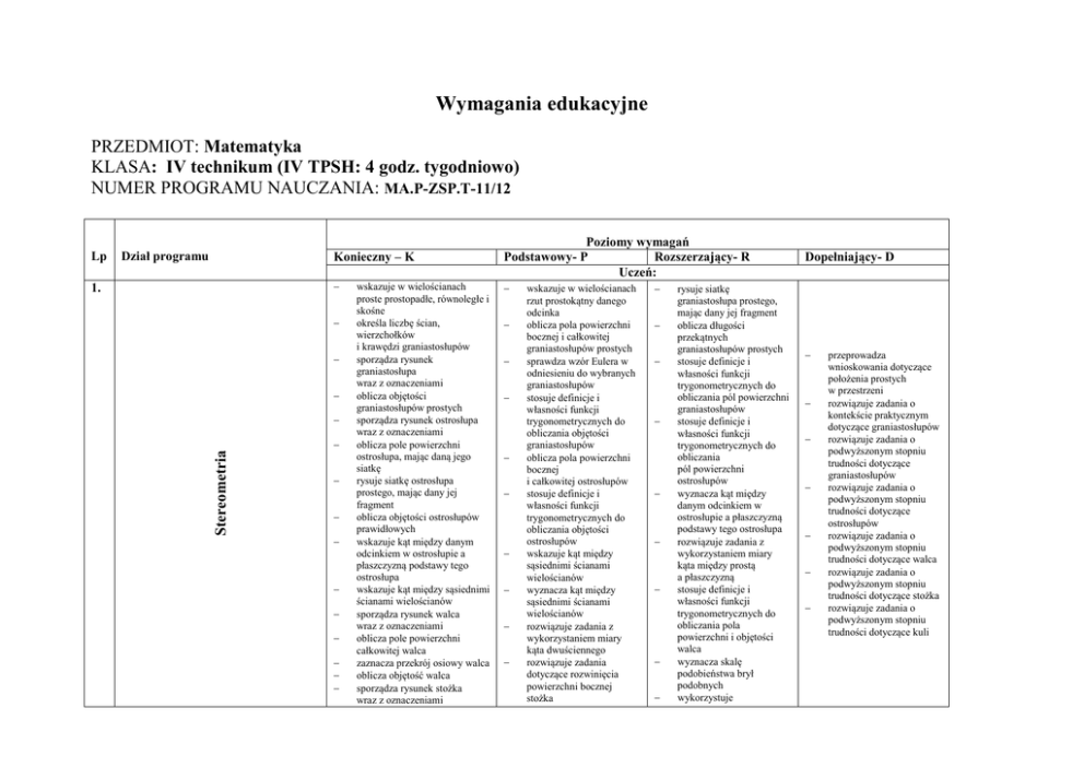 Wymagania edukacyjne PRZEDMIOT: Matematyka KLASA: IV technikum (IV TPSH: 4 godz. tygodniowo) NUMER PROGRAMU NAUCZANIA: MA.P-ZSP.T-11/12 Lp Dział programu 1. Konieczny – K Poziomy wymagań Podstawowy- P Rozszerzający- R Uczeń: Stereometria wskazuje w wielościanach proste prostopadłe, równoległe i skośne określa liczbę ścian, wierzchołków i krawędzi graniastosłupów sporządza rysunek graniastosłupa wraz z oznaczeniami oblicza objętości graniastosłupów prostych sporządza rysunek ostrosłupa wraz z oznaczeniami oblicza pole powierzchni ostrosłupa, mając daną jego siatkę rysuje siatkę ostrosłupa prostego, mając dany jej fragment oblicza objętości ostrosłupów prawidłowych wskazuje kąt między danym odcinkiem w ostrosłupie a płaszczyzną podstawy tego ostrosłupa wskazuje kąt między sąsiednimi ścianami wielościanów sporządza rysunek walca wraz z oznaczeniami oblicza pole powierzchni całkowitej walca zaznacza przekrój osiowy walca oblicza objętość walca sporządza rysunek stożka wraz z oznaczeniami wskazuje w wielościanach rzut prostokątny danego odcinka oblicza pola powierzchni bocznej i całkowitej graniastosłupów prostych sprawdza wzór Eulera w odniesieniu do wybranych graniastosłupów stosuje definicje i własności funkcji trygonometrycznych do obliczania objętości graniastosłupów oblicza pola powierzchni bocznej i całkowitej ostrosłupów stosuje definicje i własności funkcji trygonometrycznych do obliczania objętości ostrosłupów wskazuje kąt między sąsiednimi ścianami wielościanów wyznacza kąt między sąsiednimi ścianami wielościanów rozwiązuje zadania z wykorzystaniem miary kąta dwuściennego rozwiązuje zadania dotyczące rozwinięcia powierzchni bocznej stożka rysuje siatkę graniastosłupa prostego, mając dany jej fragment oblicza długości przekątnych graniastosłupów prostych stosuje definicje i własności funkcji trygonometrycznych do obliczania pól powierzchni graniastosłupów stosuje definicje i własności funkcji trygonometrycznych do obliczania pól powierzchni ostrosłupów wyznacza kąt między danym odcinkiem w ostrosłupie a płaszczyzną podstawy tego ostrosłupa rozwiązuje zadania z wykorzystaniem miary kąta między prostą a płaszczyzną stosuje definicje i własności funkcji trygonometrycznych do obliczania pola powierzchni i objętości walca wyznacza skalę podobieństwa brył podobnych wykorzystuje Dopełniający- D przeprowadza wnioskowania dotyczące położenia prostych w przestrzeni rozwiązuje zadania o kontekście praktycznym dotyczące graniastosłupów rozwiązuje zadania o podwyższonym stopniu trudności dotyczące graniastosłupów rozwiązuje zadania o podwyższonym stopniu trudności dotyczące ostrosłupów rozwiązuje zadania o podwyższonym stopniu trudności dotyczące walca rozwiązuje zadania o podwyższonym stopniu trudności dotyczące stożka rozwiązuje zadania o podwyższonym stopniu trudności dotyczące kuli oblicza pole powierzchni całkowitej stożka zaznacza przekrój osiowy i kąt rozwarcia stożka oblicza objętość stożka sporządza rysunek kuli wraz z oznaczeniami, zaznacza koło wielkie oblicza pole powierzchni kuli i jej objętość stosuje definicje i własności funkcji trygonometrycznych do obliczania pola powierzchni i objętości stożka podobieństwo brył do obliczania objętości Powtórzenie wiadomości 2. Standardy wymagań egzaminacyjnych zawarte w „Informatorze o egzaminie maturalnym od 2010 roku – matematyka” Kryteria ocen: Dopuszczający- otrzymuje uczeń, który opanował 100% wymagań z poziomu koniecznego Dostateczny – otrzymuje uczeń, który opanował 100 % wymagań z poziomu K i 75 % z poziomu P Dobry - otrzymuje uczeń, który opanował 100 % wymagań z poziomu K i P oraz 75 % z poziomu R Bardzo dobry - otrzymuje uczeń, który opanował 100 % wymagań z poziomu K , P i R oraz 75 % z poziomu D Celujący- otrzymuje uczeń, który opanował 100 % treści programowych a ponadto proponuje rozwiązania nietypowe, bierze udział w konkursach przedmiotowych.