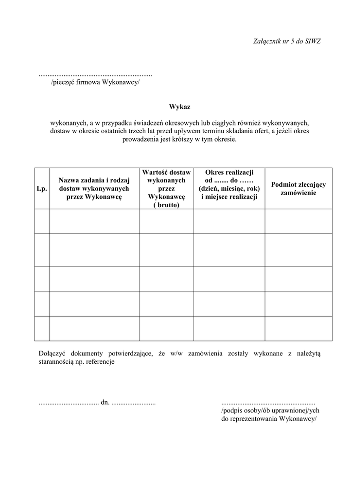 Załącznik nr 5 do SIWZ ................................................................ /pieczęć firmowa Wykonawcy/ Wykaz wykonanych, a w przypadku świadczeń okresowych lub ciągłych również wykonywanych, dostaw w okresie ostatnich trzech lat przed upływem terminu składania ofert, a jeżeli okres prowadzenia jest krótszy w tym okresie. Lp. Nazwa zadania i rodzaj dostaw wykonywanych przez Wykonawcę Wartość dostaw wykonanych przez Wykonawcę ( brutto) Okres realizacji od ........ do …… (dzień, miesiąc, rok) i miejsce realizacji Podmiot zlecający zamówienie Dołączyć dokumenty potwierdzające, że w/w zamówienia zostały wykonane z należytą starannością np. referencje .................................. dn. ......................... ..................................................... /podpis osoby/ób uprawnionej/ych do reprezentowania Wykonawcy/