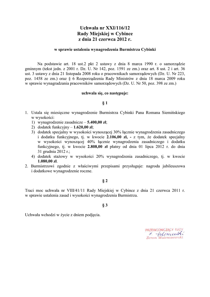 Uchwała nr XXI/116/12 Rady Miejskiej w Cybince z dnia 21 czerwca 2012 r. w sprawie ustalenia wynagrodzenia Burmistrza Cybinki Na podstawie art. 18 ust.2 pkt 2 ustawy z dnia 8 marca 1990 r. o samorządzie gminnym (tekst jedn. z 2001 r. Dz. U. Nr 142, poz. 1591 ze zm.) oraz art. 8 ust. 2 i art. 36 ust. 3 ustawy z dnia 21 listopada 2008 roku o pracownikach samorządowych (Dz. U. Nr 223, poz. 1458 ze zm.) oraz § 6 Rozporządzenia Rady Ministrów z dnia 18 marca 2009 roku w sprawie wynagradzania pracowników samorządowych (Dz. U. Nr 50, poz. 398 ze zm.) uchwala się, co następuje: §1 1. Ustala się miesięczne wynagrodzenie Burmistrza Cybinki Pana Romana Siemińskiego w wysokości: 1) wynagrodzenie zasadnicze – 5.400,00 zł; 2) dodatek funkcyjny – 1.620,00 zł; 3) dodatek specjalny w wysokości wynoszącej 30% łącznie wynagrodzenia zasadniczego i dodatku funkcyjnego, tj. w kwocie 2.106,00 zł, - z tym, że dodatek specjalny w wysokości wynoszącej 40% łącznie wynagrodzenia zasadniczego i dodatku funkcyjnego, tj. w kwocie 2.808,00 zł płatny od dnia 01 lipca 2012 r. do dnia 31 grudnia 2012 r.; 4) dodatek stażowy w wysokości 20% wynagrodzenia zasadniczego, tj. w kwocie 1.080,00 zł. 2. Burmistrzowi zgodnie z właściwymi przepisami przysługuje: nagroda jubileuszowa i dodatkowe wynagrodzenie roczne. §2 Traci moc uchwała nr VIII/41/11 Rady Miejskiej w Cybince z dnia 21 czerwca 2011 r. w sprawie ustalenia zasad i wysokości wynagrodzenia Burmistrza. §3 Uchwała wchodzi w życie z dniem podjęcia. Uzasadnienie do uchwały w sprawie ustalenia wynagrodzenia Burmistrza Cybinki Zgodnie z art. 18 ust. 2 pkt 2 ustawy o samorządzie gminnym do wyłącznej właściwości rady należy ustalenie wynagrodzenia burmistrza. Uchwała zawiera wynagrodzenie Burmistrza na tym samym poziomie jak w roku ubiegłym, dodatek specjalny występuje w wysokości 30% łącznie wynagrodzenia zasadniczego i dodatku funkcyjnego. Zmianie ulega wysokość dodatku specjalnego przyznanego w wysokości 40% łącznie wynagrodzenia zasadniczego i dodatku funkcyjnego wyłącznie na okres od dnia 01.07.2012 r. do dnia 31.12.2012 r. w związku z wnioskiem Komisji Rewizyjnej z dnia 05 czerwca 2012 r., po pozytywnym rozpatrzeniu wykonania budżetu za 2011 r. Zaproponowane wynagrodzenie Burmistrza spełnia wszystkie warunki określone we wskazanych przepisach prawnych tego projektu uchwały. Tak ustalone wynagrodzenie brutto nie przekracza siedmiokrotności kwoty bazowej określonej w ustawie budżetowej na rok 2012 dla osób zajmujących kierownicze stanowiska państwowe na podstawie odrębnych przepisów.