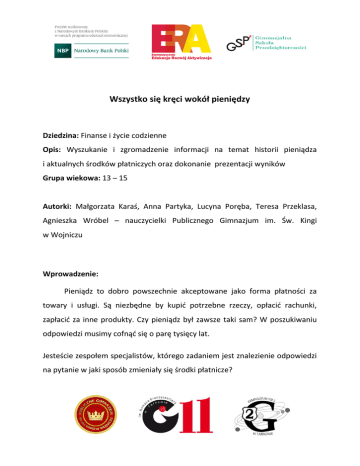 Wszystko się kręci wokół pieniędzy Dziedzina: Finanse i życie codzienne Opis: Wyszukanie i zgromadzenie informacji na temat historii pieniądza i aktualnych środków płatniczych oraz dokonanie prezentacji wyników Grupa wiekowa: 13 – 15 Autorki: Małgorzata Karaś, Anna Partyka, Lucyna Poręba, Teresa Przeklasa, Agnieszka Wróbel – nauczycielki Publicznego Gimnazjum im. Św. Kingi w Wojniczu Wprowadzenie: Pieniądz to dobro powszechnie akceptowane jako forma płatności za towary i usługi. Są niezbędne by kupić potrzebne rzeczy, opłacić rachunki, zapłacić za inne produkty. Czy pieniądz był zawsze taki sam? W poszukiwaniu odpowiedzi musimy cofnąć się o parę tysięcy lat. Jesteście zespołem specjalistów, którego zadaniem jest znalezienie odpowiedzi na pytanie w jaki sposób zmieniały się środki płatnicze? Zadanie: Waszym zadaniem jest opracowanie i przedstawienie historii pieniądza, jakie przybierał formy na świecie i w Polsce na przestrzeni wieków i współcześnie. Zwróćcie uwagę na następujące tematy: - pierwsze środki płatnicze, - banknoty i ich pochodzenie, - monety używane w Polsce, - plastikowe pieniądze, - płatności mobilne. Proces: Będziecie pracować w 10 zespołach 3 osobowych. Ustalcie zasady pracy i komunikacji, dokonajcie wyboru lidera zespołu. Pierwszy etap: 1. Zapoznajcie się ze sposobem handlowania w dawnych czasach. 2. Poszukajcie jak zmieniał się wygląd i kruszec monet. 3. Dlaczego wprowadzono banknoty? 4. Wybierzcie się do banku i dowiedz się jak działają bankomaty i karty płatnicze, co zrobić jak stracimy kartę? 5. Porównajcie możliwości portalów internetowych przelewy24, transferuj, PayU, PayPal Na wykonanie tego etapu macie 10 dni. Drugi etap: Wybierzcie informację i opracujcie je do zaprezentowania. Forma prezentacji: prezentacja PowerPoint, film, komiks. Na wykonanie tego etapu macie 10 dni. Źródła: http://ec.europa.eu/economy_finance/netstartsearch/euro/kids/money_pl.htm www.mojefinanse.junior.org.pl/pl/d/2d7069f5090aee07f9e9f71041796239+&cd=8&hl=pl&ct=clnk&gl=pl http://www.nbp.pl/home.aspx?f=/banknoty_i_monety/monety_okolicznosciowe/serie/historia_mon ety_polskiej.html https://www.nbportal.pl/wiedza/numizmatyka/historia-monet https://www.nbportal.pl/wiedza/numizmatyka/historia-banknotow/historia-banknotow-na-swiecie https://www.nbportal.pl/wiedza/numizmatyka/historia-banknotow http://www.automatykabankowa.pl/fascynujaca-historia-banknotu-od-papierowego-kwitudepozytowego-do/ http://znamswojepieniadze.pl/historia-banknotow_2-4 https://www.nbportal.pl/slownik/pozycje-slownika/pieniadz-elektroniczny bankikredyt.nbp.pl/content/2004/2004_04/fraczek.pdf http://materialyinzynierskie.pl/historia-plastikowych-banknotow-na-swiecie/ http://www.bankier.pl/wiadomosc/Zabezpieczenia-kart-platniczych-467517.html http://www.kartyplatnicze.info/bezpieczenstwo.php http://finansedomowe.net/wszystko-co-musisz-wiedziec-o-kartach-platniczych/ http://metafinanse.pl/bezpieczenstwo-kart-kredytowych-jak-dbac-o-swoje-pieniadze/ http://serwisy.gazetaprawna.pl/poradnik-konsumenta/artykuly/766988,zabezpieczanie-kartyplatniczej.html http://poradnik.wfirma.pl/-konsekwencje-zgubienia-i-kradziezy-karty-platniczej https://ebizneskrokpokroku.pl/sprzedaz/porownanie-platnosci-internetowych/] https://www.grupa-tense.pl/blog/porownanie-systemow-platnosci-online/ http://www.najlepszekonto.pl/platnosci-mobilne http://www.computerworld.pl/news/395376/Rosnie.liczba.zagrozen.aplikacji.mobilnych.html http://www.najlepszekonto.pl/ranking-kont-osobistych Dodatkowe informacje możecie zebrać podczas wyjazdów do banków oraz podczas spotkania z pracodawcą. Ocena: Ilość punktów 1pkt 2pkt 3pkt 4pkt Przyznane punkty Temat w pełni Wybór zrealizowany, Informacje informacji oraz Wybrane odpowiedni wybrane nie są ich informacje są wybór i dobrze adekwatne do uporządkowane, informacji - bez przetwarzanie i ogólne tematu nieliczne błędy porządkowanie błędów merytoryczne merytorycznych Opracowanie Opracowanie Opracowanie Mały wkład Opracowanie bardzo tematu. poprawne, mała pracy przy staranne, przejrzyste, Poprawność i staranność, opracowaniu, ciekawa grafika, staranne, jakość liczne błędy brak grafiki uporządkowane atrakcyjne opracowań uboga grafika wizualnie Prezentacja ciekawa, Prezentacja Ogólne Prezentacja przedstawienie oryginalna, wrażenie Prezentacja poprawna, ale informacji w przedstawiona estetyczne. niestaranna, bez sposób w sposób Przedstawienie mało ciekawa, zaangażowania, uporządkowany, interesujący, tematu i obrona brak odpowiedzi słabe dobra orientacja wyczerpujące swojego na pytania odpowiedzi na w temacie przy odpowiedzi na stanowiska pytania udzielaniu pytania odpowiedzi Świetna Dobra współpraca w Współpraca w Większość pracy organizacja Brak współpracy grupie, dobrze grupie indywidualnej pracy w grupie, przydzielone współdziałanie zadania Informacje szczegółowe Suma: Tytuł punktacja stażysta referent inspektor specjalista 1-4 5-8 9-12 13-16 Konkluzja: Podczas pracy nad projektem zapoznaliście się z różnymi środkami płatniczymi, ich rozwojem. Potraficie wybrać, które są wygodniejsze i bezpieczniejsze w użyciu. Udoskonaliliście umiejętności posługiwania się internetowymi wyszukiwarkami oraz selekcjonowania informacji. Czy wygodniej i korzystniej jest mieć ROR czy „skarpetę”?