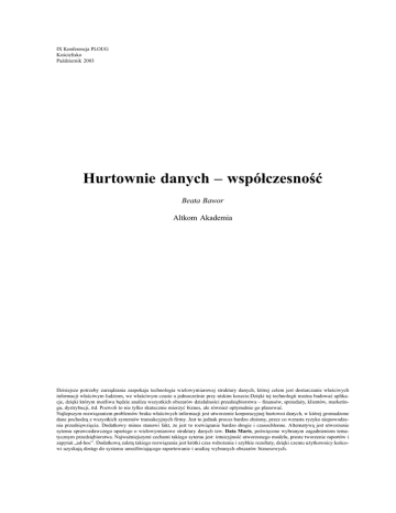 IX Konferencja PLOUG Koœcielisko PaŸdziernik 2003 Hurtownie danych – wspó³czesnoœæ Beata Bawor Altkom Akademia Dzisiejsze potrzeby zarz¹dzania zaspokaja technologia wielowymiarowej struktury danych, której celem jest dostarczanie w³aœciwych informacji w³aœciwym ludziom, we w³aœciwym czasie a jednoczeœnie przy niskim koszcie.Dziêki tej technologii mo¿na budowaæ aplikacje, dziêki którym mo¿liwa bêdzie analiza wszystkich obszarów dzia³alnoœci przedsiêbiorstwa – finansów, sprzeda¿y, klientów, marketingu, dystrybucji, itd. Pozwoli to nie tylko skutecznie mierzyæ biznes, ale równie¿ optymalnie go planowaæ. Najlepszym rozwi¹zaniem problemów braku w³aœciwych informacji jest utworzenie korporacyjnej hurtowni danych, w której gromadzone dane pochodz¹ z wszystkich systemów transakcyjnych firmy. Jest to jednak proces bardzo z³o¿ony, przez co wzrasta ryzyko niepowodzenia przedsiêwziêcia. Dodatkowy minus stanowi fakt, ¿e jest to rozwi¹zanie bardzo drogie i czasoch³onne. Alternatyw¹ jest utworzenie sytemu sprawozdawczego opartego o wielowymiarowe struktury danych tzw. Data Marts, poœwiêcone wybranym zagadnieniom tematycznym przedsiêbiorstwa. Najwa¿niejszymi cechami takiego sytemu jest: intuicyjnoœæ utworzonego modelu, proste tworzenie raportów i zapytañ „ad-hoc”. Dodatkow¹ zalet¹ takiego rozwi¹zania jest krótki czas wdro¿enia i szybkie rezultaty, dziêki czemu u¿ytkownicy koñcowi uzyskuj¹ dostêp do systemu umo¿liwiaj¹cego raportowanie i analizê wybranych obszarów biznesowych. Hurtownie Danych – Współczesność 17 1. Czym jest hurtownia danych i jakie są korzyści z jej wdrożenia W obecnych czasach podstawą działania i konkurencyjności firm jest szybkie reagowanie na zewnętrzne i wewnętrzne czynniki wpływające na sferę ekonomiczną, finansową czy gospodarczą. Nie można tego osiągnąć bez wiarygodnej informacji. Jednak jak wykazuje praktyka czasami nadmiar informacji może być równie niebezpieczny jak jej brak, dlatego ważne jest umiejętne segregowanie zgromadzonych danych, by na ich podstawie można było wyciągać użyteczne wnioski. W każdym wykorzystywanym w przedsiębiorstwie systemie informatycznym mamy możliwość tworzenia różnorodnych raportów. Każdy z tych raportów pozwala wybrać pewne dane transakcyjne według wybranego kryterium i posegregować je według pewnego klucza. Bez względu na to, jak dużo takich raportów istnieje, często zdarza się, że żaden z nich nie zawiera dokładnie tej informacji, którą potrzebujemy. Czasem by uzyskać potrzebne dane należy stworzyć kilka, bądź kilkanaście raportów, często opartych o dane pochodzące z wielu różnych systemów. Zdarza się także, że pewnych informacji w ogóle nie da się uzyskać. Nawet, jeżeli dysponujemy narzędziami wspomagającymi tworzenie raportów, sposób ułożenia danych w bazach systemu czy też systemów, może skutecznie uniemożliwić uzyskanie pożądanych zestawień. Innym istotnym problemem jest taka budowa wzorca, w której dane są zależne od dużego zbioru elementów ich opisujących np. czas, lokalizacja, typy. Bazy relacyjne są bardzo trudne do raportowania w tym kontekście. Jeszcze trudniejsza jest zmiana perspektywy spojrzenia na dane, ponieważ wiąże się to z utworzeniem odrębnych raportów dla każdej z nich. Jeżeli np. chcemy zbadać wartość sprzedaży w zależności od czasu lub lokalizacji, zazwyczaj wiąże się to z utworzeniem dwóch odrębnych raportów. Kolejną trudnością jest analizowanie informacji z raportów. Po wydrukowaniu stu stron zestawienia trudno odnaleźć pozycje, które rzeczywiście nas interesują, np. ze względu na ich wysokie bądź niskie wartości. Jeśli natomiast wydrukujemy zbiorcze zestawienie, musimy generować kolejne raporty, które na większym poziomie szczegółowości ukażą nam składniki pewnej wybranej z raportu syntetycznego pozycji. Generowanie raportów pochłania wiele czasu i obciąża system komputerowy. Problem potęguje się, gdy do uzyskania jednej wartości, konieczne jest utworzenie kilku różnych zestawień. Taka metoda uzyskiwania informacji ma ponadto, inne istotne wady: czas tworzenia raportów jest długi, a używanie danych transakcyjnych jako źródła informacji nie jest efektywne, gdyż nie są one usystematyzowane i “oczyszczone”, czyli pozbawione błędów. Następna kwestia to zarządzanie danymi historycznymi. Systemy transakcyjne zazwyczaj są zaprojektowane do wydajnego przetwarzania niewielkich porcji danych takich jak: wystawienie faktury czy obsługa zamówienia a nie do generowania zbiorczych analiz, poza tym przechowują tylko aktualne informacje o większości obiektów. Dane historyczne przeważnie przechowuje się na oddzielnych nośnikach i nie udostępnia na bieżąco, co utrudnia wykonywanie raportów porównujących aktualne wskaźniki z wartościami z lat ubiegłych. Zdarza się również, że nastąpiła zmiana systemu w przedsiębiorstwie i odczytanie archiwalnych danych jest wręcz niemożliwe. Odpowiedzią na dzisiejsze potrzeby zarządzania jest technologia wielowymiarowej struktury danych, której celem jest wspomaganie zarządzania poprzez dostarczanie właściwych informacji, właściwym ludziom, we właściwym czasie przy niskim koszcie. Technologia ta jest niezależna od platformy sprzętowej, systemu operacyjnego czy bazy danych. Informacje potrzebne do analiz, które mogą pochodzić z wielu różnych systemów informatycznych wykorzystywanych w przedsiębiorstwie są gromadzone w jednym miejscu, dzięki czemu łatwe jest ich utrzymywanie. Zysk z wdrożenia tego typu systemu polega z jednej strony na redukcji kosztu związanych dotychczasowym raportowaniem oraz oszczędności i eliminacja zagrożeń związanych z pełniejszym i szybszym dostępem do informacji. W grupie kosztów możemy wyróżnić: koszty związane z wdrożeniem i koszty eksploatacji. Te pierwsze zwykle są duż