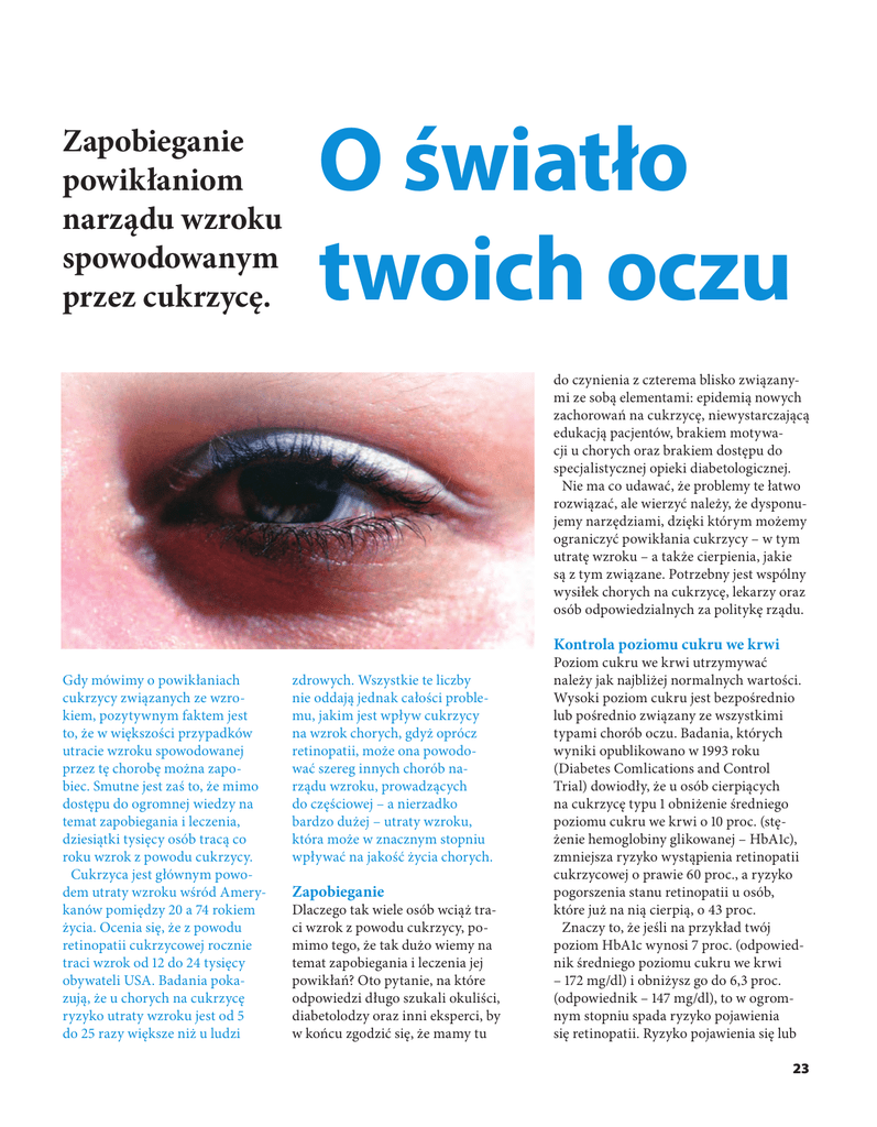 Zapobieganie powikłaniom narządu wzroku spowodowanym przez cukrzycę. O światło twoich oczu do czynienia z czterema blisko związanymi ze sobą elementami: epidemią nowych zachorowań na cukrzycę, niewystarczającą edukacją pacjentów, brakiem motywacji u chorych oraz brakiem dostępu do specjalistycznej opieki diabetologicznej. Nie ma co udawać, że problemy te łatwo rozwiązać, ale wierzyć należy, że dysponujemy narzędziami, dzięki którym możemy ograniczyć powikłania cukrzycy – w tym utratę wzroku – a także cierpienia, jakie są z tym związane. Potrzebny jest wspólny wysiłek chorych na cukrzycę, lekarzy oraz osób odpowiedzialnych za politykę rządu. Kontrola poziomu cukru we krwi Gdy mówimy o powikłaniach cukrzycy związanych ze wzrokiem, pozytywnym faktem jest to, że w większości przypadków utracie wzroku spowodowanej przez tę chorobę można zapobiec. Smutne jest zaś to, że mimo dostępu do ogromnej wiedzy na temat zapobiegania i leczenia, dziesiątki tysięcy osób tracą co roku wzrok z powodu cukrzycy. Cukrzyca jest głównym powodem utraty wzroku wśród Amerykanów pomiędzy 20 a 74 rokiem życia. Ocenia się, że z powodu retinopatii cukrzycowej rocznie traci wzrok od 12 do 24 tysięcy obywateli USA. Badania pokazują, że u chorych na cukrzycę ryzyko utraty wzroku jest od 5 do 25 razy większe niż u ludzi zdrowych. Wszystkie te liczby nie oddają jednak całości problemu, jakim jest wpływ cukrzycy na wzrok chorych, gdyż oprócz retinopatii, może ona powodować szereg innych chorób narządu wzroku, prowadzących do częściowej – a nierzadko bardzo dużej – utraty wzroku, która może w znacznym stopniu wpływać na jakość życia chorych. Zapobieganie Dlaczego tak wiele osób wciąż traci wzrok z powodu cukrzycy, pomimo tego, że tak dużo wiemy na temat zapobiegania i leczenia jej powikłań? Oto pytanie, na które odpowiedzi długo szukali okuliści, diabetolodzy oraz inni eksperci, by w końcu zgodzić się, że mamy tu Poziom cukru we krwi utrzymywać należy jak najbliżej normalnych wartości. Wysoki poziom cukru jest bezpośrednio lub pośrednio związany ze wszystkimi typami chorób oczu. Badania, których wyniki opublikowano w 1993 roku (Diabetes Comlications and Control Trial) dowiodły, że u osób cierpiących na cukrzycę typu 1 obniżenie średniego poziomu cukru we krwi o 10 proc. (stężenie hemoglobiny glikowanej – HbA1c), zmniejsza ryzyko wystąpienia retinopatii cukrzycowej o prawie 60 proc., a ryzyko pogorszenia stanu retinopatii u osób, które już na nią cierpią, o 43 proc. Znaczy to, że jeśli na przykład twój poziom HbA1c wynosi 7 proc. (odpowiednik średniego poziomu cukru we krwi – 172 mg/dl) i obniżysz go do 6,3 proc. (odpowiednik – 147 mg/dl), to w ogromnym stopniu spada ryzyko pojawienia się retinopatii. Ryzyko pojawienia się lub 23 pogorszenia retinopatii zmniejsza się do chwili, aż poziom HbA1c osiągnie 5 proc. (odpowiednik – 101 mg/dl) – w takiej sytuacji to ryzyko jest minimalne. W przypadku chorych na cukrzycę typu 2, utrzymywanie HbA1c na poziomie 6 proc. lub niższym sprawia, że ryzyko powikłań jest niezwykle niskie. Kontrola ciśnienia krwi Ciśnienie krwi kontrolować należy poprzez odpowiednie odżywianie się, regularne ćwiczenia fizyczne, a jeśli trzeba – za pomocą leków. Badania przeprowadzone w Wielkiej Brytanii (United Kingdom Prospective Diabetes Study) dowiodły, że w przypadku osób cierpiących na cukrzycę typu 2 utrzymywanie prawidłowego ciśnienia krwi zmniejsza ryzyko wystąpienia retinopatii bardziej nawet, niż utrzymywanie prawidłowego poziomu cukru we krwi. Zmniejszenie ciśnienia o 10/5 mm Hg (na przykład ze 150/90 mm Hg do 140/85 mm Hg) zmniejsza ryzyko utraty wzroku prawie o 50 proc. (taka sama redukcja ciśnienia zmniejsza ryzyko udaru mózgu o 44 proc., a śmierci o 32 proc.!). Kontrola lipidów we krwi Dowiedz się, jak przedstawia się poziom lipidów w twojej krwi, i poprzez odpowiednią dietę, regularne ćwiczenia fizyczne oraz stosowanie leków staraj się, by poziom ten był jak najbliższy idealnego. Retinopatia cukrzycowa przybiera często dużo gorsze formy, gdy poziom lipidów, przede wszystkim cholesterolu LDL – czyli „złego” cholesterolu – oraz trójglicerydów we krwi daleki jest od normy. Idealny poziom cholesterolu LDL powinien być poniżej 100 mg/dl, trójglicerydów poniżej 150 mg/dl, a cholesterolu HDL (czyli cholesterolu „dobrego”) – powyżej 45 mg/dl u mężczyzn i powyżej 55 mg/dl u kobiet. Palenie Jeśli palisz papierosy – za wszelką cenę postaraj się przestać. Wszyscy wiedzą, że palenie jest niezwykle szkodliwe i nikomu nie trzeba tego tłumaczyć. Jeśli chorujesz 24 na cukrzycę, rzucenie palenia to zdecydowanie najlepsza rzecz, jaką możesz zrobić, by zadbać o swoje oczy (a także serce, płuca, nerki, zęby itd.). Regularne badania dna oka Zadbaj o to, by regularnie, raz do roku przechodzić badanie dna oka u lekarza, który ma doświadczenie z cukrzycą i powikłaniami wzroku, które ta choroba wywołuje. Ocenia się, że od 40 do 50 proc. osób z cukrzycą nie przechodzi corocznych badań dna oka. To ogromna tragedia, bo większości przypadków utraty wzroku spowodowanych przez cukrzycę można by zapobiec dzięki wczesnej diagnozie i odpowiednim leczeniu. Terapia laserowa przeprowadzana w ciężkich przypadkach retinopatii może ograniczyć utratę wzroku w 50–75 proc., a jaskrze zapobiec można przy użyciu leków, terapii laserowej i/lub operacji chirurgicznej. Niestety, zanim pojawią się symptomy cukrzycowych powikłań wzroku, zwykle następują już nieodwracalne zmiany i szansa wyleczenia dramatycznie maleje. Dlatego dla ludzi z cukrzycą tak ważne jest regularne przechodzenie badań dna oka. Należy pamiętać, że wszyscy chorzy – niezależnie od Pierwsze w Polsce testy insuliny w sprayu Dostaje ją dwóch 40-letnich pacjentów z cukrzycą. Eksperyment 