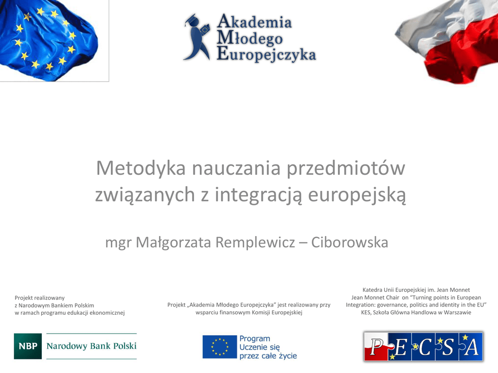 Metodyka nauczania przedmiotów związanych z integracją europejską mgr Małgorzata Remplewicz – Ciborowska Projekt realizowany z Narodowym Bankiem Polskim w ramach programu edukacji ekonomicznej Projekt „Akademia Młodego Europejczyka” jest realizowany przy wsparciu finansowym Komisji Europejskiej Katedra Unii Europejskiej im. Jean Monnet Jean Monnet Chair on “Turning points in European Integration: governance, politics and identity in the EU” KES, Szkoła Główna Handlowa w Warszawie Cel zajęć • • • • • • • • • realizacja założeń Podstawy programowej dla szkół ponadgimnazjalnych w IV etapie edukacyjnym szkoły ponadgimnazjalne kontynuujące zajęcia z zakresu edukacji europejskiej realizowane w gimnazjum, realizacja wybranych zagadnień z innych powiązanych przedmiotów oraz ścieżek edukacyjnych, uwzględniając aspekty : prawny, gospodarczy, społeczny i kulturalny ukazanie materiałów dydaktyczno - ćwiczeniowych jako ogniw procesu wychowania podręcznik jako narzędzie dydaktyczne zarówno dla nauczycieli, jak i uczniów, zwłaszcza tych zdających egzamin maturalny przygotowanie uczniów do korzystania z wszelkich nośników informacyjnych dostosowanie pracy edukacyjnej do zachodzących zmian i postępu naukowo – technicznego kształtowanie umiejętności odróżniania przez uczniów opinii od faktów, grupowanie i stratyfikacja informacji, tworzenie własnych opinii, osądów, wyrażanie własnych poglądów nauczanie wiedzy o społeczeństwie jako wielokierunkowe przygotowanie nauczyciela, korzystanie przez niego z wielu form i metod podawczych 2 Podręcznik będzie obejmował następujące bloki tematyczne : 1. 2. 3. 4. 5. 6. 7. 8. 9. Fundamenty integracji europejskiej. Ustrój Unii Europejskiej. Kultura europejska. Obywatel i obywatelstwo Unii Europejskiej. Podstawy ekonomii Podstawy gospodarki rynkowej. Unia dla młodzieży. Jednolity rynek wewnętrzny. Euro – wspólna waluta . 3 Struktura opisowa każdej z lekcji będzie składała się z określenia : 4 Ogólne cele kształcenia • • • • • • chronologia analiza i interpretacja kształcenie wrażliwości społecznej wykorzystanie i tworzenie informacji rozpoznanie i rozwiązywanie problemów współpraca z innymi tytuł prezentacji, autor 5 Szczegółowe cele kształcenia i wychowania • • • • • • • • uczeń zna podstawy ustrojowe państw wyjaśnia podstawowe pojęcia definiuje pojęcia obywatelskie wyjaśnia zasady obywatelstwa polskiego i unijnego wymienia i zna prawa obywateli UE zna strukturę szkolnictwa w Polsce i na terenie UE wyjaśnia zasady funkcjonowania euro wyjaśnia pojęcia związane z kultura europejską w ujęciu historycznym i współczesnym tytuł prezentacji, autor 6 Postawy i praktyki Celem programu powinno być kształcenie postaw społecznych i obywatelskich uczniów. Uczeń powinien umieć tworzyć więzi ze wspólnotą lokalną, narodową, europejską. Powinien kierować się szacunkiem dla zasad systemów demokratycznych, poprzez poszanowanie praw i obowiązków. Postawy i praktyki Podstawą do poznania tych zasad i postaw powinny być ogólnodostępne dokumenty m.in. Konstytucja RP , fragmenty kodeksów i dokumentów unijnych , podstawowe deklaracje i umowy międzypaństwowe . Uwzględniają to zatwierdzone przez Ministerstwo Edukacji Narodowej dopuszczenia i ich numery do użytku szkolnego programów nauczania oraz dopuszczenia zgodne z podstawą ministerialną podręczników, ćwiczeń i innych pomocy dydaktycznych. Sposoby osiągnięcia celów kształcenia i wychowania • Szczególną uwagę na wstępie należy zwrócić na możliwości indywidualizacji pracy ze względu na predyspozycje uczniów, profile klas objętych programem i umiejętności nauczycieli. • W procesie kształcenia i wychowania w poszczególnych przedmiotach nie ma jednej, najlepszej metody nauczania. Metod jest kilka i nauczyciel musi dokonać właściwego wyboru, tak aby przekazywana wiedza była ciekawa, przystępna, ale także efektywna i angażująca uczniów w proces dydaktyczny. Sposoby osiągnięcia celów kształcenia i wychowania Nauczyciel dobierając właściwą metodę, tak ukierunkowuje proces uczenia, aby umożliwić uczniowi zdobycie umiejętności niezbędnych w życiu codziennym. Ważnymi elementami są : • planowanie i organizacja • umiejętność porozumiewania się i oceniania • porządkowanie i wykorzystanie wiedzy z różnych źródeł • posługiwanie się technologiami informacyjnymi • współpraca w grupie, zespole • twórcze myślenie • rozwijanie inicjatyw własnych. Treści nauczania • Podstawowe treści i metody nauczania zawarte są w rozporządzeniach MEN i wytycznych kuratoryjnych na dany rok szkolny i poziom edukacyjny. Wszystkie te elementy zostały uwzględnione w powyższym podręczniku i są z nimi zgodne. Opierają się na treściach koniecznych i uzupełniających. • Każdy z przedstawionych rozdziałów zawiera elementy znajdujące się w rozporządzeniach MEN. Co więcej, każdy z rozdziałów przedstawia wiedzę szerszą, aniżeli wymagana co pozwoli nauczycielom przygotować zakres lekcji w sposób elastyczny. Podstawowe zagadnienia i pojęcia • Podstawowe pojęcia umieszczone są w każdym rozdziale podręcznika. • Każdy rozdział na początku opisuje dane zagadnienie i wyjaśnia podstawową terminologię. • Terminologia i pojęcia związane są głównie z zagadnieniami funkcjonowania Unii Europejskiej. • Odnoszą się do: ustroju, integracji, kultury, waluty, rynku wewnętrznego i zewnętrznego, szkolnictwa, nauki i zatrudnienia. • Opierają się na głównych dziedzinach życia: społeczno – gospodarczo – polityczno – kulturalnych . Metody pracy • praca w grupach, praca pod kierunkiem, praca z materiałem źródłowym, mapą, diagramem, schematem, wykresem, danymi statystycznymi • burza mózgów, portfolio, projekt • techniki dramowe • mapy mentalne • mapy mental