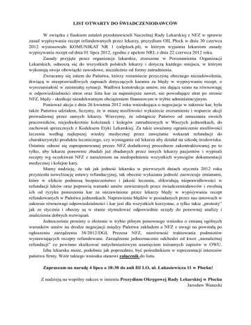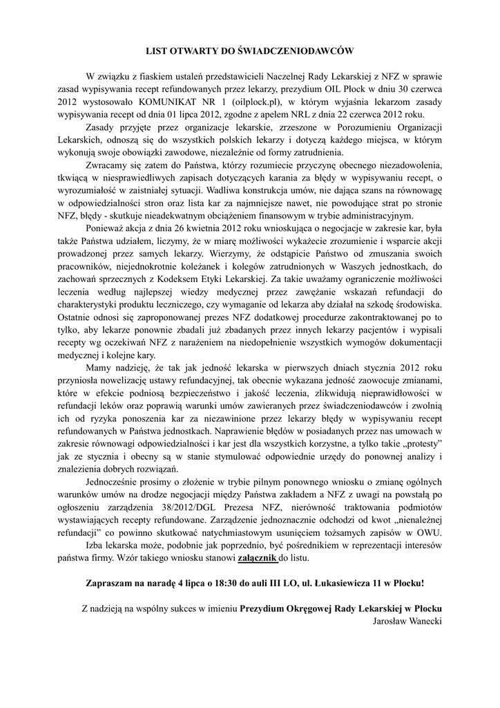 LIST OTWARTY DO ŚWIADCZENIODAWCÓW W związku z fiaskiem ustaleń przedstawicieli Naczelnej Rady Lekarskiej z NFZ w sprawie zasad wypisywania recept refundowanych przez lekarzy, prezydium OIL Płock w dniu 30 czerwca 2012 wystosowało KOMUNIKAT NR 1 (oilplock.pl), w którym wyjaśnia lekarzom zasady wypisywania recept od dnia 01 lipca 2012, zgodne z apelem NRL z dnia 22 czerwca 2012 roku. Zasady przyjęte przez organizacje lekarskie, zrzeszone w Porozumieniu Organizacji Lekarskich, odnoszą się do wszystkich polskich lekarzy i dotyczą każdego miejsca, w którym wykonują swoje obowiązki zawodowe, niezależnie od formy zatrudnienia. Zwracamy się zatem do Państwa, którzy rozumiecie przyczynę obecnego niezadowolenia, tkwiącą w niesprawiedliwych zapisach dotyczących karania za błędy w wypisywaniu recept, o wyrozumiałość w zaistniałej sytuacji. Wadliwa konstrukcja umów, nie dająca szans na równowagę w odpowiedzialności stron oraz lista kar za najmniejsze nawet, nie powodujące strat po stronie NFZ, błędy - skutkuje nieadekwatnym obciążeniem finansowym w trybie administracyjnym. Ponieważ akcja z dnia 26 kwietnia 2012 roku wnioskująca o negocjacje w zakresie kar, była także Państwa udziałem, liczymy, że w miarę możliwości wykażecie zrozumienie i wsparcie akcji prowadzonej przez samych lekarzy. Wierzymy, że odstąpicie Państwo od zmuszania swoich pracowników, niejednokrotnie koleżanek i kolegów zatrudnionych w Waszych jednostkach, do zachowań sprzecznych z Kodeksem Etyki Lekarskiej. Za takie uważamy ograniczenie możliwości leczenia według najlepszej wiedzy medycznej przez zawężanie wskazań refundacji do charakterystyki produktu leczniczego, czy wymaganie od lekarza aby działał na szkodę środowiska. Ostatnie odnosi się zaproponowanej prezes NFZ dodatkowej procedurze zakontraktowanej po to tylko, aby lekarze ponownie zbadali już zbadanych przez innych lekarzy pacjentów i wypisali recepty wg oczekiwań NFZ z narażeniem na niedopełnienie wszystkich wymogów dokumentacji medycznej i kolejne kary. Mamy nadzieję, że tak jak jedność lekarska w pierwszych dniach stycznia 2012 roku przyniosła nowelizację ustawy refundacyjnej, tak obecnie wykazana jedność zaowocuje zmianami, które w efekcie podniosą bezpieczeństwo i jakość leczenia, zlikwidują nieprawidłowości w refundacji leków oraz poprawią warunki umów zawieranych przez świadczeniodawców i zwolnią ich od ryzyka ponoszenia kar za niezawinione przez lekarzy błędy w wypisywaniu recept refundowanych w Państwa jednostkach. Naprawienie błędów w posiadanych przez nas umowach w zakresie równowagi odpowiedzialności i kar jest dla wszystkich korzystne, a tylko takie „protesty” jak ze stycznia i obecny są w stanie stymulować odpowiednie urzędy do ponownej analizy i znalezienia dobrych rozwiązań. Jednocześnie prosimy o złożenie w trybie pilnym ponownego wniosku o zmianę ogólnych warunków umów na drodze negocjacji między Państwa zakładem a NFZ z uwagi na powstałą po ogłoszeniu zarządzenia 38/2012/DGL Prezesa NFZ, nierówność traktowania podmiotów wystawiających recepty refundowane. Zarządzenie jednoznacznie odchodzi od kwot „nienależnej refundacji” co powinno skutkować natychmiastowym usunięciem tożsamych zapisów w OWU. Izba lekarska może, podobnie jak poprzednio, być pośrednikiem w reprezentacji interesów państwa firmy. Wzór takiego wniosku stanowi załącznik do listu. Zapraszam na naradę 4 lipca o 18:30 do auli III LO, ul. Łukasiewicza 11 w Płocku! Z nadzieją na wspólny sukces w imieniu Prezydium Okręgowej Rady Lekarskiej w Płocku Jarosław Wanecki