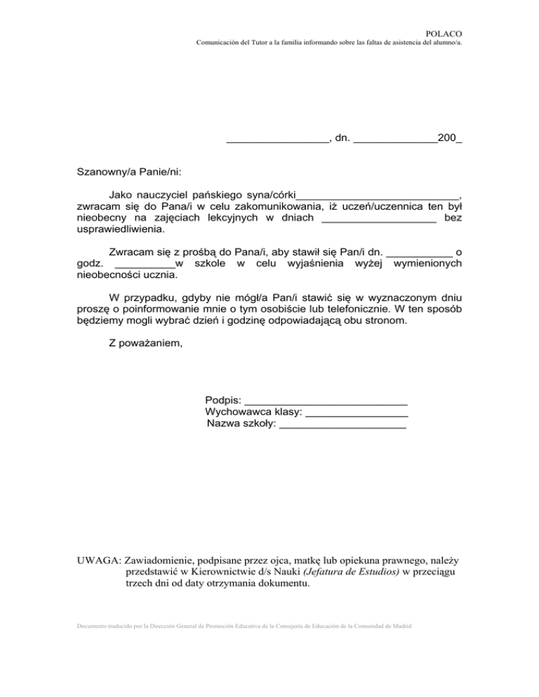 POLACO Comunicación del Tutor a la familia informando sobre las faltas de asistencia del alumno/a. _________________, dn. ______________200_ Szanowny/a Panie/ni: Jako nauczyciel pańskiego syna/córki___________________________, zwracam się do Pana/i w celu zakomunikowania, iż uczeń/uczennica ten był nieobecny na zajęciach lekcyjnych w dniach ___________________ bez usprawiedliwienia. Zwracam się z prośbą do Pana/i, aby stawił się Pan/i dn. ___________ o godz. __________w szkole w celu wyjaśnienia wyżej wymienionych nieobecności ucznia. W przypadku, gdyby nie mógł/a Pan/i stawić się w wyznaczonym dniu proszę o poinformowanie mnie o tym osobiście lub telefonicznie. W ten sposób będziemy mogli wybrać dzień i godzinę odpowiadającą obu stronom. Z poważaniem, Podpis: ___________________________ Wychowawca klasy: _________________ Nazwa szkoły: _____________________ UWAGA: Zawiadomienie, podpisane przez ojca, matkę lub opiekuna prawnego, należy przedstawić w Kierownictwie d/s Nauki (Jefatura de Estudios) w przeciągu trzech dni od daty otrzymania dokumentu. Documento traducido por la Dirección General de Promoción Educativa de la Consejería de Educación de la Comunidad de Madrid