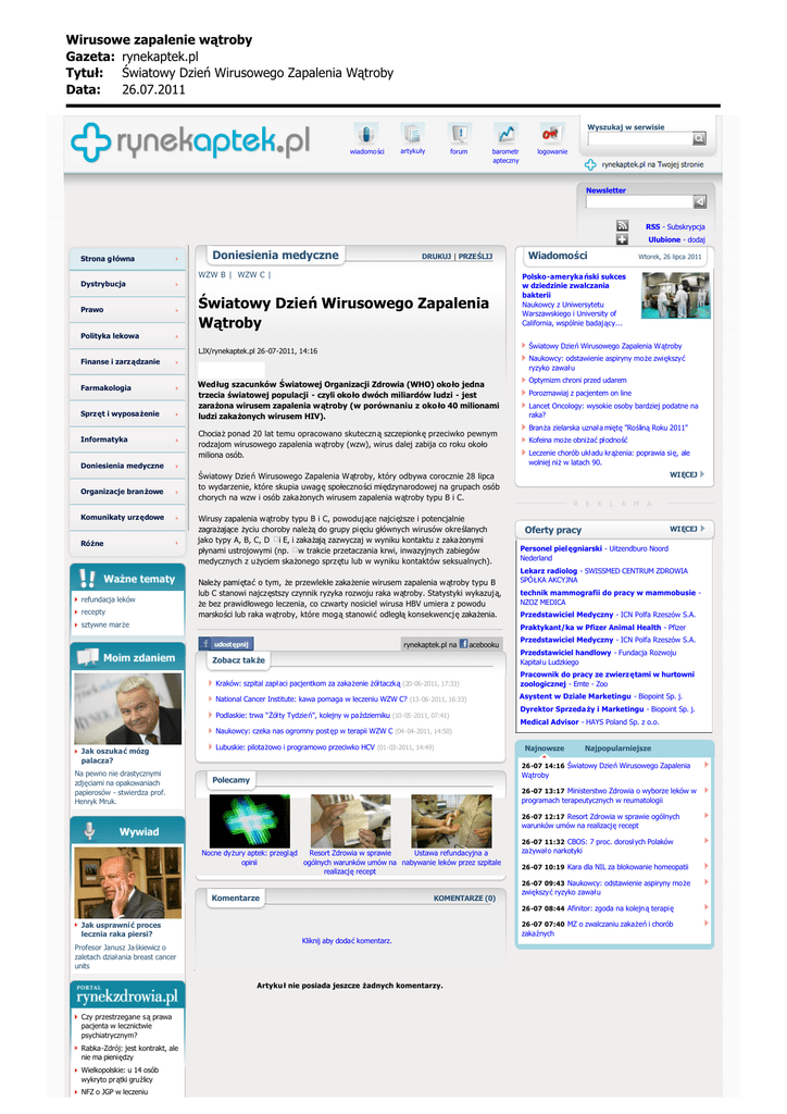 Wirusowe zapalenie w¹troby Gazeta: rynekaptek.pl Tytu³: wiatowy Dzieñ Wirusowego Zapalenia W¹troby Data: 26.07.2011 Wyszukaj w serwisie wiadomo ści artykuły forum barometr apteczny logowanie Newsletter RSS - Subskrypcja Ulubione - dodaj Doniesienia medyczne Strona główna Wiadomości DRUKUJ | PRZEŚLIJ WZW B | WZW C | Polsko-ameryka ński sukces w dziedzinie zwalczania bakterii Naukowcy z Uniwersytetu Warszawskiego i University of California, wspólnie badający... Dystrybucja Prawo Światowy Dzień Wirusowego Zapalenia Wątroby Polityka lekowa Światowy Dzień Wirusowego Zapalenia Wątroby LJX/rynekaptek.pl 26-07-2011, 14:16 Naukowcy: odstawienie aspiryny może zwiększyć ryzyko zawału Finanse i zarządzanie Farmakologia Sprzęt i wyposażenie Informatyka Optymizm chroni przed udarem Według szacunków Światowej Organizacji Zdrowia (WHO) około jedna trzecia światowej populacji - czyli około dwóch miliardów ludzi - jest zarażona wirusem zapalenia wątroby (w porównaniu z około 40 milionami ludzi zakażonych wirusem HIV). Porozmawiaj z pacjentem on line Lancet Oncology: wysokie osoby bardziej podatne na raka? Branża zielarska uznała miętę "Rośliną Roku 2011" Chociaż ponad 20 lat temu opracowano skuteczn ą szczepionkę przeciwko pewnym rodzajom wirusowego zapalenia wątroby (wzw), wirus dalej zabija co roku około miliona osób. Kofeina może obniżać płodność Leczenie chorób układu krążenia: poprawia się, ale wolniej niż w latach 90. Doniesienia medyczne Organizacje branżowe Komunikaty urzędowe Światowy Dzień Wirusowego Zapalenia Wątroby, który odbywa corocznie 28 lipca to wydarzenie, które skupia uwag ę społeczności międzynarodowej na grupach osób chorych na wzw i osób zakażonych wirusem zapalenia wątroby typu B i C. Różne Wirusy zapalenia wątroby typu B i C, powoduj ące najcięższe i potencjalnie zagrażające życiu choroby należą do grupy pięciu głównych wirusów okre ślanych jako typy A, B, C, D i E, i zakażają zazwyczaj w wyniku kontaktu z zaka żonymi płynami ustrojowymi (np. w trakcie przetaczania krwi, inwazyjnych zabiegów medycznych z użyciem skażonego sprzętu lub w wyniku kontaktów seksualnych). refundacja leków Należy pamiętać o tym, że przewlekłe zakażenie wirusem zapalenia wątroby typu B lub C stanowi najczęstszy czynnik ryzyka rozwoju raka wątroby. Statystyki wykazują, że bez prawidłowego leczenia, co czwarty nosiciel wirusa HBV umiera z powodu marskości lub raka wątroby, które mog ą stanowić odległą konsekwencj ę zakażenia. recepty Wtorek, 26 lipca 2011 WIĘCEJ R E K L A M A WIĘCEJ Oferty pracy Personel pielęgniarski - Uitzendburo Noord Nederland Lekarz radiolog - SWISSMED CENTRUM ZDROWIA SPÓŁKA AKCYJNA technik mammografii do pracy w mammobusie NZOZ MEDICA Przedstawiciel Medyczny - ICN Polfa Rzeszów S.A. sztywne marże Praktykant/ka w Pfizer Animal Health - Pfizer udostępnij rynekaptek.pl na Przedstawiciel Medyczny - ICN Polfa Rzeszów S.A. acebooku Przedstawiciel handlowy - Fundacja Rozwoju Kapitału Ludzkiego Zobacz także Kraków: szpital zapłaci pacjentkom za zakażenie żółtaczką (20-06-2011, 17:33) Pracownik do pracy ze zwierzętami w hurtowni zoologicznej - Emte - Zoo National Cancer Institute: kawa pomaga w leczeniu WZW C? (13-06-2011, 16:33) Asystent w Dziale Marketingu - Biopoint Sp. j. Dyrektor Sprzeda ży i Marketingu - Biopoint Sp. j. Podlaskie: trwa "Żółty Tydzień", kolejny w październiku (10-05-2011, 07:41) Medical Advisor - HAYS Poland Sp. z o.o. Naukowcy: czeka nas ogromny postęp w terapii WZW C (04-04-2011, 14:50) Jak oszuka ć mózg palacza? Na pewno nie drastycznymi zdjęciami na opakowaniach papierosów - stwierdza prof. Henryk Mruk. Lubuskie: pilotażowo i programowo przeciwko HCV (01-03-2011, 14:49) Najnowsze Najpopularniejsze 26 -07 14:16 Światowy Dzień Wirusowego Zapalenia Wątroby Polecamy 26 -07 13:17 Ministerstwo Zdrowia o wyborze leków w programach terapeutycznych w reumatologii 26 -07 12:17 Resort Zdrowia w sprawie ogólnych warunków umów na realizację recept 26 -07 11:32 CBOS: 7 proc. dorosłych Polaków zażywało narkotyki Nocne dyżury aptek: przegląd Resort Zdrowia w sprawie Ustawa refundacyjna a opinii ogólnych warunków umów na nabywanie leków przez szpitale realizację recept 26 -07 10:19 Kara dla NIL za blokowanie homeopatii 26 -07 09:43 Naukowcy: odstawienie aspiryny może Komentarze zwiększyć ryzyko zawału KOMENTARZE (0) 26 -07 08:44 Afinitor: zgoda na kolejną terapię Jak usprawnić proces lecznia raka piersi? Profesor Janusz Jaśkiewicz o zaletach działania breast cancer units 26 -07 07:40 MZ o zwalczaniu zakażeń i chorób zakaźnych Kliknij aby dodać komentarz. Artyku ł nie posiada jeszcze żadnych komentarzy. Czy przestrzegane są prawa pacjenta w lecznictwie psychiatrycznym? Rabka-Zdrój: jest kontrakt, ale nie ma pieniędzy Wielkopolskie: u 14 osób wykryto prątki gruźlicy NFZ o JGP w leczeniu szpitalnym Artyku ł nie posiada jeszcze żadnych komentarzy. Czy przestrzegane są prawa Wirusowe zapalenie w¹troby pacjenta w lecznictwie psychiatrycznym? Gazeta: rynekaptek.pl Rabka-Zdrój: jest kontrakt, ale Tytu³: wiatowy Dzieñ Wirusowego Zapalenia W¹troby nie ma pieniędzy Wielkopolskie: u 14 osób Data: 26.07.2011 wykryto prątki gruźlicy NFZ o JGP w leczeniu szpitalnym MZ w sprawie specjalizacji lekarzy i lekarzy dentystów • Strona główna • Aktualności • Dystrybucja • Prawo • Polityka lekowa • Finanse i zarządzanie • Farmakologia • Forum • Reklama • Kontakt • • Partnerzy • Miesięcznik Rynek Zdrowia • Praca • Regulamin • rynekaptek.pl na Twojej stronie • RSS • Wydawca Portalu: PTWP-ONLINE Sp. z o.o. Odwiedź nasze portale i wydawnictwa: