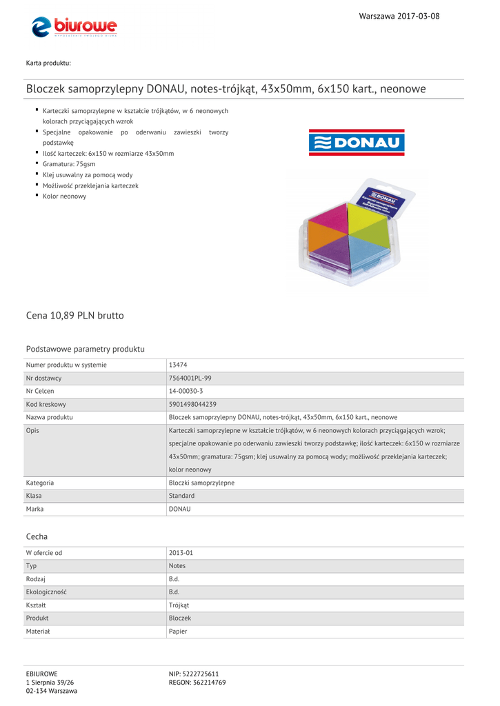 Warszawa 2017-03-08 Karta produktu: Bloczek samoprzylepny DONAU, notes-trójkąt, 43x50mm, 6x150 kart., neonowe Karteczki samoprzylepne w kształcie trójkątów, w 6 neonowych kolorach przyciągających wzrok Specjalne opakowanie po oderwaniu zawieszki tworzy podstawkę Ilość karteczek: 6x150 w rozmiarze 43x50mm Gramatura: 75gsm Klej usuwalny za pomocą wody Możliwość przeklejania karteczek Kolor neonowy Cena 10,89 PLN brutto Podstawowe parametry produktu Numer produktu w systemie 13474 Nr dostawcy 7564001PL-99 Nr Celcen 14-00030-3 Kod kreskowy 5901498044239 Nazwa produktu Bloczek samoprzylepny DONAU, notes-trójkąt, 43x50mm, 6x150 kart., neonowe Opis Karteczki samoprzylepne w kształcie trójkątów, w 6 neonowych kolorach przyciągających wzrok; specjalne opakowanie po oderwaniu zawieszki tworzy podstawkę; ilość karteczek: 6x150 w rozmiarze 43x50mm; gramatura: 75gsm; klej usuwalny za pomocą wody; możliwość przeklejania karteczek; kolor neonowy Kategoria Bloczki samoprzylepne Klasa Standard Marka DONAU Cecha W ofercie od 2013-01 Typ Notes Rodzaj B.d. Ekologiczność B.d. Kształt Trójkąt Produkt Bloczek Materiał Papier EBIUROWE 1 Sierpnia 39/26 02-134 Warszawa NIP: 5222725611 REGON: 362214769 Warszawa 2017-03-08 Karta katalogowa produktu cd. Bloczek samoprzylepny DONAU, notes-trójkąt, 43x50mm, 6x150 kart., neonowe Ilość Ilość kartek 6x150 Wymiary Pojemność (mm) B.d. Rozmiar B.d. Szerokość (mm) B.d. Grubość (mm) B.d. Wymiary (mm) 43x50 Gramatura (g/m2) 75 Wspólny słownik zamówień CPV 22816300-6 Bloczki samoprzylepnych karteczek na notatki Certyfikaty Nowy produkt w ofercie Standard Hit Standard Kolor Kolor Mix kolorów Serdecznie zapraszamy do współpracy EBIUROWE zespół. EBIUROWE 1 Sierpnia 39/26 02-134 Warszawa NIP: 5222725611 REGON: 362214769