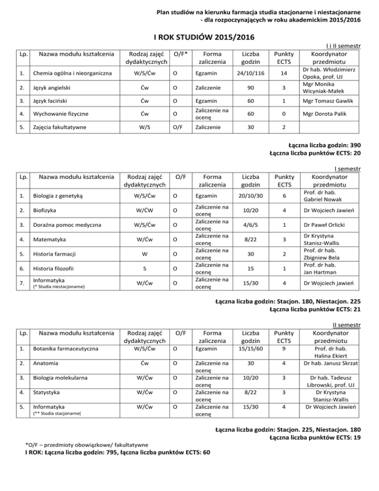 Plan studiów na kierunku farmacja studia stacjonarne i niestacjonarne - dla rozpoczynających w roku akademickim 2015/2016 I ROK STUDIÓW 2015/2016 Lp. Nazwa modułu kształcenia 1. Chemia ogólna i nieorganiczna 2. Rodzaj zajęd O/F* dydaktycznych Forma zaliczenia Liczba godzin Punkty ECTS I i II semestr Koordynator przedmiotu Dr hab. Włodzimierz Opoka, prof. UJ Mgr Monika Wicyniak-Małek W/S/Dw O Egzamin 24/10/116 14 Język angielski Dw O Zaliczenie 90 3 3. Język łacioski Dw O Egzamin 60 1 Mgr Tomasz Gawlik 4. Wychowanie fizyczne Dw O Zaliczenie na ocenę 60 0 Mgr Dorota Palik 5. Zajęcia fakultatywne W/S O/F Zaliczenie 30 2 Łączna liczba godzin: 390 Łączna liczba punktów ECTS: 20 Lp. Nazwa modułu kształcenia 1. Biologia z genetyką 2. Biofizyka 3. Doraźna pomoc medyczna 4. Matematyka 5. Rodzaj zajęd dydaktycznych O/F W/S/Dw O W/DW O W/S/Dw O W/Dw O Historia farmacji W O 6. Historia filozofii S O 7. Informatyka W/Dw O (* Studia niestacjonarne) Forma zaliczenia Egzamin Zaliczenie na ocenę Zaliczenie na ocenę Zaliczenie na ocenę Zaliczenie na ocenę Zaliczenie na ocenę Zaliczenie na ocenę I semestr Koordynator przedmiotu Liczba godzin Punkty ECTS 20/10/30 6 Prof. dr hab. Gabriel Nowak 10/20 4 Dr Wojciech Jawieo 4/6/5 1 Dr Paweł Orlicki 8/22 3 30 2 15 1 15/30 4 Dr Krystyna Stanisz-Wallis Prof. dr hab. Zbigniew Bela Prof. dr hab. Jan Hartman Dr Wojciech jawieo Łączna liczba godzin: Stacjon. 180, Niestacjon. 225 Łączna liczba punktów ECTS: 21 Lp. Nazwa modułu kształcenia 1. Botanika farmaceutyczna 2. Anatomia 3. Rodzaj zajęd dydaktycznych O/F Forma zaliczenia W/S/Dw O Egzamin Dw O Biologia molekularna W/Dw O 4. Statystyka W/Dw O 5. Informatyka W/Dw O Zaliczenie na ocenę Zaliczenie na ocenę Zaliczenie na ocenę Zaliczenie na ocenę (** Studia stacjonarne( Liczba godzin Punkty ECTS 15/15/60 9 30 4 10/20 3 8/22 3 15/30 4 II semestr Koordynator przedmiotu Prof. dr hab. Halina Ekiert Dr hab. Janusz Skrzat Dr hab. Tadeusz Librowski, prof. UJ Dr Krystyna Stanisz-Wallis Dr Wojciech Jawieo Łączna liczba godzin: Stacjon. 225, Niestacjon. 180 Łączna liczba punktów ECTS: 19 *O/F – przedmioty obowiązkowe/ fakultatywne I ROK: Łączna liczba godzin: 795, łączna liczba punktów ECTS: 60 Plan studiów na kierunku farmacja studia stacjonarne i niestacjonarne - dla rozpoczynających w roku akademickim 2015/2016 II ROK STUDIÓW 2016/2017 III i IV semestr Lp. Nazwa modułu kształcenia Rodzaj zajęd dydaktycznych O/F* Forma zaliczenia Liczba godzin Punkty ECTS 1. Chemia analityczna W/S/Dw O Egzamin 45/15/120 12 2. Chemia organiczna W/S/Dw O Egzamin 30/69/111 13 3. Farmacja fizyczna W/S/Dw O Egzamin 30/30/45 10 4. Fizjologia W/S/Dw O Egzamin 45/15/30 7 5. Język angielski Dw O Egzamin 90 3 6. Zajęcia fakultatywne W/S F Zaliczenie 60 4 Koordynator przedmiotu Dr hab. Urszula Hubicka Prof. dr hab. Marek Cegła Dr hab. Elżbieta Wyska, prof. UJ Prof. dr hab. Tomasz Brzozowski Mgr Monika Wicyniak-Małek Łączna liczba godzin: 705 Łączna liczba punktów ECTS: 49 III semestr Lp. Nazwa modułu kształcenia 1. Mikrobiologia 2. Prawo autorskie i własnośd intelektualna Rodzaj zajęd dydaktycznych O/F Forma zaliczenia Liczba godzin Punkty ECTS Koordynator przedmiotu W/S/Dw O Egzamin 30/10/65 7 Prof. dr hab. Alicja Budak W O Zaliczenie 15 1 Dr Krzysztof Felcher Łączna liczba godzin: 120 Łączna liczba punktów ECTS: 8 IV semestr Lp. 1. Nazwa modułu kształcenia Immunologia Rodzaj zajęd dydaktycznych W/S/Dw O/F O Forma zaliczenia Liczba godzin Punkty ECTS Zaliczenie na ocenę 8/4/18 3 Koordynator przedmiotu Prof. dr hab. Janusz Marcinkiewicz Łączna liczba godzin: 30 Łączna liczba punktów ECTS: 3 *O/F – przedmioty obowiązkowe/ fakultatywne II ROK: Łączna liczba godzin: 855, łączna liczba punktów ECTS: 60 Plan studiów na kierunku farmacja studia stacjonarne i niestacjonarne - dla rozpoczynających w roku akademickim 2015/2016 III ROK STUDIÓW 2017/2018 V i VI semestr Lp. Nazwa modułu kształcenia Rodzaj zajęd dydaktycznych O/F* Forma zaliczenia Liczba godzin Punkty ECTS 1. Farmakognozja W/S/Dw O Egzamin 45/15/90 11 2. Chemia leków W/S/Dw O Egzamin 75/15/165 15 3. Patofizjologia W/S/Dw O Egzamin 29/30/16 6 4. Zajęcia fakultatywne W/S F Zaliczenie 75 5 Koordynator przedmiotu Prof. dr hab. Zbigniew Janeczko Prof. dr hab. Maciej Pawłowski Dr hab. Krzysztof Gil Łączna liczba godzin: 555 Łączna liczba punktów ECTS: 37 V semestr Lp. Nazwa modułu kształcenia 1. Biochemia 2. Psychologia z socjologią Rodzaj zajęd dydaktycznych O/F Forma zaliczenia W/S/Dw O Egzamin W/S O Zaliczenie na ocenę Liczba godzin Punkty ECTS 46/14/45 8 4/11 1 Koordynator przedmiotu Dr hab. Elżbieta Pękala, prof. UJ Dr Anna Kopczyoska-Tyszko Łączna liczba godzin: 120 Łączna liczba punktów ECTS: 9 VI semestr Lp. Nazwa modułu kształcenia Rodzaj zajęd dydaktycznych O/F Forma zaliczenia Liczba godzin Punkty ECTS 1. Farmakokinetyka W/Dw O Egzamin 15/30 3 2. Technologia postaci leku I W/Dw O Zaliczenie na ocenę 28/92 6 3. Miesięczna praktyka w aptece ogólnodostępnej w okresie wakacji Dw O Zaliczenie 160 5 Koordynator przedmiotu Dr hab. Elżbieta Wyska, prof. UJ Prof. dr hab. Renata Jachowicz Prof. dr hab. Renata Jachowicz Łączna liczba godzin: 325 Łączna liczba punktów ECTS: 14 *O/F – przedmioty obowiązkowe/ fakultatywne III ROK: Łączna liczba godzin: 1000, łączna liczba punktów ECTS: 60 Plan studiów na kierunku farmacja studia stacjonarne i niestacjonarne - dla rozpoczynających w roku akademickim 2015/2016 IV ROK STUDIÓW 2018/2019 VII i VIII semestr Lp. Nazwa modułu kształcenia Rodzaj zajęd dydaktycznych O/F* Forma zaliczenia Liczba godzin Punkty ECTS 1. Toksykologia W/S/Dw O Egzamin 15/30/45 7 2. Farmakologia z farmakodynamiką W/S/Dw O Egzamin 75/75/90 15 3. Zajęcia fakultatywne W/S F Zaliczenie 75 5 Koordynator przedmiotu Dr hab. Maria Walczak Prof. dr hab. Barbara Filipek Łączna liczba godzin: 165 Łączna liczba punktów ECTS: 27 VII semestr Lp. Nazwa