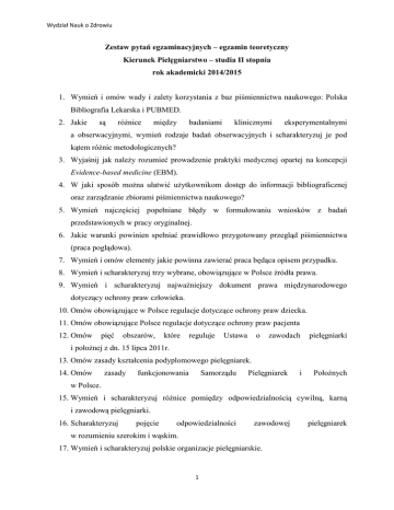 Wydział Nauk o Zdrowiu Zestaw pytań egzaminacyjnych – egzamin teoretyczny Kierunek Pielęgniarstwo – studia II stopnia rok akademicki 2014/2015 1. Wymień i omów wady i zalety korzystania z baz piśmiennictwa naukowego: Polska Bibliografia Lekarska i PUBMED. 2. Jakie są różnice między badaniami klinicznymi eksperymentalnymi a obserwacyjnymi, wymień rodzaje badań obserwacyjnych i scharakteryzuj je pod kątem różnic metodologicznych? 3. Wyjaśnij jak należy rozumieć prowadzenie praktyki medycznej opartej na koncepcji Evidence-based medicine (EBM). 4. W jaki sposób można ułatwić użytkownikom dostęp do informacji bibliograficznej oraz zarządzanie zbiorami piśmiennictwa naukowego? 5. Wymień najczęściej popełniane błędy w formułowaniu wniosków z badań przedstawionych w pracy oryginalnej. 6. Jakie warunki powinien spełniać prawidłowo przygotowany przegląd piśmiennictwa (praca poglądowa). 7. Wymień i omów elementy jakie powinna zawierać praca będąca opisem przypadku. 8. Wymień i scharakteryzuj trzy wybrane, obowiązujące w Polsce źródła prawa. 9. Wymień i scharakteryzuj najważniejszy dokument prawa międzynarodowego dotyczący ochrony praw człowieka. 10. Omów obowiązujące w Polsce regulacje dotyczące ochrony praw dziecka. 11. Omów obowiązujące Polsce regulacje dotyczące ochrony praw pacjenta 12. Omów pięć obszarów, które reguluje Ustawa o zawodach pielęgniarki i położnej z dn. 15 lipca 2011r. 13. Omów zasady kształcenia podyplomowego pielęgniarek. 14. Omów zasady funkcjonowania Samorządu Pielęgniarek i Położnych w Polsce. 15. Wymień i scharakteryzuj różnice pomiędzy odpowiedzialnością cywilną, karną i zawodową pielęgniarki. 16. Scharakteryzuj pojęcie odpowiedzialności zawodowej w rozumieniu szerokim i wąskim. 17. Wymień i scharakteryzuj polskie organizacje pielęgniarskie. 1 pielęgniarek Wydział Nauk o Zdrowiu 18. Podaj wskazania i przeciwwskazania, które należy uwzględnić przy przeszczepianiu narządów. 19. Jakie dokumenty regulują zagadnienia kształcenia podyplomowego pielęgniarek i położnych. 20. Podaj cele Międzynarodowej Rady Pielęgniarek. 21. Podaj z czego wynika obowiązek prowadzenia Krajowych Ośrodków Informacyjnych dla pielęgniarek zainteresowanych podejmowaniem pracy w krajach Unii Europejskiej. 22. Podaj nazwę polskiej organizacji pielęgniarskiej, która jako pierwsza została przyjęta do Międzynarodowej Rady Pielęgniarek. 23. Wymień kluczowe zadania Międzynarodowej Rady Pielęgniarek (ICN). 24. Podaj co osoba, która chciałaby uzyskać prawo wykonywania zawodu pielęgniarki w Polsce w 2013 r. powinna posiadać. 25. Podaj znaczenie dla pielęgniarstwa Europejskiego Porozumienia sporządzonego w Strasburgu w 1967r. 26. Wymień co najmniej trzy znane Ci pielęgniarskie czasopisma naukowe. 27. Kto i kiedy wydaje Prawo Wykonywania Zawodu Pielęgniarki/Pielęgniarza? 28. Wymień powikłania późne cukrzycy. Scharakteryzuj jedno z nich. 29. Wymień powikłania ostre cukrzycy. Omów jedno z nich. 30. Scharakteryzuj atak astmy oskrzelowej. Przedstaw zadania pielęgniarki. 31. Omów główne działania edukacyjne u pacjentów z nadciśnieniem tętniczym. 32. Przedstaw cel koronarografii oraz rolę pielęgniarki w opiece nad chorym przed i po badaniu. 33. Scharakteryzuj ,,ból wieńcowy”, przedstaw plan postępowania. 34. Omów zasady obowiązujące w pielęgnacji chorego z założonym wkłuciem obwodowym. 35. Wymień znane Ci formy kontroli stosowane w oddziale szpitalnym. 36. Wymień przynajmniej trzy korzyści wynikające ze stosowania metod aktywizujących w procesie nauczania. 37. Podaj szczegółowe cele kształcenia w dziedzinie wiedzy do tematu cewnikowanie pęcherza moczowego. 38. Podaj efekt kształcenia w zakresie kompetencji społecznych będący na najwyższym poziomie taksonomicznym wg B. Blooma. 39. Wymień metody oparte na działalności praktycznej i omów jedną z nich. 2 Wydział Nauk o Zdrowiu 40. Wymień środki dydaktyczne, które można zastosować podczas zajęć teoretycznych i praktycznych. 41. Podaj cele ogólne i szczegółowe do tematu: Wykonanie wstrzyknięcia domięśniowego. 42. Podaj określenie hospitacji, etapy oraz jej przebieg. 43. Wyjaśnij co rozumiesz pod pojęciem ewaluacja, omów rodzaje ewaluacji. 44. Wymień podstawowe kanony pielęgniarstwa wg. F. Nightingale i opisz dwa dowolnie wybrane. 45. Wymień cechy charakteryzujące pielęgniarstwo jako dyscyplinę naukową XXI w. 46. Scharakteryzuj teorie pielęgnowania uwzględniające zaspakajanie potrzeb bytowych człowieka. 47. Wyjaśnij naukowa podstawę działań pielęgniarskich we współczesnych teoriach pielęgnowania. 48. Scharakteryzuj teorię pielęgnowania C. Roy, ze zwróceniem uwagi na integrację człowieka ze środowiskiem. 49. Scharakteryzuj teorię pielęgnowania C. Roy, omów etapy procesu pielęgnowania, wskaż cel pielęgnowania i zastosowanie teorii. 50. Scharakteryzuj teorię pielęgnowania H. Peplau ze zwróceniem szczególnej uwagi na role pielęgniarki. 51. Omów rolę pielęgniarki w teorii pielęgnowania D. Orem, wyjaśnij co było podstawą, z której D. Orem wyprowadziła teorię samoopieki? 52. Scharakteryzuj systemową teorię pielęgnowania B. Neuman, wyjaśnij w jakiej dziedzinie pielęgniarstwa będzie miała zastosowanie? 53. Scharakteryzuj teorię pielęgnowania M. Rogers, zwróć uwagę na zadania i cele pielęgnowania. 54. Scharakteryzuj teorię pielęgnowania V. Henderson, zwróć szczególną uwagę na podział potrzeb i ich wpływ na zdrowie człowieka. 55. Scharakteryzuj teorię pielęgnowania V. Henderson, zwróć szczególną uwagę na zadania dla pielęgniarki, wyjaśnij czym jest pielęgniarstwo dla autorki tej koncepcji pielęgnowania. 56. Podaj jaki jest obraz kliniczny zaburzeń ze strony zwieraczy u chorego po uszkodzeniu rdzenia kręgowego? 57. Przedstaw zasady pielęgnowania chorego z rurką tracheotomijną. 58. Co jest charakterystyczn