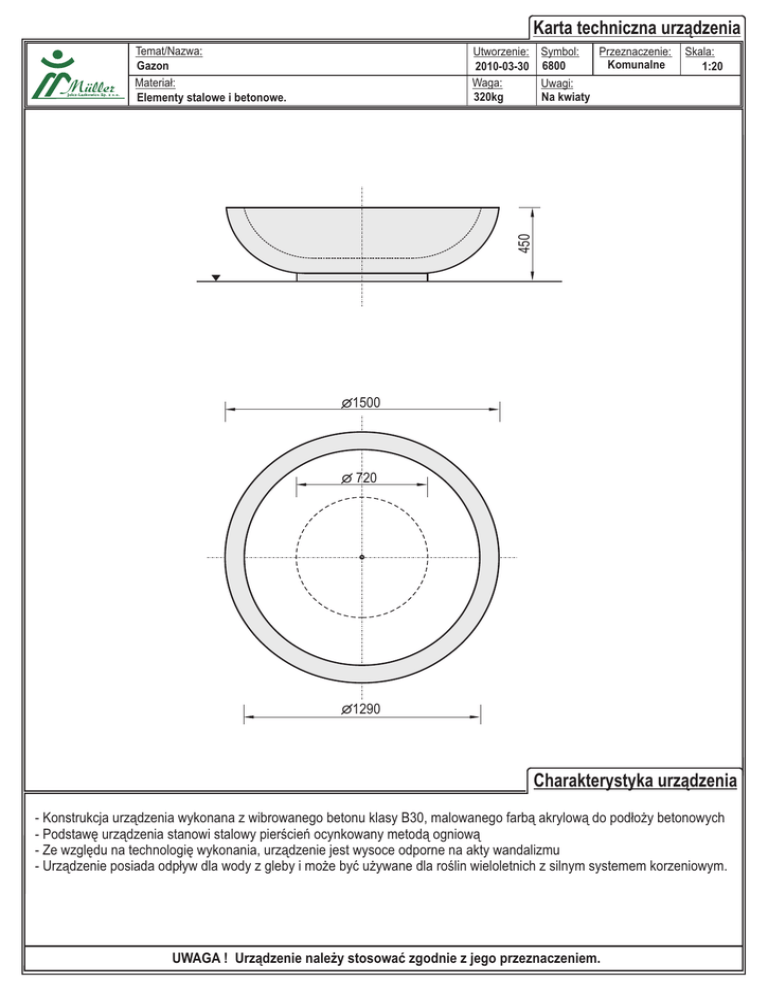 Karta techniczna urz¹dzenia Temat/Nazwa: Gazon Materia³: Elementy stalowe i betonowe. Skala: 1:20 450 Utworzenie: Symbol: Przeznaczenie: Komunalne 2010-03-30 6800 Waga: Uwagi: 320kg Na kwiaty 1500 720 1290 Charakterystyka urz¹dzenia - Konstrukcja urz¹dzenia wykonana z wibrowanego betonu klasy B30, malowanego farb¹ akrylow¹ do pod³o¿y betonowych - Podstawê urz¹dzenia stanowi stalowy pierœcieñ ocynkowany metod¹ ogniow¹ - Ze wzglêdu na technologiê wykonania, urz¹dzenie jest wysoce odporne na akty wandalizmu - Urz¹dzenie posiada odp³yw dla wody z gleby i mo¿e byæ u¿ywane dla roœlin wieloletnich z silnym systemem korzeniowym. UWAGA ! Urz¹dzenie nale¿y stosowaæ zgodnie z jego przeznaczeniem.