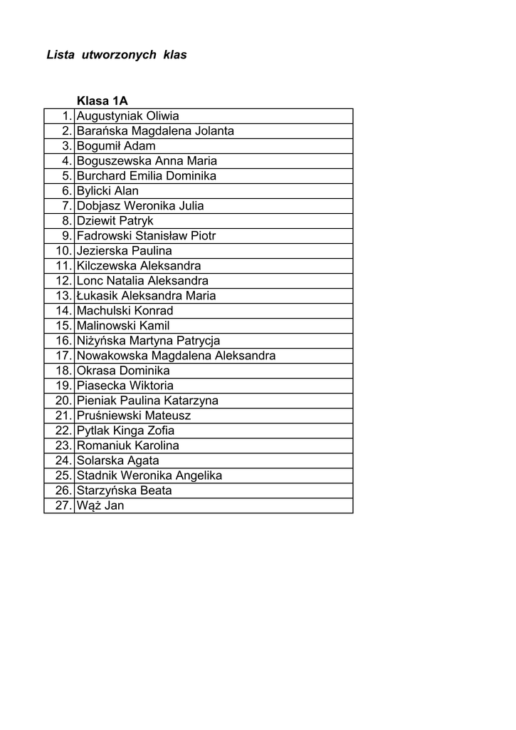 Lista utworzonych klas Klasa 1A 1. Augustyniak Oliwia 2. Barańska