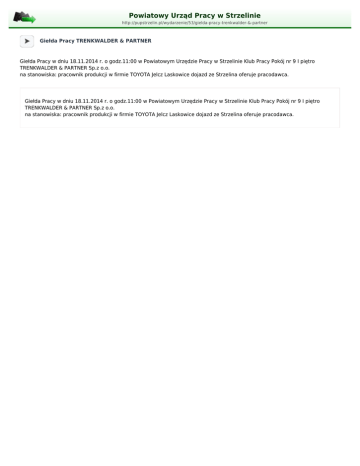 Powiatowy Urząd Pracy w Strzelinie http://pupstrzelin.pl/wydarzenie/53/gielda-pracy-trenkwalder-&-partner Giełda Pracy TRENKWALDER & PARTNER Giełda Pracy w dniu 18.11.2014 r. o godz.11:00 w Powiatowym Urzędzie Pracy w Strzelinie Klub Pracy Pokój nr 9 I piętro TRENKWALDER & PARTNER Sp.z o.o. na stanowiska: pracownik produkcji w firmie TOYOTA Jelcz Laskowice dojazd ze Strzelina oferuje pracodawca. Giełda Pracy w dniu 18.11.2014 r. o godz.11:00 w Powiatowym Urzędzie Pracy w Strzelinie Klub Pracy Pokój nr 9 I piętro TRENKWALDER & PARTNER Sp.z o.o. na stanowiska: pracownik produkcji w firmie TOYOTA Jelcz Laskowice dojazd ze Strzelina oferuje pracodawca.