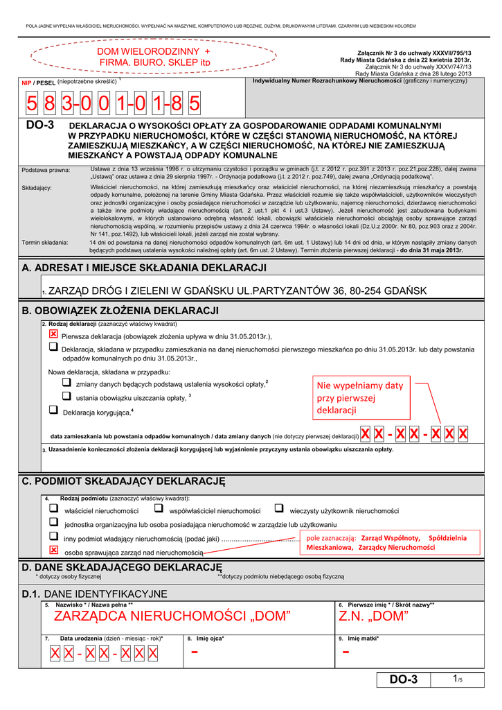 POLA JASNE WYPEŁNIA WŁAŚCICIEL NIERUCHOMOŚCI. WYPEŁNIAĆ NA MASZYNIE, KOMPUTEROWO LUB RĘCZNIE, DUŻYMI, DRUKOWANYMI LITERAMI. CZARNYM LUB NIEBIESKIM KOLOREM DOM WIELORODZINNY + FIRMA, BIURO, SKLEP itp NIP / PESEL (niepotrzebne skreślić) Załącznik Nr 3 do uchwały XXXVII/795/13 Rady Miasta Gdańska z dnia 22 kwietnia 2013r. Załącznik Nr 3 do uchwały XXXV/747/13 Rady Miasta Gdańska z dnia 28 lutego 2013 Indywidualny Numer Rozrachunkowy Nieruchomości (graficzny i numeryczny) 1 5 8 3-0 0 1-0 1-8 5 DO-3 DEKLARACJA O WYSOKOŚCI OPŁATY ZA GOSPODAROWANIE ODPADAMI KOMUNALNYMI W PRZYPADKU NIERUCHOMOŚCI, KTÓRE W CZĘŚCI STANOWIĄ NIERUCHOMOŚĆ, NA KTÓREJ ZAMIESZKUJĄ MIESZKAŃCY, A W CZĘŚCI NIERUCHOMOŚĆ, NA KTÓREJ NIE ZAMIESZKUJĄ MIESZKAŃCY A POWSTAJĄ ODPADY KOMUNALNE Podstawa prawna: Ustawa z dnia 13 września 1996 r. o utrzymaniu czystości i porządku w gminach (j.t. z 2012 r. poz.391 z 2013 r. poz.21,poz.228), dalej zwana „Ustawą” oraz ustawa z dnia 29 sierpnia 1997r. - Ordynacja podatkowa (j.t. z 2012 r. poz.749), dalej zwana „Ordynacją podatkową”. Składający: Właściciel nieruchomości, na której zamieszkują mieszkańcy oraz właściciel nieruchomości, na której niezamieszkują mieszkańcy a powstają odpady komunalne, położonej na terenie Gminy Miasta Gdańska. Przez właścicieli rozumie się także współwłaścicieli, użytkowników wieczystych oraz jednostki organizacyjne i osoby posiadające nieruchomości w zarządzie lub użytkowaniu, najemcę nieruchomości, dzierżawcę nieruchomości a także inne podmioty władające nieruchomością (art. 2 ust.1 pkt 4 i ust.3 Ustawy). Jeżeli nieruchomość jest zabudowana budynkami wielolokalowymi, w których ustanowiono odrębną własność lokali, obowiązki właściciela nieruchomości obciążają osoby sprawujące zarząd nieruchomością wspólną, w rozumieniu przepisów ustawy z dnia 24 czerwca 1994r. o własności lokali (Dz.U.z 2000r. Nr 80, poz.903 oraz z 2004r. Nr 141, poz.1492), lub właścicieli lokali, jeżeli zarząd nie został wybrany. 14 dni od powstania na danej nieruchomości odpadów komunalnych (art. 6m ust. 1 Ustawy) lub 14 dni od dnia, w którym nastąpiły zmiany danych będących podstawą ustalenia wysokości należnej opłaty (art. 6m ust. 2 Ustawy). Termin złożenia pierwszej deklaracji - do dnia 31 maja 2013r. Termin składania: A. ADRESAT I MIEJSCE SKŁADANIA DEKLARACJI 1. ZARZĄD DRÓG I ZIELENI W GDAŃSKU UL.PARTYZANTÓW 36, 80-254 GDAŃSK B. OBOWIĄZEK ZŁOŻENIA DEKLARACJI 2. Rodzaj deklaracji (zaznaczyć właściwy kwadrat) Pierwsza deklaracja (obowiązek złożenia upływa w dniu 31.05.2013r.), Deklaracja, składana w przypadku zamieszkania na danej nieruchomości pierwszego mieszkańca po dniu 31.05.2013r. lub daty powstania odpadów komunalnych po dniu 31.05.2013r., Nowa deklaracja, składana w przypadku: zmiany danych będących podstawą ustalenia wysokości opłaty, ustania obowiązku uiszczania opłaty, 2 Nie wypełniamy daty przy pierwszej deklaracji 3 Deklaracja korygująca,4 data zamieszkania lub powstania odpadów komunalnych / data zmiany danych (nie dotyczy pierwszej deklaracji) XX-XX-XXX 3. Uzasadnienie konieczności złożenia deklaracji korygującej lub wyjaśnienie przyczyny ustania obowiązku uiszczania opłaty. C. PODMIOT SKŁADAJĄCY DEKLARACJĘ Rodzaj podmiotu (zaznaczyć właściwy kwadrat): 4. właściciel nieruchomości współwłaściciel nieruchomości wieczysty użytkownik nieruchomości jednostka organizacyjna lub osoba posiadająca nieruchomość w zarządzie lub użytkowaniu . pole zaznaczają: Zarząd Współnoty, inny podmiot władający nieruchomością (podać jaki) …........................................................................... Spółdzielnia Mieszkaniowa, Zarządcy Nieruchomości osoba sprawująca zarząd nad nieruchomością D. DANE SKŁADAJĄCEGO DEKLARACJĘ **dotyczy podmiotu niebędącego osobą fizyczną * dotyczy osoby fizycznej D.1. DANE IDENTYFIKACYJNE 5. Nazwisko * / Nazwa pełna ** 6. Pierwsze imię * / Skrót nazwy** ZARZĄDCA NIERUCHOMOŚCI „DOM” 7. Data urodzenia (dzień - miesiąc - rok)* XX-XX-XXX ................................................................... 8. Imię ojca* - Z.N. „DOM” 9. Imię matki* DO-3 1/5 POLA JASNE WYPEŁNIA WŁAŚCICIEL NIERUCHOMOŚCI. WYPEŁNIAĆ NA MASZYNIE, KOMPUTEROWO LUB RĘCZNIE, DUŻYMI, DRUKOWANYMI LITERAMI, CZARNYM LUB NIEBIESKIM KOLOREM. D.2. ADRES ZAMIESZKANIA */ADRES SIEDZIBY ** 11. Województwo 10. Kraj 12. Powiat GDAŃSK POMORSKIE POLSKA 13. Gmina 14. Ulica GDAŃSK 15. Nr domu DŁUGA 17. Miejscowość 16. Nr lokalu 41/45 18. Kod pocztowy GDAŃSK 80-827 D.3. KORESPONDENCJA ELEKTRONICZNA 19. Wyrażam zgodę na doręczanie mi pism, a w szczególności decyzji administracyjnych i postanowień, drogą elektroniczną we wszystkich sprawach związanych z opłatą za gospodarowanie odpadami komunalnymi, w tym w postępowaniach administracyjnych dotyczących tej opłaty, których byłbym stroną. TAK NIE 20. Adres poczty elektronicznej [email protected] E. OZNACZENIE NIERUCHOMOŚCI, NA KTÓREJ W CZEŚCI ZAMIESZKUJĄ MIESZKAŃCY I W CZĘŚCI NIE ZAMIESZKUJĄ MIESZKAŃCY A POWSTAJĄ ODPADY KOMUNALNE (Nr KW podaje się przy braku nr działki i obrębu ewidencyjnego) 21. Ulica 22. Nr domu TRUBADURÓW 25. Nr KW GD1G/00012345/6 23. Nr lokalu/lokali 24. Kod pocztowy 4 Sprawdź w odpisie z Księgi Wieczystej 80-205 26. Obręb ewidencyjny 27. Nr działki Sprawdź w odpisie Księgi Wieczystej. Mozna również na stronie miasta Gdańska w zakładce http://mapa.gdansk.gda.pl/ Plan/Mapa.aspx 239 28. Lokalizacja punktu gromadzenia odpadów-pojemników na odpady (adres, inne dane identyfikujące lokalizację pojemnika) TRUBADURÓW 4 - PRZY WEJŚCIU DO KLATKI A ORAZ KLATKI B F. OŚWIADCZENIE O SPOSOBIE ZBIERANIA ODPADÓW KOMUNALNYCH 21. Oświadczenie (zaznaczyć jeden właściwy kwadrat) 005 5 Oświadczam, że odpady komunalne z nieruchomości wykazanej w części E