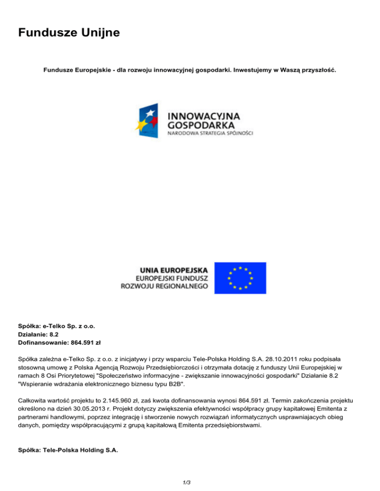 Fundusze Unijne Fundusze Europejskie - dla rozwoju innowacyjnej gospodarki. Inwestujemy w Waszą przyszłość. Spółka: e-Telko Sp. z o.o. Działanie: 8.2 Dofinansowanie: 864.591 zł Spółka zależna e-Telko Sp. z o.o. z inicjatywy i przy wsparciu Tele-Polska Holding S.A. 28.10.2011 roku podpisała stosowną umowę z Polska Agencją Rozwoju Przedsiębiorczości i otrzymała dotację z funduszy Unii Europejskiej w ramach 8 Osi Priorytetowej "Społeczeństwo informacyjne - zwiększanie innowacyjności gospodarki" Działanie 8.2 "Wspieranie wdrażania elektronicznego biznesu typu B2B". Całkowita wartość projektu to 2.145.960 zł, zaś kwota dofinansowania wynosi 864.591 zł. Termin zakończenia projektu określono na dzień 30.05.2013 r. Projekt dotyczy zwiększenia efektywności współpracy grupy kapitałowej Emitenta z partnerami handlowymi, poprzez integrację i stworzenie nowych rozwiązań informatycznych usprawniajacych obieg danych, pomiędzy współpracującymi z grupą kapitałową Emitenta przedsiębiorstwami. Spółka: Tele-Polska Holding S.A. 1/3 Program Operacyjny Innowacyjna Gospodarka Działanie 3.3. Tworzenie systemu ułatwiającego inwestowanie w MSP Poddziałanie 3.3.2 Wsparcie dla MSP Dofinansowanie: 120.000 zł Tele-Polska Holding S.A. dnia 2.10.2012 roku podpisała umowę z Polska Agencją Rozwoju Przedsiębiorczości i otrzymała dofinansowanie z Europejskiego Funduszu Rozwoju Regionalnego w ramach 3 Osi Priorytetowej Programu Operacyjnego Innowacyjna Gospodarka 2007-2013 "Kapitał dla innowacji", Działanie 3.3 "Tworzenie systemu ułatwiajacego inwestowanie w MSP", Poddziałanie 3.3.2 ,,Wsparcie dla 3.3.2. Całkowita wartość projektu podlegająca dofinansowaniu to 240.000 zł, zaś kwota dofinansowania wynosi 120.000 zł. Termin zakończenia projektu określono na dzień 31.10.2013 r. Projekt dotyczy przygotowania dokumentacji prawnej i finansowej wymaganej do przygotowania się Tele-Polska Holding S.A. na wejście główny parkiet Giełdy Papierów Wartościowych w Warszawie. Spółka: Tele-Polska Holding S.A. Działanie: 8.2 Dofinansowanie: 191.415 zł Spółka Tele-Polska Holding S.A. dnia 7.05.2013 roku podpisała umowę z Polską Agencją Rozwoju Przedsiębiorczości i otrzymała dofinansowanie w ramach projektu pt. "Wdrożenie systemu B2B do controllingu i raportowania na giełdę w Tele-PolskaHolding S.A. w celu koordynowania działalności telekomunikacyjnej grupy kapitałowej" dofinansowanego w ramach Programu Operacyjnego Innowacyjna Gospodarka Działanie 8.2 Wspieranie wdrażania elektronicznego biznesu typu B2B. Projekt jest realizowany w okresie od czerwca 2013 roku do sierpnia 2014 roku. Jego budżet wynosi 470.300 zł, w tym kwota dofinansowania 191.415 zł. W wyniku realizacji projektu w Tele-Polska Holding S.A. zostanie wdrożony kompleksowy system do controllingu i budżetowania w obszarze całej grupy kapitałowej sześciu spółek tworzących holding telekomunikacyjny, którym zarządza Tele-Polska Holding S.A.. System będzie obejmował następujące moduły: moduł budżetowania, moduł analiz wielowymiarowych i raportowania oraz moduł raportowania na giełdę. Spółka: TelePolska Sp. z o.o. Działanie: 8.2 Dofinansowanie: 945.229 zł TelePolska Sp. z o.o. dnia 13.05.2013 roku podpisała umowę z Polską Agencją Rozwoju Przedsiębiorczości i otrzymała dofinansowanie w ramach projektu pt. "Wdrożenie systemu B2B dla operatora telekomunikacyjnego TelePolska Sp. z o.o. w celu automatyzacji procesów biznesowych z partnerami na rynku telekomunikacyjnym" dofinansowany w ramach Programu Operacyjnego Innowacyjna Gospodarka Działanie 8.2 Wspieranie wdrażania elektronicznego biznesu typu B2B. Projekt jest realizowany w okresie od czerwca 2013 roku do lutego 2015 roku. Budżet projektu wynosi 2.343.960 zł, w tym kwota dofinansowania 945.229 zł. W wyniku realizacji projektu w Tele-Polska Sp. z o.o. zostanie wdrożony kompleksowy system do automatyzacji procesów biznesowych zachodzących pomiędzy Tele-Polska a jej partnerami biznesowymi. System B2B będzie się składał z następujących modułów: moduł do automatyzacji wymiany danych o abonentach i zamówionych usługach, moduł do generowania billingów i faktur dla abonentów, moduł do automatyzacja procesu obsługi zgłoszeń abonentów do pomocy technicznej, moduł do automatyzacja procesu uzgadniania rozliczeń i fakturowania partnerów, moduł do automatyzacji procesu wymiany danych finansowych z biurem księgowym i moduł do automatyzacji procesu wymiany danych z firmą windykacyjną. 2/3 Spółka: e-Telko Sp. z o.o. Działanie: 8.2 Dofinansowanie: 1.981.257,00 zł Spółka zależna e-Telko Sp. z o.o. z inicjatywy i przy wsparciu Tele-Polska Holding S.A. w dniu 02.10.2013 roku podpisała stosowną umowę z Polska Agencją Rozwoju Przedsiębiorczości i otrzymała dotację z funduszy Unii Europejskiej w ramach 8 Osi Priorytetowej "Społeczeństwo informacyjne - zwiększanie innowacyjności gospodarki" Działanie 8.2 "Wspieranie wdrażania elektronicznego biznesu typu B2B". Całkowita wartość projektu to 4.859.280,00 zł, zaś kwota dofinansowania wynosi 1.981.257,00 zł. Termin zakończenia projektu określono na dzień 30.04.2015 r. Projekt dotyczy zwiększenia efektywności współpracy grupy kapitałowej Emitenta z partnerami handlowymi, poprzez integrację i stworzenie nowych rozwiązań informatycznych usprawniających obieg danych, pomiędzy współpracującymi z grupą kapitałową Emitenta przedsiębiorstwami. 3/3