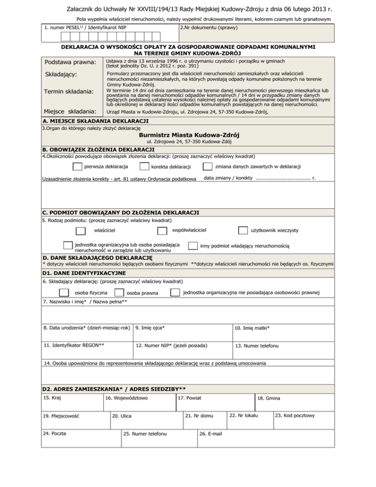 Załacznik do Uchwały Nr XXVIII/194/13 Rady Miejskiej Kudowy-Zdroju z dnia 06 lutego 2013 r. Pola wypełnia właściciel nieruchomości, naleŜy wypełnić drukowanymi literami, kolorem czarnym lub granatowym 2.Nr dokumentu (sprawy) 1. numer PESEL1) / Identyfikarot NIP DEKLARACJA O WYSOKOŚCI OPŁATY ZA GOSPODAROWANIE ODPADAMI KOMUNALNYMI NA TERENIE GMINY KUDOWA-ZDRÓJ Podstawa prawna: Ustawa z dnia 13 września 1996 r. o utrzymaniu czystości i porządku w gminach (tekst jednolity Dz. U. z 2012 r. poz. 391) Składający: Formularz przeznaczony jest dla właścicieli nieruchomości zamieszkałych oraz właścicieli nieruchomości niezamieszkałych, na których powstają odpady komunalne położonych na terenie Gminy Kudowa-Zdrój. W terminie 14 dni od dnia zamieszkania na terenie danej nieruchomości pierwszego mieszkańca lub powstania na danej nieruchomości odpadów komunalnych / 14 dni w przypadku zmiany danych będących podstawą ustalenia wysokości należnej opłaty za gospodarowanie odpadami komunalnymi lub określonej w deklaracji ilości odpadów komunalnych powstających na danej nieruchomości. Termin składania: Miejsce składania: Urząd Miasta w Kudowie-Zdroju, ul. Zdrojowa 24, 57-350 Kudowa-Zdrój, A. MIEJSCE SKŁADANIA DEKLARACJI 3.Organ do którego należy złożyć deklarację Burmistrz Miasta Kudowa-Zdrój ul. Zdrojowa 24, 57-350 Kudowa-Zdój B. OBOWIĄZEK ZŁOŻENIA DEKLARACJI 4.Okoliczności powodujące obowiązek złożenia deklaracji: (proszę zaznaczyć właściwy kwadrat) pierwsza deklaracja zmiana danych zawartych w deklaracji korekta deklaracji data zmiany / korekty .................................... r. Uzasadnienie złożenia korekty - art. 81 ustawy Ordynacja podatkowa C. PODMIOT OBOWIĄZANY DO ZŁOŻENIA DEKLARACJI 5. Rodzaj podmiotu: (proszę zaznaczyć właściwy kwadrat) współwłaściciel właściciel jednostka ogranizacyjna lub osoba posiadająca nieruchomość w zarządzie lub użytkowaniu użytkownik wieczysty inny podmiot władający nieruchomością D. DANE SKŁADAJĄCEGO DEKLARACJĘ * dotyczy właścicieli nieruchomości będących osobami fizycznymi **dotyczy właścicieli nieruchomości nie będących os. fizycznymi D1. DANE IDENTYFIKACYJNE 6. Składający deklarację: (proszę zaznaczyć właściwy kwadrat) osoba fizyczna osoba prawna jednostka organizacyjna nie posiadająca osobowości prawnej 7. Nazwisko i imię* / Nazwa pełna** 8. Data urodzenia* (dzień-miesiąc-rok) 9. Imię ojca* 10. Imię matki* 11. Identyfikator REGON** 12. Numer NIP* (jeżeli posiada) 13. Numer telefonu 14. Osoba upoważniona do reprezentowania składającego deklarację wraz z podstawą umocowania D2. ADRES ZAMIESZKANIA* / ADRES SIEDZIBY** 15. Kraj 19. Miejscowość 24. Poczta 16. Województowo 20. Ulica 25. Numer telefonu 17. Powiat 21. Nr domu 26. E-mail 18. Gmina 22. Nr lokalu 23. Kod pocztowy D3. ADRES NIERUCHOMOŚCI NA KTÓREJ POWSTAJĄ ODPADY KOMUNALNE Deklarację należy składać odbrębnie dla każdej nieruchomości 27. Ulica 28. Nr domu 29. Nr lokalu 30. Obręb/nr działki D4. MIEJSCE LOKALIZACJI POJEMNIKÓW (wypełnić w przypadku, gdy miejsce lokalizacji pojemników jest inne niż adres nieruchomości na której powstają odpady) w punktach wspólnego gromadzenia odpadów ........................................................................................................ (proszę podać lokalizację) inna lokalizacja (jaka) ......................................................................................................................................... E. INFORMACJE STANOWIĄCE PODSTAWĘ OBLICZENIA OPŁATY Nieruchomość wskazana w części D3 jest: (proszę zaznaczyć właściwy kwadrat) w części zamieszkała oraz w części niezamieszkała, na której powstają odpady komunalne niezamieszkała, na której powstają odpady komunalne zamieszkała Właściciel takiej nieruchomości wypełnia Właściciel takiej nieruchomości wypełnia dział E2 dział E1 Właściciel takiej nieruchomości wypełnia działy E1 i E2 E1. DOTYCZY WŁAŚCICIELI NIERUCHOMOŚCI, NA KTÓRYCH ZAMIESZKUJĄ MIESZKAŃCY Oświadczam, że na terenie nieruchomości wskazanej w części D3 niniejszej deklaracji selektywny 31. Odpady gromadzone są w sposób: nieselektywny 32. Zamieszkuje stale: .................... osób 33. Odpady gromadzone są w pojemnikach: Nie wypełniają właściciele, którzy w części D4 zaznaczyli punkty wspólnego gromadzenia odpadów. rodzaj pojemnika 110 l 120 l 240 l 1100 l worki do selektywnej zbiórki ilość pojemników 34. Czy na nieruchomości znajduje się kompostownik? TAK TAK NIE proszę podać pojemność ................................ NIE Miesięczna stawka opłaty na jednego mieszkańca. (miesięczne stawki opłaty za gospodarowanie odpadami komunalnymi reguluje odrębna uchwała) Wysokość miesięcznej opłaty za gospodarowanie odpadami komunalnymi. (proszę wypełnić tylko jedno pole:) 35. 36. .....................zł .....................zł jeżeli gromadzenie selektywne jeżeli gromadzenie nieselektywne 37. 38. 1. W przypadku odpadów gromadzonych w sposób selektywny jest to iloczyn pozycji 32 x 35 2. W przypadku odpadów gromadzonych w sposób nieselektywny jest to iloczyn pozycji 32 x 36 0.00 .....................zł 0.00 .....................zł (poz. 32 x poz.35) (poz. 32 x poz.36) E2. DOTYCZY WŁAŚCICIELI NIERUCHOMOŚCI NIEZAMIESZKAŁYCH, NA KTÓRYCH POWSTAJĄ ODPADY KOMUNALNE Oświadczam, że na terenie nieruchomości wskazanej w części D3 niniejszej deklaracji 39. Odpady gromadzone są w sposób: I. I,. Wielkość pojemników na odpady komunalne selektywny 6WDZNDRSáDW\ ]DSRMHPQLN a. jeżeli gromadzenie selektywne b. jeżeli gromadzenie nieselektywne I,I. nieselektywny IV. Liczba SRMHPQLNów a. odbieranych Wysokość miesięcznej opłaty iloczyn kolumny IIa x III b. iloczyn kolumny IIb x III w miesiącu 35-40 l 0.00 0.00 110 l 0.00 0.00 120 l 0.00 0.00 240 l 0.00 0.00 1100 l 0.00 0.00 0.00 0.00 worki służ