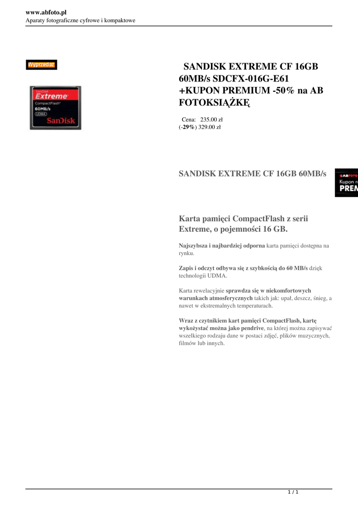 www.abfoto.pl Aparaty fotograficzne cyfrowe i kompaktowe SANDISK EXTREME CF 16GB 60MB/s SDCFX-016G-E61 +KUPON PREMIUM -50% na AB FOTOKSIĄŻKĘ Cena: 235.00 zł (-29%) 329.00 zł SANDISK EXTREME CF 16GB 60MB/s Karta pamięci CompactFlash z serii Extreme, o pojemności 16 GB. Najszybsza i najbardziej odporna karta pamięci dostępna na rynku. Zapis i odczyt odbywa się z szybkością do 60 MB/s dzięk technologii UDMA. Karta rewelacyjnie sprawdza się w niekomfortowych warunkach atmosferycznych takich jak: upał, deszcz, śnieg, a nawet w ekstremalnych temperaturach. Wraz z czytnikiem kart pamięci CompactFlash, kartę wykożystać można jako pendrive, na której można zapisywać wszelkiego rodzaju dane w postaci zdjęć, plików muzycznych, filmów lub innych. 1/1 Powered by TCPDF (www.tcpdf.org)