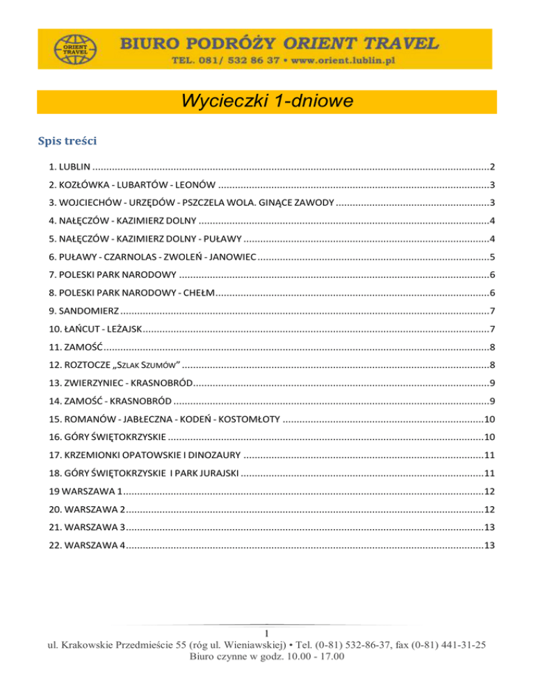 Wycieczki 1-dniowe Spis treści 1. LUBLIN ..............................................................................................................................................2 2. KOZŁÓWKA - LUBARTÓW - LEONÓW .................................................................................................3 3. WOJCIECHÓW - URZĘDÓW - PSZCZELA WOLA. GINĄCE ZAWODY ....................................................... 3 4. NAŁĘCZÓW - KAZIMIERZ DOLNY ........................................................................................................4 5. NAŁĘCZÓW - KAZIMIERZ DOLNY - PUŁAWY ........................................................................................ 4 6. PUŁAWY - CZARNOLAS - ZWOLEO - JANOWIEC ................................................................................... 5 7. POLESKI PARK NARODOWY ...............................................................................................................6 8. POLESKI PARK NARODOWY - CHEŁM ..................................................................................................6 9. SANDOMIERZ ....................................................................................................................................7 10. ŁAOCUT - LEŻAJSK ............................................................................................................................ 7 11. ZAMOŚD ..........................................................................................................................................8 12. ROZTOCZE „SZLAK SZUMÓW” ..............................................................................................................8 13. ZWIERZYNIEC - KRASNOBRÓD..........................................................................................................9 14. ZAMOŚD - KRASNOBRÓD ................................................................................................................. 9 15. ROMANÓW - JABŁECZNA - KODEO - KOSTOMŁOTY ........................................................................10 16. GÓRY ŚWIĘTOKRZYSKIE ................................................................................................................. 10 17. KRZEMIONKI OPATOWSKIE I DINOZAURY ...................................................................................... 11 18. GÓRY ŚWIĘTOKRZYSKIE I PARK JURAJSKI ....................................................................................... 11 19 WARSZAWA 1 .................................................................................................................................12 20. WARSZAWA 2 ................................................................................................................................ 12 21. WARSZAWA 3 ................................................................................................................................ 13 22. WARSZAWA 4 ................................................................................................................................ 13 1 ul. Krakowskie Przedmieście 55 (róg ul. Wieniawskiej) • Tel. (0-81) 532-86-37, fax (0-81) 441-31-25 Biuro czynne w godz. 10.00 - 17.00 1. LUBLIN program: Wzgórze Zamkowe, Muzeum Lubelskie (Zamek), Kaplica Zamkowa z unikalnymi freskami rusko-bizantyjskimi (dla klas starszych) Rynek Starego Miasta i jego zabytki: Bazylika oo. Dominikanów, Archikatedra Lubelska, Zakrystia Akustyczna Brama Krakowska, kościół Wizytek, Plac Litewski Jako wariant zamienny jednego z obiektów do zwiedzania: Ogród Botaniczny (w sezonie) lub Muzeum Martyrologii na Majdanku - dla młodzieży starszej Uwaga: proponujemy wycieczki tematyczne po Lublinie: Szlakiem Jagiellońskim: Zamek, Kościół Dominikanów, Pomnik Unii Lubelskiej na Placu Litewskim Szlakiem Żydów Lubelskich: Teatr NN, Kirkut, Synagoga (muzeum), Jeszybot (Uczelnia Mędrców Lublina), Pomnik Bezimiennych Ofiar Holocaustu, Majdanek Szlakiem Wielkich Ludzi Szlakiem Legend Lubelskich Szlakiem Pomników Lubelskich Szlakiem Zabytkowych Pałaców Szczególnie polecamy niedawno otwartą Podziemną Trasę Turystyczną – zwiedzanie z przewodnikiem Lubelskich Podziemi: spacer zabytkowymi piwnicami, makiety ukazujące fazy rozwoju Lublina oraz multimedialną wizualizację ( światło, dźwięk, ruch) wielkiego pożaru Lublina. Cena wycieczek po Lublinie nie zawiera transportu i kształtuje się w granicach kilkunastu zł/os. w zależności od zamówionego programu i wybranych obiektów do zwiedzania. 2 ul. Krakowskie Przedmieście 55 (róg ul. Wieniawskiej) • Tel. (0-81) 532-86-37, fax (0-81) 441-31-25 Biuro czynne w godz. 10.00 - 17.00 2. KOZŁÓWKA - LUBARTÓW - LEONÓW program: LUBARTÓW - Zespół Pałacowo-Parkowy, kościół Św. Anny (możliwość zwiedzania Muzeum Diecezjalnego) KOZŁÓWKA - Zespół Pałacowo-Parkowy LEONÓW - Mini ZOO (lamy, hucuły, osiołki, strusie afrykańskie...) Hodowcy w interesujący sposób opowiadają o ciekawych zwyczajach zwierząt. Możliwość zakupu strusich piór i innych pamiątek. * możliwość upieczenia kiełbaski przy ognisku cena 44,00 zł/40 os. 49,00 zł/35 os. 3. WOJCIECHÓW - URZĘDÓW - PSZCZELA WOLA. GINĄCE ZAWODY program: WOJCIECHÓW - zwiedzanie Muzeum Kowalstwa w „Wieży Ariańskiej”, możliwość pokazu pracy kowala w kuźni BĘCZYN (URZĘDÓW) - pokaz i nauka lepienia garnków w Zagrodzie Panów Zygfryda i Cezarego Gajewskich PSZCZELA WOLA - Izba Tradycji Szkoły, Skansen Pszczelarstwa zwiedzanie hodowli zwierząt domowych gry i zabawy na powietrzu ognisko cena 44,00 zł/40 os. 50,00 zł/35 os. 3 ul. Krakowskie Przedmieście 55 (róg ul. Wieniawskiej) • Tel. (0-81) 532-86-37, fax (0-81) 441-31-25 Biuro czynne w godz. 10.00 - 17.00 4. NAŁĘCZÓW - KAZIMIERZ DOLNY program: NAŁĘCZÓW - Park Zdrojowy, pijalnia wód mineralnych, Muzeum Stefana Żeromskiego, Pałac Małachowskich słynna nekropolia wielkich ludzi kultury polskiej (Szelbu