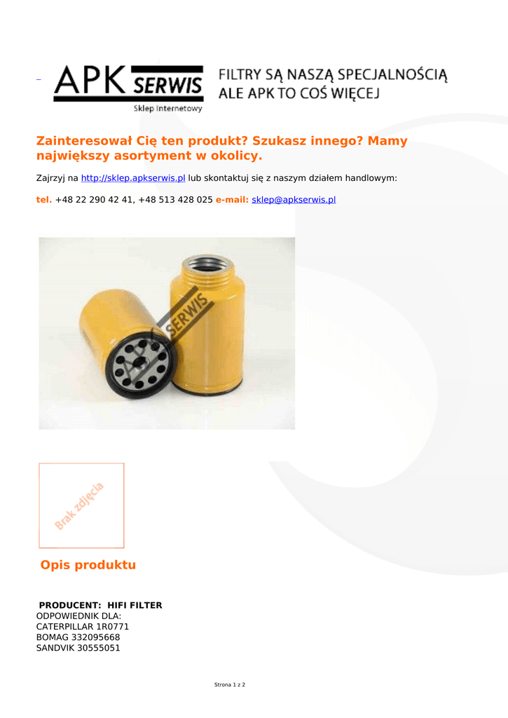 Zainteresował Cię ten produkt? Szukasz innego? Mamy największy asortyment w okolicy. Zajrzyj na http://sklep.apkserwis.pl lub skontaktuj się z naszym działem handlowym: tel. +48 22 290 42 41, +48 513 428 025 e-mail: [email protected] Opis produktu PRODUCENT: HIFI FILTER ODPOWIEDNIK DLA: CATERPILLAR 1R0771 BOMAG 332095668 SANDVIK 30555051 Strona 1 z 2 Strona 2 z 2
