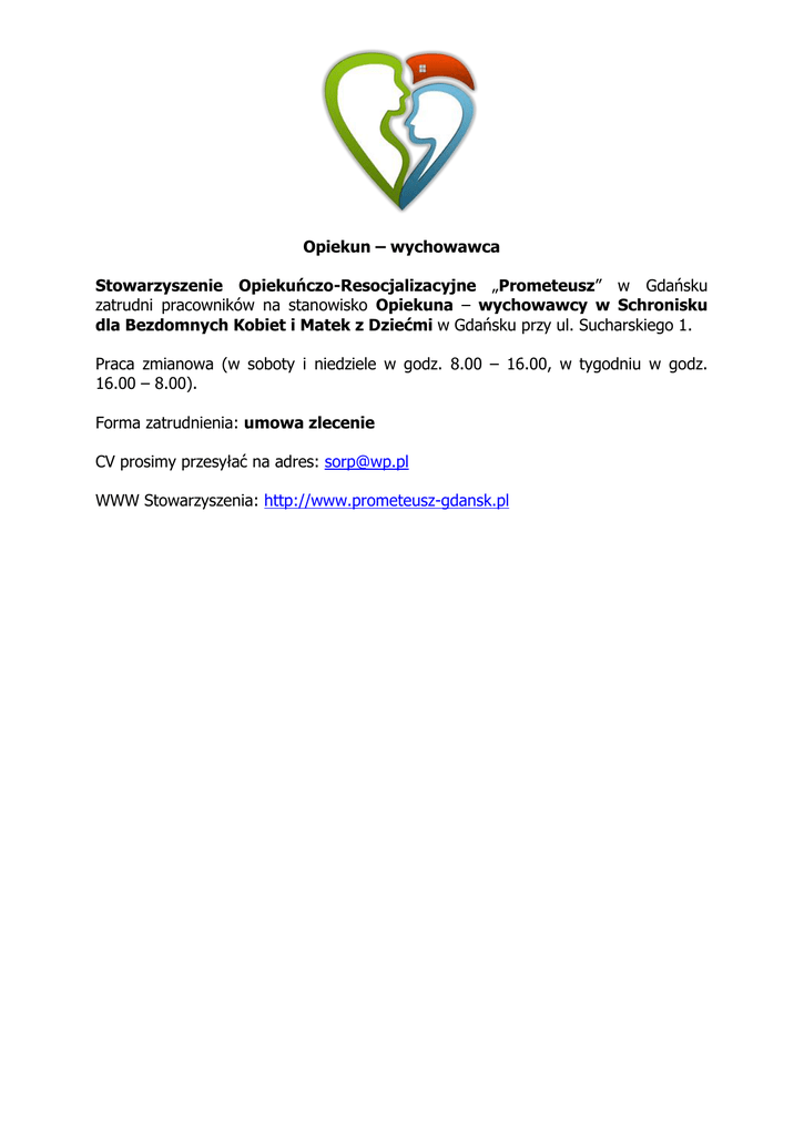 Opiekun – wychowawca Stowarzyszenie Opiekuńczo-Resocjalizacyjne „Prometeusz” w Gdańsku zatrudni pracowników na stanowisko Opiekuna – wychowawcy w Schronisku dla Bezdomnych Kobiet i Matek z Dziećmi w Gdańsku przy ul. Sucharskiego 1. Praca zmianowa (w soboty i niedziele w godz. 8.00 – 16.00, w tygodniu w godz. 16.00 – 8.00). Forma zatrudnienia: umowa zlecenie CV prosimy przesyłać na adres: [email protected] WWW Stowarzyszenia: http://www.prometeusz-gdansk.pl