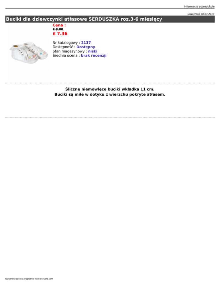 Informacje o produkcie Utworzono 08-03-2017 Buciki dla dziewczynki atłasowe SERDUSZKA roz.3-6 miesięcy Cena : £ 8.00 £ 7.36 Nr katalogowy : 2137 Dostępność : Dostępny Stan magazynowy : niski Średnia ocena : brak recenzji Śliczne niemowlęce buciki wkładka 11 cm. Buciki są miłe w dotyku z wierzchu pokryte atłasem. Wygenerowano w programie www.oscGold.com