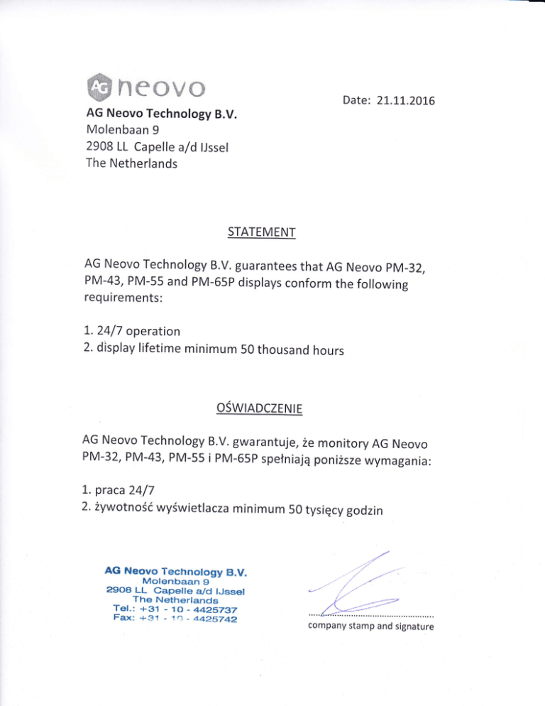 AG Neovo Technology B.v. guarantees that AG Neovo pM-32,