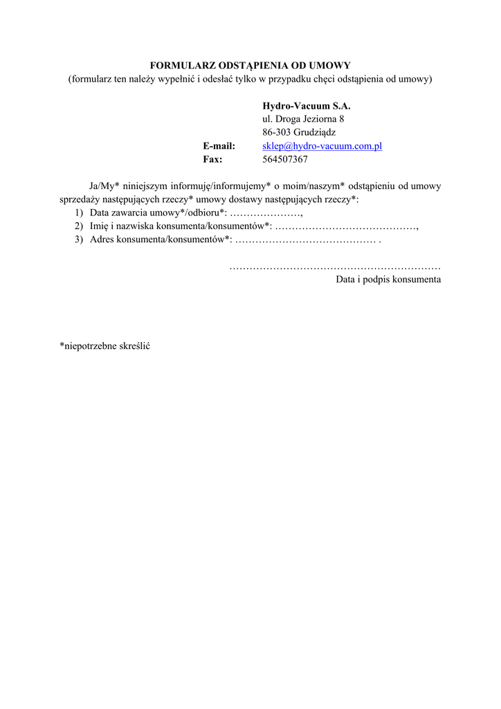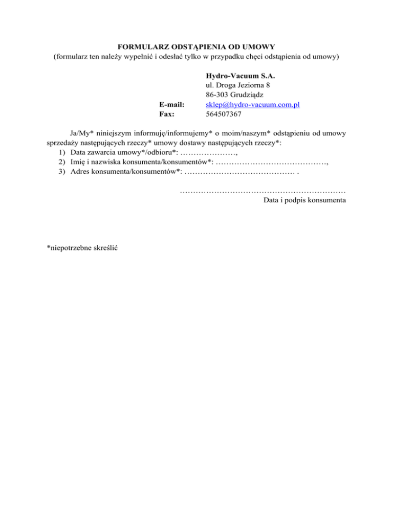 FORMULARZ ODSTĄPIENIA OD UMOWY (formularz ten należy wypełnić i odesłać tylko w przypadku chęci odstąpienia od umowy) E-mail: Fax: Hydro-Vacuum S.A. ul. Droga Jeziorna 8 86-303 Grudziądz [email protected] 564507367 Ja/My* niniejszym informuję/informujemy* o moim/naszym* odstąpieniu od umowy sprzedaży następujących rzeczy* umowy dostawy następujących rzeczy*: 1) Data zawarcia umowy*/odbioru*: …………………, 2) Imię i nazwiska konsumenta/konsumentów*: ……………………………………, 3) Adres konsumenta/konsumentów*: …………………………………… . ……………………………………………………… Data i podpis konsumenta *niepotrzebne skreślić