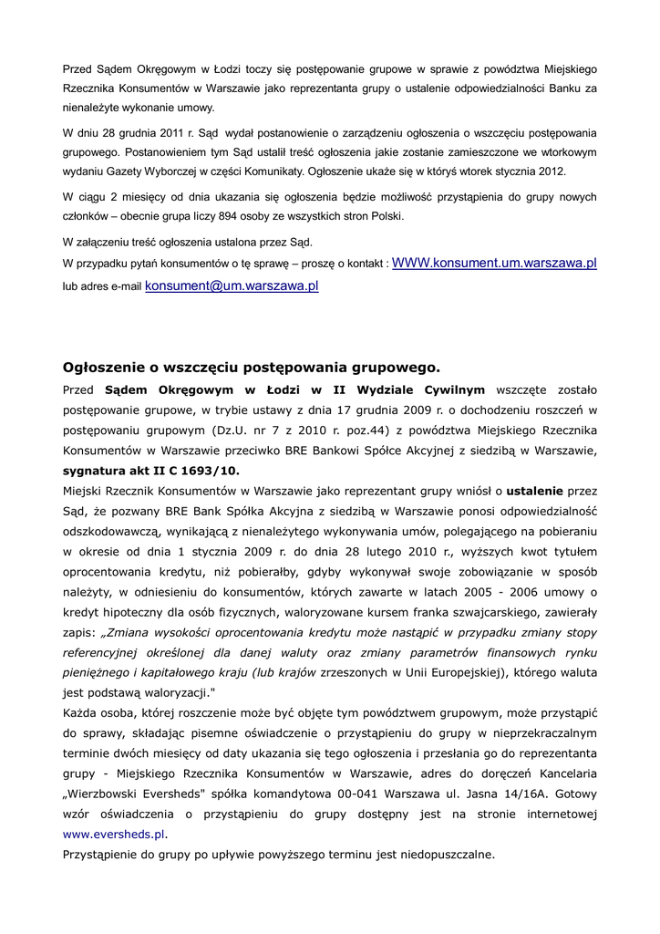 Przed Sądem Okręgowym w Łodzi toczy się postępowanie grupowe w sprawie z powództwa Miejskiego Rzecznika Konsumentów w Warszawie jako reprezentanta grupy o ustalenie odpowiedzialności Banku za nienaleŜyte wykonanie umowy. W dniu 28 grudnia 2011 r. Sąd wydał postanowienie o zarządzeniu ogłoszenia o wszczęciu postępowania grupowego. Postanowieniem tym Sąd ustalił treść ogłoszenia jakie zostanie zamieszczone we wtorkowym wydaniu Gazety Wyborczej w części Komunikaty. Ogłoszenie ukaŜe się w któryś wtorek stycznia 2012. W ciągu 2 miesięcy od dnia ukazania się ogłoszenia będzie moŜliwość przystąpienia do grupy nowych członków – obecnie grupa liczy 894 osoby ze wszystkich stron Polski. W załączeniu treść ogłoszenia ustalona przez Sąd. W przypadku pytań konsumentów o tę sprawę – proszę o kontakt : WWW.konsument.um.warszawa.pl lub adres e-mail [email protected] Ogłoszenie o wszczęciu postępowania grupowego. Przed Sądem Okręgowym w Łodzi w II Wydziale Cywilnym wszczęte zostało postępowanie grupowe, w trybie ustawy z dnia 17 grudnia 2009 r. o dochodzeniu roszczeń w postępowaniu grupowym (Dz.U. nr 7 z 2010 r. poz.44) z powództwa Miejskiego Rzecznika Konsumentów w Warszawie przeciwko BRE Bankowi Spółce Akcyjnej z siedzibą w Warszawie, sygnatura akt II C 1693/10. Miejski Rzecznik Konsumentów w Warszawie jako reprezentant grupy wniósł o ustalenie przez Sąd, Ŝe pozwany BRE Bank Spółka Akcyjna z siedzibą w Warszawie ponosi odpowiedzialność odszkodowawczą, wynikającą z nienaleŜytego wykonywania umów, polegającego na pobieraniu w okresie od dnia 1 stycznia 2009 r. do dnia 28 lutego 2010 r., wyŜszych kwot tytułem oprocentowania kredytu, niŜ pobierałby, gdyby wykonywał swoje zobowiązanie w sposób naleŜyty, w odniesieniu do konsumentów, których zawarte w latach 2005 - 2006 umowy o kredyt hipoteczny dla osób fizycznych, waloryzowane kursem franka szwajcarskiego, zawierały zapis: „Zmiana wysokości oprocentowania kredytu moŜe nastąpić w przypadku zmiany stopy referencyjnej określonej dla danej waluty oraz zmiany parametrów finansowych rynku pienięŜnego i kapitałowego kraju (lub krajów zrzeszonych w Unii Europejskiej), którego waluta jest podstawą waloryzacji." KaŜda osoba, której roszczenie moŜe być objęte tym powództwem grupowym, moŜe przystąpić do sprawy, składając pisemne oświadczenie o przystąpieniu do grupy w nieprzekraczalnym terminie dwóch miesięcy od daty ukazania się tego ogłoszenia i przesłania go do reprezentanta grupy - Miejskiego Rzecznika Konsumentów w Warszawie, adres do doręczeń Kancelaria „Wierzbowski Eversheds" spółka komandytowa 00-041 Warszawa ul. Jasna 14/16A. Gotowy wzór oświadczenia o przystąpieniu do grupy dostępny jest na stronie www.eversheds.pl. Przystąpienie do grupy po upływie powyŜszego terminu jest niedopuszczalne. internetowej ZłoŜenie oświadczenia o przystąpieniu do grupy jest równoznaczne z wyraŜeniem zgody na pełnienie funkcji reprezentanta grupy przez Miejskiego Rzecznika Konsumentów w Warszawie oraz na zasady wynagradzania pełnomocnika. Na wynagrodzenie pełnomocnika od kaŜdego członka grupy składa się kwota 2.515,35,-zł brutto tytułem wynagrodzenia za postępowanie w pierwszej instancji i kwota 1.900,35,-zł brutto za postępowanie w drugiej instancji, o ile dojdzie do postępowania w drugiej instancji. Prawomocny wyrok ma skutek wobec wszystkich członków grupy, to jest osób, które przed upływem terminu wskazanego w tym ogłoszeniu prześlą podpisane oświadczenie o przystąpieniu do grupy i zostaną uwzględnione w postanowieniu sądu określającym skład grupy. W związku z powyŜszym proszę o wykorzystanie powyŜszej informacji w swoich serwisach informacyjnych. Andrzej Bednarczyk Miejski Rzecznik Konsumentów w Ostrołęce