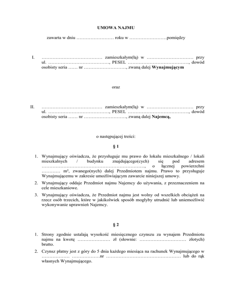 UMOWA NAJMU zawarta w dniu …………………… roku w ……………………pomiędzy I. ………………………………… zamieszkałym(łą) w ………………………… przy ul. …………………………………, PESEL …………………………………, dowód osobisty seria …… nr ………………………, zwaną dalej Wynajmującym oraz II. ………………………………… zamieszkałym(łą) w ………………………… przy ul. …………………………………, PESEL …………………………………, dowód osobisty seria …… nr ………………………, zwaną dalej Najemcą, o następującej treści: §1 1. Wynajmujący oświadcza, Ŝe przysługuje mu prawo do lokalu mieszkalnego / lokali mieszkalnych / budynku znajdującego(cych) się pod adresem …………………………………………………………, o łącznej powierzchni ………… m², zwanego(nych) dalej Przedmiotem najmu. Prawo to przysługuje Wynajmującemu w zakresie umoŜliwiającym zawarcie niniejszej umowy. 2. Wynajmujący oddaje Przedmiot najmu Najemcy do uŜywania, z przeznaczeniem na cele mieszkaniowe. 3. Wynajmujący oświadcza, Ŝe Przedmiot najmu jest wolny od wszelkich obciąŜeń na rzecz osób trzecich, które w jakikolwiek sposób mogłyby utrudnić lub uniemoŜliwić wykonywanie uprawnień Najemcy. §2 1. Strony zgodnie ustalają wysokość miesięcznego czynszu za wynajem Przedmiotu najmu na kwotę ………………… zł (słownie: ………………………… złotych) brutto. 2. Czynsz płatny jest z góry do 5 dnia kaŜdego miesiąca na rachunek Wynajmującego w ……………… ………………nr ………………………………………… lub do rąk własnych Wynajmującego. 3. Wartość czynszu najmu opisanego w ust.1 powyŜej nie zawiera / zawiera w sobie opłat(y) z tytułu eksploatacji Przedmiot najmu tj. opłaty z tytułu zarządzania nieruchomością, wydatków na nieruchomość wspólną, wywozu i usuwania śmieci i nieczystości, zuŜycia energii elektrycznej, ciepła i wody oraz / z wyjątkiem opłat(y) za korzystanie z Internetu i linii telefonicznej, które pokrywa Najemca wedle wskazań rachunków pochodzących od dostawców tychŜe usług. 4. Najemca odpowiada wobec Wynajmującego za wszelkie szkody powstałe w wyniku nieopłacenia przez Najemcę w odpowiedniej wysokości i terminie obciąŜających Najemcę opłat eksploatacyjnych. 5. Za datę płatności uznaje się datę uznania rachunku bankowego Wynajmującego lub, odpowiednio, dzień przekazania naleŜności do rąk własnych Wynajmującego. §3 1. Przedmiot najmu został Najemcy udostępniony, co Najemca niniejszym potwierdza. 2. Najemca oświadcza, Ŝe stan techniczny Przedmiotu najmu nie budzi zastrzeŜeń i opisany jest szczegółowo wraz z wyposaŜeniem i stanem tego wyposaŜenia w protokole przekazania stanowiącym załącznik do niniejszej umowy. 3. Najemcę obciąŜają wszelkie zwykłe nakłady na Przedmiot najmu związane z jego normalną eksploatacją. 4. Najemca bez zgody Wynajmującego nie moŜe dokonywać Ŝadnych ulepszeń i adaptacji Przedmiotu najmu. 5. Najemca nie moŜe bez zgody Wynajmującego uŜytkować Przedmiotu najmu odmiennie niŜ wynika to z treści niniejszej umowy ani oddawać osobom trzecim w uŜywanie. 6. Wynajmujący zastrzega sobie prawo dostępu do zajmowanego przez Najemcę Przedmiotu najmu w przypadku zdarzeń losowych mogących w istotny sposób zakłócić normalne funkcjonowanie nieruchomości w której znajduje się Przedmiot najmu lub stworzyć zagroŜenie dla mieszkańców nieruchomości i sąsiedztwa. 7. Najemca zobowiązuje się po zakończeniu najmu zwrócić Przedmiot najmu Wynajmującemu w naleŜytym stanie technicznym i sanitarnym, uwzględniającym zuŜycie, wynikające z normalnej eksploatacji. §4 1. Umowa niniejsza zostaje zawarta na czas nieoznaczony / oznaczony, tj do dnia …………………. 2. KaŜda ze stron moŜe umowę niniejszą rozwiązać z zachowaniem okresu wypowiedzenia wskazanego przepisami ustawy z dnia 21 czerwca 2001 roku o ochronie praw lokatorów, mieszkaniowym zasobie gminy i o zmianie Kodeksu cywilnego, w szczególności art. 11 tej ustawy. §5 1. Wszelkie zmiany i uzupełnienia niniejszej umowy wymagają formy pisemnego aneksu pod rygorem niewaŜności. 2. W sprawach nie uregulowanych postanowieniami niniejszej umowy mają zastosowanie przepisy Kodeksu Cywilnego i ustawy, której mowa §4 ust.2 powyŜej. 3. Wszelkie spory wynikłe na tle stosowania postanowień niniejszej umowy rozstrzyga Sąd właściwy dla miejsca zamieszkania Wynajmującego 4. Umowę niniejsza sporządza się w dwóch jednobrzmiących egzemplarzach po jednym dla kaŜdej ze stron. Wynajmujący Najemca