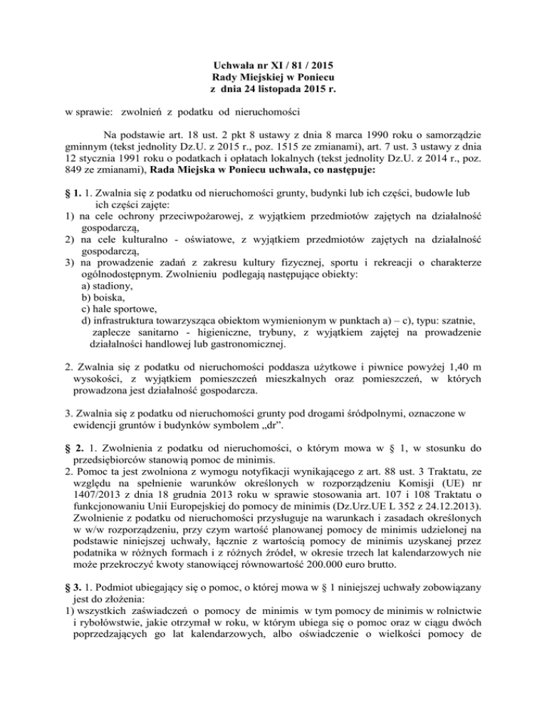 Uchwała nr XI / 81 / 2015 Rady Miejskiej w Poniecu z dnia 24 listopada 2015 r. w sprawie: zwolnień z podatku od nieruchomości Na podstawie art. 18 ust. 2 pkt 8 ustawy z dnia 8 marca 1990 roku o samorządzie gminnym (tekst jednolity Dz.U. z 2015 r., poz. 1515 ze zmianami), art. 7 ust. 3 ustawy z dnia 12 stycznia 1991 roku o podatkach i opłatach lokalnych (tekst jednolity Dz.U. z 2014 r., poz. 849 ze zmianami), Rada Miejska w Poniecu uchwala, co następuje: § 1. 1. Zwalnia się z podatku od nieruchomości grunty, budynki lub ich części, budowle lub ich części zajęte: 1) na cele ochrony przeciwpożarowej, z wyjątkiem przedmiotów zajętych na działalność gospodarczą, 2) na cele kulturalno - oświatowe, z wyjątkiem przedmiotów zajętych na działalność gospodarczą, 3) na prowadzenie zadań z zakresu kultury fizycznej, sportu i rekreacji o charakterze ogólnodostępnym. Zwolnieniu podlegają następujące obiekty: a) stadiony, b) boiska, c) hale sportowe, d) infrastruktura towarzysząca obiektom wymienionym w punktach a) – c), typu: szatnie, zaplecze sanitarno - higieniczne, trybuny, z wyjątkiem zajętej na prowadzenie działalności handlowej lub gastronomicznej. 2. Zwalnia się z podatku od nieruchomości poddasza użytkowe i piwnice powyżej 1,40 m wysokości, z wyjątkiem pomieszczeń mieszkalnych oraz pomieszczeń, w których prowadzona jest działalność gospodarcza. 3. Zwalnia się z podatku od nieruchomości grunty pod drogami śródpolnymi, oznaczone w ewidencji gruntów i budynków symbolem „dr”. § 2. 1. Zwolnienia z podatku od nieruchomości, o którym mowa w § 1, w stosunku do przedsiębiorców stanowią pomoc de minimis. 2. Pomoc ta jest zwolniona z wymogu notyfikacji wynikającego z art. 88 ust. 3 Traktatu, ze względu na spełnienie warunków określonych w rozporządzeniu Komisji (UE) nr 1407/2013 z dnia 18 grudnia 2013 roku w sprawie stosowania art. 107 i 108 Traktatu o funkcjonowaniu Unii Europejskiej do pomocy de minimis (Dz.Urz.UE L 352 z 24.12.2013). Zwolnienie z podatku od nieruchomości przysługuje na warunkach i zasadach określonych w w/w rozporządzeniu, przy czym wartość planowanej pomocy de minimis udzielonej na podstawie niniejszej uchwały, łącznie z wartością pomocy de minimis uzyskanej przez podatnika w różnych formach i z różnych źródeł, w okresie trzech lat kalendarzowych nie może przekroczyć kwoty stanowiącej równowartość 200.000 euro brutto. § 3. 1. Podmiot ubiegający się o pomoc, o której mowa w § 1 niniejszej uchwały zobowiązany jest do złożenia: 1) wszystkich zaświadczeń o pomocy de minimis w tym pomocy de minimis w rolnictwie i rybołówstwie, jakie otrzymał w roku, w którym ubiega się o pomoc oraz w ciągu dwóch poprzedzających go lat kalendarzowych, albo oświadczenie o wielkości pomocy de minimis, z tego o wartości pomocy de minimis w rolnictwie i rybołówstwie otrzymanej w tym okresie, albo oświadczenie o nieotrzymaniu takiej pomocy w tym okresie; 2) informacji niezbędnych do udzielenia pomocy de minimis, których zakres został określony w rozporządzeniu Rady Ministrów z dnia 29 marca 2010 r. w sprawie zakresu informacji przedstawianych przez podmiot ubiegający się o pomoc de minimis (Dz. U. z 2010 roku Nr 53, poz. 311 ze zmianami). 2. Podmiot ubiegający się o pomoc zobowiązany jest do złożenia pisemnej informacji w terminie 14 dni, licząc od dnia przekroczenia progu kwotowego liczonego w zależności od sektora prowadzonej działalności. 3. Pomoc udzielona na podstawie niniejszej uchwały i stanowiąca pomoc de minimis, podlega kumulacji z każdą inną pomocą de minimis uzyskaną w różnych formach i z różnych źródeł w okresie trzech kolejnych lat podatkowych oraz z każdą pomocą inną niż de minimis, otrzymaną w odniesieniu do tych samych kosztów kwalifikowanych lub tego samego środka finansowania ryzyka. § 4. Podatnik traci prawo do zwolnienia z podatku, za cały okres jego przysługiwania, w przypadku stwierdzenia nieprawidłowości danych zawartych w dokumentach, o których mowa w § 3 ust. 1. § 5. Traci moc uchwała XII /100/2007 Rady Miejskiej w Poniecu z dnia 29 listopada 2007 r. w sprawie zwolnień od podatku od nieruchomości. § 6. Wykonanie uchwały powierza się Burmistrzowi Ponieca. § 7. Uchwała podlega publikacji w Dzienniku Urzędowym Województwa Wielkopolskiego, wchodzi w życie z dniem 1 stycznia 2016 r. i obowiązuje do dnia 31 grudnia 2020 r. Uzasadnienie do uchwały Rady Miejskiej w Poniecu nr XI / 81 /2015 z dnia 24 listopada 2015 r. w sprawie: zwolnień od podatku od nieruchomości Zgodnie z art. 7 ust. 3 ustawy z dnia 1 stycznia 1991 roku o podatkach i opłatach lokalnych (tekst jednolity Dz.U. z 2014 roku poz. 849 ze zmianami) rada gminy w drodze uchwały może wprowadzić inne zwolnienia przedmiotowe, niż określone w ust. 1 i 2 w/w ustawy. Zaproponowane w projekcie uchwały zwolnienia dotyczą nieruchomości wykorzystywanych na cele kulturalno – oświatowe, ochrony przeciwpożarowej oraz zajętych na prowadzenie zadań z zakresu kultury fizycznej, sportu i rekreacji o charakterze ogólnodostępnym, z wyjątkiem zajętych na prowadzenie działalności handlowej i gastronomicznej. Przedmiotem zwolnienia są również poddasza użytkowe i piwnice powyżej 1,40 m wysokości, z wyjątkiem pomieszczeń mieszkalnych oraz pomieszczeń, w których prowadzona jest działalność gospodarcza, a także grunty pod drogami śródpolnymi, oznaczone w ewidencji gruntów i budynków symbolem „dr”. Projekt niniejszej uchwały w dniu 14 października 2015 roku został przesłany do Prezesa Urzędu Ochrony Konkurencji i Konsumentów Departamentu Monitorowania Pomocy Publicznej w Warszawie celem zapoznania się z jego treścią. Prezes w/w Urzędu przesłał pismem z dnia 30 października 2015 r. (data wpływu: 09.11.2015 r.) uwagi, które zostały uwzględnione. Wobec powyższego podjęcie niniejszej uchwały uznaje się za zasadne.