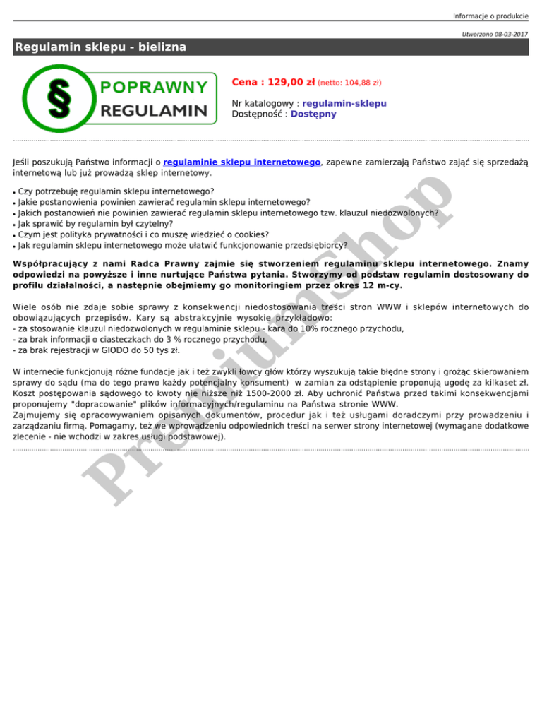 Informacje o produkcie Utworzono 08-03-2017 Regulamin sklepu - bielizna Cena : 129,00 zł (netto: 104,88 zł) Nr katalogowy : regulamin-sklepu Dostępność : Dostępny Jeśli poszukują Państwo informacji o regulaminie sklepu internetowego, zapewne zamierzają Państwo zająć się sprzedażą internetową lub już prowadzą sklep internetowy. ● ● ● ● Czy potrzebuję regulamin sklepu internetowego? Jakie postanowienia powinien zawierać regulamin sklepu internetowego? Jakich postanowień nie powinien zawierać regulamin sklepu internetowego tzw. klauzul niedozwolonych? Jak sprawić by regulamin był czytelny? Czym jest polityka prywatności i co muszę wiedzieć o cookies? Jak regulamin sklepu internetowego może ułatwić funkcjonowanie przedsiębiorcy? p ● Sh o ● Współpracujący z nami Radca Prawny zajmie się stworzeniem regulaminu sklepu internetowego. Znamy odpowiedzi na powyższe i inne nurtujące Państwa pytania. Stworzymy od podstaw regulamin dostosowany do profilu działalności, a następnie obejmiemy go monitoringiem przez okres 12 m-cy. iu m Wiele osób nie zdaje sobie sprawy z konsekwencji niedostosowania treści stron WWW i sklepów internetowych do obowiązujących przepisów. Kary są abstrakcyjnie wysokie przykładowo: - za stosowanie klauzul niedozwolonych w regulaminie sklepu - kara do 10% rocznego przychodu, - za brak informacji o ciasteczkach do 3 % rocznego przychodu, - za brak rejestracji w GIODO do 50 tys zł. Pr em W internecie funkcjonują różne fundacje jak i też zwykli łowcy głów którzy wyszukują takie błędne strony i grożąc skierowaniem sprawy do sądu (ma do tego prawo każdy potencjalny konsument) w zamian za odstąpienie proponują ugodę za kilkaset zł. Koszt postępowania sądowego to kwoty nie niższe niż 1500-2000 zł. Aby uchronić Państwa przed takimi konsekwencjami proponujemy "dopracowanie" plików informacyjnych/regulaminu na Państwa stronie WWW. Zajmujemy się opracowywaniem opisanych dokumentów, procedur jak i też usługami doradczymi przy prowadzeniu i zarządzaniu firmą. Pomagamy, też we wprowadzeniu odpowiednich treści na serwer strony internetowej (wymagane dodatkowe zlecenie - nie wchodzi w zakres usługi podstawowej).