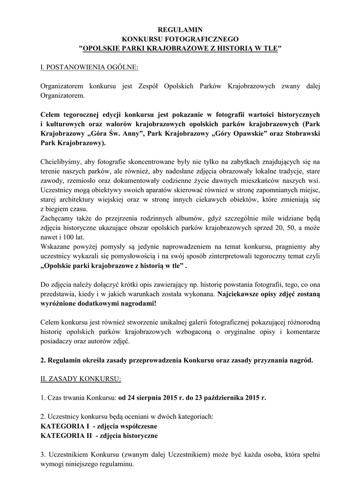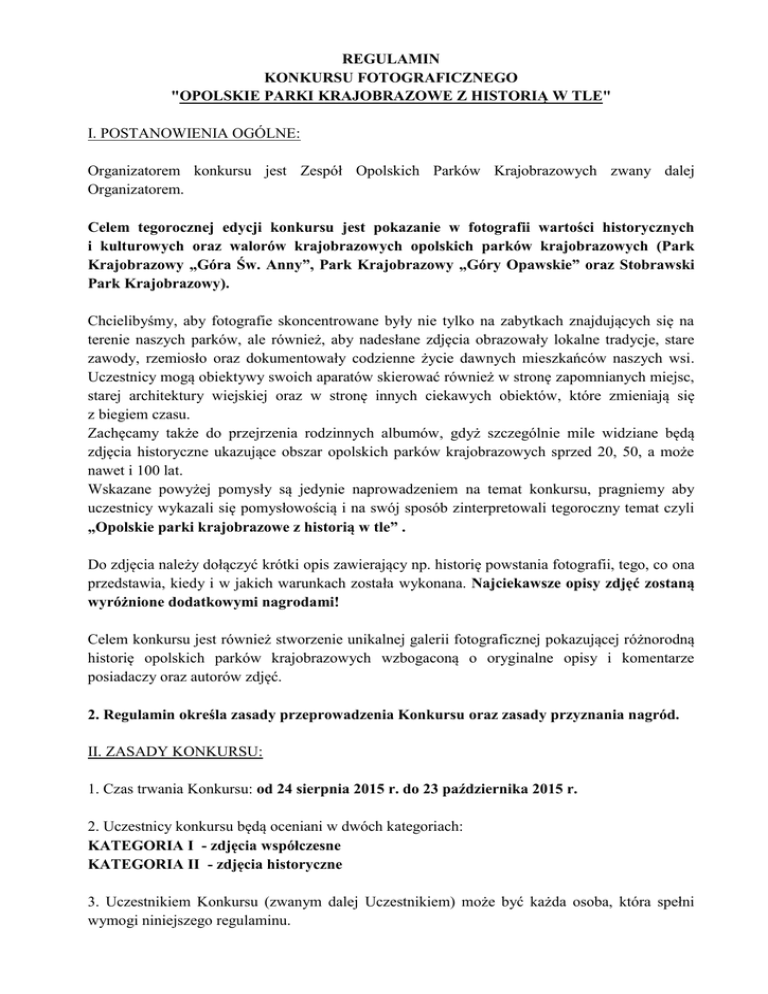 REGULAMIN KONKURSU FOTOGRAFICZNEGO "OPOLSKIE PARKI KRAJOBRAZOWE Z HISTORIĄ W TLE" I. POSTANOWIENIA OGÓLNE: Organizatorem konkursu jest Zespół Opolskich Parków Krajobrazowych zwany dalej Organizatorem. Celem tegorocznej edycji konkursu jest pokazanie w fotografii wartości historycznych i kulturowych oraz walorów krajobrazowych opolskich parków krajobrazowych (Park Krajobrazowy „Góra Św. Anny”, Park Krajobrazowy „Góry Opawskie” oraz Stobrawski Park Krajobrazowy). Chcielibyśmy, aby fotografie skoncentrowane były nie tylko na zabytkach znajdujących się na terenie naszych parków, ale również, aby nadesłane zdjęcia obrazowały lokalne tradycje, stare zawody, rzemiosło oraz dokumentowały codzienne życie dawnych mieszkańców naszych wsi. Uczestnicy mogą obiektywy swoich aparatów skierować również w stronę zapomnianych miejsc, starej architektury wiejskiej oraz w stronę innych ciekawych obiektów, które zmieniają się z biegiem czasu. Zachęcamy także do przejrzenia rodzinnych albumów, gdyż szczególnie mile widziane będą zdjęcia historyczne ukazujące obszar opolskich parków krajobrazowych sprzed 20, 50, a może nawet i 100 lat. Wskazane powyżej pomysły są jedynie naprowadzeniem na temat konkursu, pragniemy aby uczestnicy wykazali się pomysłowością i na swój sposób zinterpretowali tegoroczny temat czyli „Opolskie parki krajobrazowe z historią w tle” . Do zdjęcia należy dołączyć krótki opis zawierający np. historię powstania fotografii, tego, co ona przedstawia, kiedy i w jakich warunkach została wykonana. Najciekawsze opisy zdjęć zostaną wyróżnione dodatkowymi nagrodami! Celem konkursu jest również stworzenie unikalnej galerii fotograficznej pokazującej różnorodną historię opolskich parków krajobrazowych wzbogaconą o oryginalne opisy i komentarze posiadaczy oraz autorów zdjęć. 2. Regulamin określa zasady przeprowadzenia Konkursu oraz zasady przyznania nagród. II. ZASADY KONKURSU: 1. Czas trwania Konkursu: od 24 sierpnia 2015 r. do 23 października 2015 r. 2. Uczestnicy konkursu będą oceniani w dwóch kategoriach: KATEGORIA I - zdjęcia współczesne KATEGORIA II - zdjęcia historyczne 3. Uczestnikiem Konkursu (zwanym dalej Uczestnikiem) może być każda osoba, która spełni wymogi niniejszego regulaminu. 4. Przystąpienie do Konkursu następuje przez zgłoszenie prac fotograficznych. 5. Zdjęcia przesyłane na konkurs muszą być wykonane na terenie opolskich parków krajobrazowych (PK Góra Św. Anny, PK Góry Opawskie, Stobrawski PK). 6. Każdy uczestnik może przesłać max. 5 prac pojedynczych. 7. Format prac: prace w formacie JPG o wymiarach min 1200x1600 pikseli, w plikach nie przekraczających 5 MB. 8. W przypadku zdjęć historycznych prosimy o przesłanie skanu o jak najlepszej jakości (prosimy o nie przesyłanie oryginałów zdjęć). 9. Zabronione jest stosowanie technik fałszowania rzeczywistości, w szczególności fotomontażu. 10. Konkursowe prace należy nadsyłać na adres: [email protected] w formie załączników do listu elektronicznego, wiadomość należy zatytułować KONKURS FOTOGRAFICZNY 2015 bądź dostarczyć pocztą lub osobiście na płycie CD/DVD do siedziby Zespołu Opolskich Parków Krajobrazowych oddział w Ładzy, ul. Reymonta 3, 46-034 Pokój. 11. Do każdego zdjęcia należy dołączyć wypełnioną, podpisaną i zeskanowaną kartę zgłoszenia zdjęcia będącą załącznikiem nr 1 do niniejszego regulaminu. 12. Termin nadsyłania prac upływa z dniem 23 października 2015 r. Decyduje data dotarcia prac do Organizatora. Prace, które zostaną dostarczone po terminie nie będą brały udziału w konkursie. III. PRAWA AUTORSKIE 1. Fotografie nadesłane, nagrodzone, wyróżnione i wybrane do ekspozycji pokonkursowej mogą być wykorzystane przez Organizatora, który ma prawo do nieodpłatnego wykorzystania ich do celów promocyjnych i edukacyjnych. 2. W przypadku pełnoletnich uczestników konkursu, osoby te składając swój podpis na karcie zgłoszenia, oświadczają, że: a/ w przypadku gdy uczestnik sam jest autorem fotografii, że wykonał fotografię osobiście i posiada pełnię praw autorskich do fotografii i przenosi je na Organizatora w zakresie niezbędnym do jej publikacji lub innego rozpowszechnienia. b/ w przypadku gdy uczestnik konkursu nie jest autorem zdjęcia, że przysługuje mu pełnia praw autorskich do fotografii i przenosi je na Organizatora w zakresie niezbędnym do jej publikacji lub innego rozpowszechnienia. 3. W przypadku uczestników niepełnoletnich (poniżej 18 roku życia) zgłoszenie winno być potwierdzone zgodą ich opiekunów prawnych, a nadto: a/ w przypadku uczestników niepełnoletnich (poniżej 18 roku życia) nie będących autorami fotografii wymagane jest przedłożenie oświadczenia osoby posiadającej prawa autorskie do fotografii, że posiada pełnię praw autorskich do fotografii i przenosi je na Organizatora w zakresie niezbędnym do jej publikacji lub innego rozpowszechnienia. b/ w przypadku uczestników niepełnoletnich (poniżej 18 roku życia) będących autorami fotografii wymagane jest przedłożenie oświadczenia ich opiekunów prawnych, że niepełnoletni uczestnik jest autorem fotografii i że wyrażają oni zgodę na przeniesienie na Organizatora praw autorskich do tej fotografii w zakresie niezbędnym do jej publikacji lub innego rozpowszechnienia. 4. Przeniesienie praw o jakich mowa w pkt. 2 i 3 dotyczy praw majątkowych i dokonane jest nieodpłatnie na rzecz Organizatora bez ograniczeń czasowych i terytorialnych, na polach eksploatacji wskazanych w art. 50 Ustawy o prawie autorskim i prawach pokrewnych z dn. 4 lutego 1994 r. (Dz. U. z 2006 nr 90 poz. 631 z późn. zm.), w tym w szczególności w zakresie reprodukowania techniką drukarską i cyfrową, publikowania, wystawiania, udostępniania na stronie internetowej Organizatora oraz we wszelkich materiałach promocyjnych, informacyjnych i reklamowych, bez w
