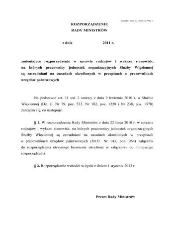projekt z dnia 22 czerwca 2011 r. ROZPORZĄDZENIE RADY MINISTRÓW z dnia 2011 r. zmieniające rozporządzenie w sprawie rodzajów i wykazu stanowisk, na których pracownicy jednostek organizacyjnych Służby Więziennej są zatrudniani na zasadach określonych w przepisach o pracownikach urzędów państwowych Na podstawie art. 31 ust. 2 ustawy z dnia 9 kwietnia 2010 r. o Służbie Więziennej (Dz. U. Nr 79, poz. 523, Nr 182, poz. 1228 i Nr 238, poz. 1578) zarządza się, co następuje: § 1. W rozporządzeniu Rady Ministrów z dnia 22 lipca 2010 r. w sprawie rodzajów i wykazu stanowisk, na których pracownicy jednostek organizacyjnych Służby Więziennej są zatrudniani na zasadach określonych w przepisach o pracownikach urzędów państwowych (Dz.U. Nr 143, poz. 964) załącznik do rozporządzenia otrzymuje brzmienie określone w załączniku do niniejszego rozporządzenia. § 2. Rozporządzenie wchodzi w życie z dniem 1 stycznia 2012 r. Prezes Rady Ministrów Załącznik do rozporządzenia Rady Ministrów z dnia ........................................ 2011 r. (poz. ............) RODZAJE I WYKAZ STANOWISK W JEDNOSTKACH ORGANIZACYJNYCH SŁUŻBY WIĘZIENNEJ, NA KTÓRYCH ZATRUDNIA SIĘ PRACOWNIKÓW NA ZASADACH OKREŚLONYCH W USTAWIE O PRACOWNIKACH URZĘDÓW PAŃSTWOWYCH Lp. 1 Jednostka organizacyjna Służby Więziennej Centralny Zarząd Służby Więziennej Stanowiska kierownicze Stanowiska samodzielne Stanowiska dydaktyczne - 1) Dyrektor 1) doradca Dyrektora Generalnego Służby Więziennej, 2) radca prawny, 3) audytor wewnętrzny, 4) główny specjalisty ds. legislacji, 5) główny specjalista, 6) specjalista ds. legislacji, 7) główny rewident, 8) starszy rewident 9) rewident, 10) rzecznik prasowy 2 Okręgowy inspektorat Służby Więziennej Generalny Służby Więziennej, 2) dyrektor biura, 3) główny księgowy Służby Więziennej, 4) główny księgowy Centralnego Zarządu Służby Więziennej, 5) zastępca dyrektora biura, 6) naczelny lekarz więziennictwa, 7) naczelnik wydziału, 8) kierownik zespołu, 9) naczelny kapelan 1) główny księgowy, 2) naczelny lekarz 3 Centralny Ośrodek Szkolenia Służby Więziennej, ośrodek szkolenia i ośrodek doskonalenia kadr Służby Więziennej 1) kierownik 1) radca prawny, 2) audytor zakładu, wewnętrzny 2) główny księgowy, 3) kierownik działu, 4) zastępca kierownika działu 1) audytor wewnętrzny, 2) radca prawny, 3) rzecznik prasowy 2 Stanowiska administracyjne 1) starszy 2) 3) 4) 5) 6) 7) 8) - 1) starszy wykładowca, 2) wykładowca, 3) starszy psycholog, 4) psycholog Stanowiska penitencjarne - specjalista specjalista, starszy inspektor inspektor, informatyk, instruktor, starszy referent referent 1) starszy specjalista 2) specjalista, 3) starszy rewident, 4) rewident, 5) starszy inspektor, 6) inspektor, 7) instruktor, 8) informatyk, 9) starszy referent, 10) referent - 1) specjalista, 2) starszy inspektor, 3) inspektor, 4) instruktor, 5) informatyk, - 6) starszy referent, 7) referent 4 Areszt śledczy lub zakład karny 1) główny księgowy, 2) kierownik działu, 3) zastępca kierownika działu 1) radca prawny 2) audytor wewnętrzny 3 - 1) specjalista, 2) starszy inspektor, 3) inspektor, 4) instruktor, 5) informatyk, 6) starszy referent, 7) referent 1) starszy psycholog, 2) psycholog, 3) młodszy psycholog, 4) starszy wychowawca, 5) wychowawca, 6) młodszy wychowawca, 7) starszy terapeuta, 8) terapeuta, 9) młodszy terapeuta, 10) kapelan UZASADNIENIE Projektowane rozporządzenie jest wykonaniem upoważnienia zawartego w art. 31 ust. 2 ustawy z dnia 9 kwietnia 2010 r. o Służbie Więziennej (Dz. U. Nr 79, poz. 523). Potrzeba i cel nowelizacji obowiązującego aktu wynika z konieczności uzupełnienia stanowisk służbowych w załączniku do rozporządzenia, o stanowiska występujące w Służbie Więziennej, na których pracownicy są zatrudniani na podstawie przepisów wydanych z upoważnienia ustawy z dnia 26 czerwca 1974 r. – Kodeks pracy, a których nie uwzględnia wykaz stanowisk, określony w rozporządzeniu Rady Ministrów z dnia 22 lipca 2010 r. w sprawie rodzajów i wykazu stanowisk, na których pracownicy jednostek organizacyjnych Służby Więziennej są zatrudniani na zasadach określonych w przepisach o pracownikach urzędów państwowych (Dz.U. Nr 143, poz. 964). Wykaz stanowisk, który wszedł w życie z dniem 13 sierpnia 2010 r., został opracowany w oparciu o obowiązujące rozporządzenie Ministra Pracy i Polityki Socjalnej z dnia 22 kwietnia 2008 r. w sprawie warunków wynagradzania za pracę i przyznawania innych świadczeń związanych z pracą dla pracowników zatrudnionych w niektórych jednostkach organizacyjnych resortu sprawiedliwości (Dz. U. Nr 73, poz. 434 z późn.zm.), aby w konsekwencji pracownicy zatrudnieni na zasadach Kodeksu pracy, „przeszli” na stanowiska, na których zatrudnienie nastąpi na zasadach ustawy o pracownikach urzędów państwowych. Należało mieć jednak na uwadze okoliczność, że z dniem 1 kwietnia 2011 r. Minister Pracy i Polityki Społecznej rozporządzeniem z dnia 24 lutego 2011 r. zmienił ww. rozporządzenie z dnia 22 kwietnia 2008 r., wprowadzając zmiany w dotychczasowym wykazie stanowisk pracowników cywilnych więziennictwa, np.; zmiany nazwy stanowiska kapelana na naczelnego kapelana w Centralnym Zarządzie Służby Więziennej stanowisko instruktora we wszystkich jednostkach organizacyjnych Służby Więziennej, audytora w Centralnym Ośrodku Szkolenia Służby Więziennej, ośrodkach szkolenia i ośrodkach doskonalenia kadr Służby Więziennej oraz aresztach śledczych i zakładach karnych, stanowiska w Centralnym Ośrodku Szkolenia Służby Więziennej, ośrodkach szkolenia i ośrodkach doskonalenia kadr Służby Więziennej – w tym psychologa, którego nie było w wykazie w rozporządzeniu z dnia 22 lipca 2010 r. Wykaz stanowisk stanowiący załącznik do projektu rozporządzenia powinien zostać uzupełniony o stanowiska wynikające z nowelizacji p