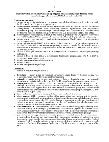 1 REGULAMIN Przyznawania dofinansowania na podjęcie działalności gospodarczej przez bezrobotnego, absolwenta CIS lub absolwenta KIS Podstawa prawna: 1. ustawa z dnia 20 kwietnia 2004 r. o promocji zatrudnienia i instytucjach rynku pracy (t.j. Dz. U. z 2008 r. nr 69, poz. 415 z późn. zm.); 2. rozporządzenie Ministra Pracy i Polityki Społecznej z dnia 23 kwietnia 2012 r. w sprawie dokonywania z Funduszu Pracy refundacji kosztów wyposażenia lub doposażenia stanowiska pracy dla skierowanego bezrobotnego oraz przyznawania bezrobotnemu środków na podjęcie działalności gospodarczej (Dz. U. z 26 kwietnia 2012 r., poz. 457); 3. rozporządzenie Komisji (WE) nr 1998/2006 z dnia 15 grudnia 2006 r. w sprawie stosowania art. 87 i 88 Traktatu WE do pomocy de minimis (Dz. Urz. UE L 379 z 28.12.2006, str. 5); 4. ustawa z dnia 13 czerwca 2003 r. o zatrudnieniu socjalnym (Dz. U. z 2011 r. Nr 43, poz. 225 i Nr 205, poz. 1211); 5. rozporządzenie Komisji (WE) nr 875/2007 z dnia 24 lipca 2007 r. w sprawie stosowania art. 87 i 88 Traktatu WE w odniesieniu do pomocy w ramach zasady de minimis dla sektora rybołówstwa i zmieniające rozporządzenie (WE) nr 1860/2004 (Dz. Urz. UE L 193 z 25.07.2007, str. 6); 6. ustawa z dnia 30 kwietnia 2004 r. o postępowaniu w sprawach dotyczących pomocy publicznej; 7. ustawa z dnia 02 lipca 2004 r. o swobodzie działalności gospodarczej (Dz. U. z 2007 r. nr 155, poz. 1095, z późn. zm.). 8. kodeks postępowania administracyjnego; 9. kodeks cywilny; 10. kodeks postępowania cywilnego. Definicje: Ilekroć w Regulaminie jest mowa o: 1. Urzędzie – należy przez to rozumieć Powiatowy Urząd Pracy w Zielonej Górze, Filię w Sulechowie lub Filię w Nowogrodzie Bobrzańskim; 2. ustawie – należy przez to rozumieć ustawę z dnia 20 kwietnia 2004 r. o promocji zatrudnienia i instytucjach rynku pracy (t.j. Dz. U. z 2008 r. nr 69, poz. 415 z późn. zm.); 3. rozporządzeniu – należy przez to rozumieć rozporządzenie Ministra Pracy i Polityki Społecznej z dnia 23 kwietnia 2012 r. w sprawie dokonywania z Funduszu Pracy refundacji kosztów wyposażenia lub doposażenia stanowiska pracy dla skierowanego bezrobotnego oraz przyznawania środków na podjęcie działalności gospodarczej (Dz. U. z 26 kwietnia 2012 r., poz. 457); 4. bezrobotnym – oznacza to osobę spełniającą przesłanki art. 2 ustawy; 5. absolwencie CIS – oznacza osobę, która przez okres nie krótszy niż 6 miesięcy uczestniczyła w zajęciach centrum integracji społecznej i otrzymała zaświadczenie (wydane uczestnikowi przez kierownika CIS potwierdzające uczestnictwo w zajęciach i umiejętności nabyte w ramach reintegracji zawodowej i społecznej), osoba ta jest absolwentem przez okres 6 miesięcy od dnia zakończenia zajęć w CIS; 6. absolwencie KIS - oznacza osobę, która uczestniczyła w klubie integracji społecznej przez okres nie krótszy niż 6 miesięcy, posiada ważne zaświadczenie (wydane na wniosek osoby, która uczestniczyła w KIS, przez podmiot prowadzący KIS i zachowuje ważność w terminie 4 miesięcy od daty wystawienia)oraz realizowała postanowienia kontraktu socjalnego; 7. przeciętnym wynagrodzeniu – należy przez to rozumieć przeciętne wynagrodzenie w poprzednim kwartale od pierwszego dnia następnego miesiąca po ogłoszeniu przez Prezesa Głównego Urzędu Statystycznego w Dzienniku Urzędowym Rzeczpospolitej Polskiej „Monitor Polski”, na podstawie art. 20 pkt 2 ustawy z dnia 17 grudnia 1998 r. o emeryturach i rentach z Funduszu Ubezpieczeń Społecznych (Dz. U. z 2004r. nr 39, poz. 353, z późn. zm.). 1 Powiatowy Urząd Pracy w Zielonej Górze 2 Rozdział I Ogólne zasady przyznawania bezrobotnemu środków na podjęcie działalności gospodarczej §1 1. Zgodnie z art. 46 ust. 1 pkt. 2 ustawy oraz rozporządzeniem, Starosta może ze środków Funduszu Pracy przyznać bezrobotnemu, absolwentowi CIS lub absolwentowi KIS, jednorazowo środki na podjęcie działalności gospodarczej, w tym na pokrycie kosztów pomocy prawnej, konsultacji i doradztwa związane z podjęciem tej działalności gospodarczej, w wysokości określonej w umowie, nie wyżej jednak niż 6-krotna wysokość przeciętnego wynagrodzenia. 2. Środki, o których mowa w ust. 1 przyznaje z upoważnienia Starosty – Dyrektor lub Zastępca Dyrektora Powiatowego Urzędu Pracy w Zielonej Górze. Przyznanie środków następuje na podstawie umowy zawartej pomiędzy Dyrektorem Urzędu, a bezrobotnym, absolwentem CIS lub absolwentem KIS. §2 O przyznanie środków na podjęcie działalności gospodarczej może ubiegać się bezrobotny, absolwent CIS lub absolwent KIS, zarejestrowany w Urzędzie, który spełnia następujące warunki: a. nie posiadał wpisu do ewidencji działalności gospodarczej w okresie 12 miesięcy bezpośrednio poprzedzających dzień złożenia wniosku o dofinansowanie na rozpoczęcie działalności gospodarczej; b. nie otrzymał dotychczas z Funduszu Pracy lub z innych środków publicznych bezzwrotnych środków na podjęcie działalności gospodarczej lub rolniczej, założenie lub przystąpienie do spółdzielni socjalnej; c. nie złożył wniosku o przyznanie jednorazowo środków na podjęcie działalności gospodarczej lub przyznanie jednorazowo środków na założenie lub przystąpienie do spółdzielni socjalnej do innego starosty; d. nie był w okresie 2 lat przed dniem złożenia wniosku karany za przestępstwa przeciwko obrotowi gospodarczemu, w rozumieniu ustawy z dnia 06 czerwca 1997 r. – Kodeks karny (Dz.U. Nr 88, poz. 553, z późn. zm.) lub ustawy z dnia 28 października 2002 r. o odpowiedzialności podmiotów zbiorowych za czyny zabronione pod groźbą kary (Dz.U. Nr 197, poz. 1661, z późn. zm.); e. spełnia warunki rozporządzenia Komisji (WE) nr 1998/2006 z dnia 15 grudnia 2006 r. w sprawie stosowania art. 87 i 88 Traktatu WE w odniesieniu do pomocy de minimis; f. spełnia warunki Rozporządzenia Ministra Pracy i Polityki Społecznej z dni