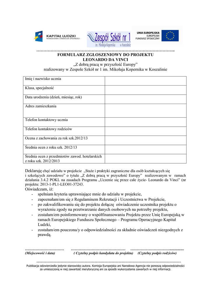 …………………………………………………………………………………….. FORMULARZ ZGŁOSZENIOWY DO PROJEKTU LEONARDO DA VINCI „Z dobrą pracą w przyszłość Europy” realizowany w Zespole Szkół nr 1 im. Mikołaja Kopernika w Koszalinie Imię i nazwisko ucznia Klasa, specjalność Data urodzenia (dzień, miesiąc, rok) Adres zamieszkania Telefon kontaktowy ucznia Telefon kontaktowy rodziców Ocena z zachowania za rok szk.2012/13 Średnia ocen z roku szk. 2012/13 Średnia ocen z przedmiotów zawod. hotelarskich z roku szk. 2012/2013 Deklaruję chęć udziału w projekcie „StaŜe i praktyki zagraniczne dla osób kształcących się i szkolących zawodowo” o tytule „Z dobrą pracą w przyszłość Europy” realizowanym w ramach działania 3.4.2 POKL na zasadach Programu „Uczenie się przez całe Ŝycie- Leonardo da Vinci” (nr projektu: 2013-1-PL1-LEO01-37243. Oświadczam, iŜ: - spełniam kryteria uprawniające mnie do udziału w projekcie, - zapoznałam/em się z Regulaminem Rekrutacji i Uczestnictwa w Projekcie, - po zakwalifikowaniu się do projektu dołączę oświadczenie uczestnika projektu o wyraŜeniu zgody na przetwarzanie danych osobowych na potrzeby projektu, - zostałam/em poinformowany o współfinansowaniu Projektu przez Unię Europejską w ramach Europejskiego Funduszu Społecznego – Programu Operacyjnego Kapitał Ludzki, - zostałam/em pouczona/y o odpowiedzialności za składnie oświadczeń niezgodnych z prawdą. ………………………… (Miejscowość i data) …………………………………… …………………………............... ( Czytelny podpis kandydata do projektu) (Czytelny podpis rodziców) -----------------------------------------------------------------------------------------------------Publikacja odzwierciedla jedynie stanowisko autora. Komisja Europejska ani Narodowa Agencja nie ponoszą odpowiedzialności za umieszczoną w niej zawartość merytoryczną ani za sposób wykorzystania zawartych w niej informacji. …………………………………………………………………………………………………………………… Wypełnia Komisja Rekrutacyjna: Ilość punktów Ocena z zachowania z roku szk. 2012/13 Średnia ocen z roku szk. 2012/13 Średnia ocen z przedmiotów hotelarskich roku szk. 2012/13 Wynik testu z języka angielskiego (%) z Rozmowa kwalifikacyjna ___ Opinia wychowawcy ___ Dodatkowe punkty (sytuacja ekonomiczna ucznia) Suma punktów: (Miejscowość i data) ………………………………… ( Czytelne podpisy członków Komisji Rekrutacyjnej) 1. ………………………………………..... 2. ………………………………………..... 3. …………………………………………. 4. …………………………………………. 5. …………………………………………. -----------------------------------------------------------------------------------------------------Publikacja odzwierciedla jedynie stanowisko autora. Komisja Europejska ani Narodowa Agencja nie ponoszą odpowiedzialności za umieszczoną w niej zawartość merytoryczną ani za sposób wykorzystania zawartych w niej informacji.