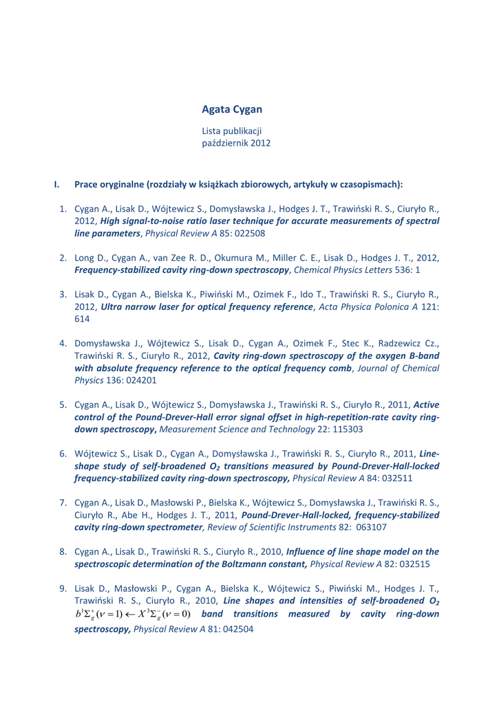 Agata Cygan Lista publikacji październik 2012 I. Prace oryginalne (rozdziały w książkach zbiorowych, artykuły w czasopismach): 1. Cygan A., Lisak D., Wójtewicz S., Domysławska J., Hodges J. T., Trawiński R. S., Ciuryło R., 2012, High signal-to-noise ratio laser technique for accurate measurements of spectral line parameters, Physical Review A 85: 022508 2. Long D., Cygan A., van Zee R. D., Okumura M., Miller C. E., Lisak D., Hodges J. T., 2012, Frequency-stabilized cavity ring-down spectroscopy, Chemical Physics Letters 536: 1 3. Lisak D., Cygan A., Bielska K., Piwiński M., Ozimek F., Ido T., Trawiński R. S., Ciuryło R., 2012, Ultra narrow laser for optical frequency reference, Acta Physica Polonica A 121: 614 4. Domysławska J., Wójtewicz S., Lisak D., Cygan A., Ozimek F., Stec K., Radzewicz Cz., Trawiński R. S., Ciuryło R., 2012, Cavity ring-down spectroscopy of the oxygen B-band with absolute frequency reference to the optical frequency comb, Journal of Chemical Physics 136: 024201 5. Cygan A., Lisak D., Wójtewicz S., Domysławska J., Trawiński R. S., Ciuryło R., 2011, Active control of the Pound-Drever-Hall error signal offset in high-repetition-rate cavity ringdown spectroscopy, Measurement Science and Technology 22: 115303 6. Wójtewicz S., Lisak D., Cygan A., Domysławska J., Trawiński R. S., Ciuryło R., 2011, Lineshape study of self-broadened O2 transitions measured by Pound-Drever-Hall-locked frequency-stabilized cavity ring-down spectroscopy, Physical Review A 84: 032511 7. Cygan A., Lisak D., Masłowski P., Bielska K., Wójtewicz S., Domysławska J., Trawiński R. S., Ciuryło R., Abe H., Hodges J. T., 2011, Pound-Drever-Hall-locked, frequency-stabilized cavity ring-down spectrometer, Review of Scientific Instruments 82: 063107 8. Cygan A., Lisak D., Trawiński R. S., Ciuryło R., 2010, Influence of line shape model on the spectroscopic determination of the Boltzmann constant, Physical Review A 82: 032515 9. Lisak D., Masłowski P., Cygan A., Bielska K., Wójtewicz S., Piwiński M., Hodges J. T., Trawiński R. S., Ciuryło R., 2010, Line shapes and intensities of self-broadened O2 b1 g ( 1) X 3 g ( 0) band transitions measured by cavity ring-down spectroscopy, Physical Review A 81: 042504 10. Masłowski P., Bielska K., Cygan A., Domysławska J., Lisak D., Ciuryło R., Bielski A., Trawiński R. S., 2009, The hyperfine and isotope structure of the Cd intercombination line – revisited, European Physical Journal D 51: 295-302 11. Masłowski P., Bielska K., Cygan A., Ciuryło R., Trawiński R. S., Problemy metrologii elektronicznej i fotonicznej 2, [w:] Rola pomiaru częstotliwości w pomiarach i analizie kształtu linii widmowych, Mroczek J., Oficyna Wydawnicza Politechniki Wrocławskiej, Wrocław 2009: 387-463. 12. Masłowski P., Bielska K., Cygan A., Domysławska J., Lisak D., Ciuryło R., Szudy J., Trawiński R. S., Spectral Line Shapes vol. 15, [w:] Isotope structure and hyperfine splitting of 326.1 nm 113Cd line, Gonzalez M. A., Gigosos M. A., AIP Press, New York 2008: 243-245. 13. Masłowski P., Bielska K., Cygan A., Domysławska J., Lisak D., Ciuryło R., Szudy J., Trawiński R. S., Spectral Line Shapes vol. 15, [w:] Line shape study of the 326.1 nm 113Cd line perturbed by Ar and Xe, Gonzalez M. A., Gigosos M. A., AIP Press, New York 2008: 240-242. II. Prace pokonferencyjne i doniesienia zjazdowe: 1. Cygan A., Lisak D., Wójtewicz S., Domysławska J., Hodges J. T., Trawiński R. S., Ciuryło R., 2012, Demonstration of the extremely high signal-to-noise ratio and advanced O2 Bband lines shape analysis in PDH-locked FS-CRDS experiment, J. Phys. Conf. Ser. 397: 012046-1 2. Domysławska J., Wójtewicz S., Lisak D., Cygan A., Ozimek F., Stec K., Bielska K., Masłowski P., Radzewicz Cz., Trawiński R. S., Ciuryło R., 2012, Transition frequencies of oxygen Bband lines measured with optical frequency comb assisted cavity ring-down spectroscopy, J. Phys. Conf. Ser. 397: 012045-1 3. Wójtewicz S., Stec K., Masłowski P., Cygan A., Lisak D., Trawiński R. S., Ciuryło R., 2012, Application of near infrared cavity ring-down spectroscopy to line-shape study of carbon monoxide second overtone transitions, 12th International HITRAN Conference, Reims, Francja. 4. Long D. A., Bielska K., Cygan A., Havey D. K., Okumura M., Miller C., Lisak D., Hodges J. T., 2011, High accuracy laboratory spectroscopy to support active greenhouse gas sensing, American Geophysical Union, Fall Meeting, San Francisco, USA. 5. Cygan A., Lisak D., Trawiński R. S., Ciuryło R., 2010, Spectral Line shape problem in the spectroscopic determination of the Boltzmann constant, AIP Conf. Proc. 1290: 214-218. 6. Cygan A., Lisak D., Masłowski P., Bielska K., Wójtewicz S., Domysławska J., Abe H., Hodges J. T., Trawiński R. S., Ciuryło R., 2010, Frequency-stabilized cavity ring-down spectroscopy with a PDH lock, AIP Conf. Proc. 1290: 204-208. 7. Lisak D., Masłowski P., Cygan A., Bielska K., Wójtewicz S., Piwiński M., Hodges J. T., Trawiński R. S., Ciuryło R., 2010, CRDS investigation of Line shapes and intensities of the oxygen B-band transitions at low pressures, AIP Conf. Proc. 1290: 174-178. III. Prace popularno-naukowe: 1. Cygan A., Kopczyński M., Trawiński R. S., 2010, Ile wiemy o atmosferze ziemskiej?, Nauczanie Przedmiotów Przyrodniczych 35: 6-12