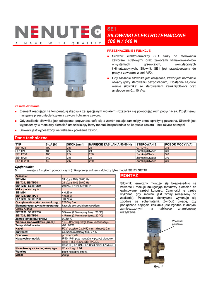 SE1 SIŁOWNIKI ELEKTROTERMICZNE 100 N / 140 N PRZEZNACZENIE I FUNKCJE ■ Siłownik elektrotermiczny SE1 służy do sterowania zaworami strefowymi oraz zaworami klimakonwektorów w systemach grzewczych, wentylacyjnych i klimatyzacyjnych. Siłownik SE1 jest przystosowany do pracy z zaworami z serii VFX. ■ Gdy zasilanie siłownika jest odłączone, zawór jest normalnie otwarty (przy sterowaniu bezpośrednim). Dostępne są dwie wersje siłownika: ze sterowaniem Zamknij/Otwórz oraz analogowym 0…10 VDC. Zasada działania ■ Element reagujący na temperaturę (kapsuła ze specjalnym woskiem) rozszerza się powodując ruch popychacza. Dzięki temu, następuje przesunięcie trzpienia zaworu i otwarcie zaworu. ■ Gdy zasilanie siłownika jest odłączone, popychacz cofa się a zawór zostaje zamknięty przez sprężynę powrotną. Siłownik jest wyposażony w metalowy pierścień umożliwiający łatwy montaż bezpośrednio na korpusie zaworu – bez użycia narzędzi. ■ Siłownik jest wyposażony we wskaźnik położenia zaworu. Dane techniczne TYP SIŁA [N] SKOK [mm] NAPIĘCIE ZASILANIA 50/60 Hz STEROWANIE POBÓR MOCY [VA] SE1M24 SE1T24 SE1T230 SE1TP24 SE1TP230 100 100 100 140 140 2.5 2.5 2.5 2.5 2.5 24 24 230 24 230 0...10 VDC Zamknij/Otwórz Zamknij/Otwórz Zamknij/Otwórz Zamknij/Otwórz 3,5 3,0 3,0 3,0 3,0 Opcjonalnie: S wersja z 1 stykiem pomocniczym (mikroprzełącznikiem), dotyczy tylko modeli SE1T i SE1TP Zasilanie: SE1M24 SE1T24, SE1TP24 SE1T230, SE1TP230 Maks. pobór prądu: SE1M24 SE1T24, SE1TP24 SE1T230, SE1TP230 Obciążalność styku pomocniczego: Element reagujący na temperaturę: Czasy ruchu: SE1T230, SE1TP230 SE1T24, SE1TP24 Zakres temperatur pracy: Warunki środowiskowe (praca): Temp. składowania: Kabel: przyłącze: Obudowa: Klasa ochronności: Klasa tworzywa samogasnącego Wymiary: Masa: 24 VAC ± 10% 50/60 Hz 24 VAC ± 10% 50/60 Hz 230 VAC ± 10% 50/60 Hz < 0,25 A < 0,25 A < 0,70 A 250 VAC 3 A kapsuła ze specjalnym woskiem 3,5 min. (2,5 mm przy temp. 20 °C) 4,5 min. (2,5 mm przy temp. 20 °C) 0...50 °C 10…90 % wilg. wzgl. (brak kondensacji) -20...70°C 2 PCV, przekrój 2 x 0,50 mm , długość 2 m pierścień metalowy M30 x 1,5 przezroczysta IP40, IP44 przy montażu w pozycji pionowej klasa II (SE1T230, SE1TP230), klasa III (SE1T24, SE1TP24 oraz SE1M24) V0 - V1 wg UL94 patrz następna strona 200 g MONTAŻ Siłownik termiczny montuje się bezpośrednio na zaworze i mocuje nakręcając metalowy pierścień do gwintowanej części korpusu. Czynności te trzeba wykonać, gdy siłownik jest zimny (odłączony od zasilania). Połączenia elektryczne wykonuje się zgodnie ze schematami. Zwrócić uwagę, czy podłączane napięcie zasilania jest zgodne z danymi zamieszczonymi na tabliczce znamionowej urządzenia. Wskaźnik położenia Rys. 1 SE1 SIŁOWNIKI ELEKTROTERMICZNE 100 N / 140 N POŁĄCZENIA ELEKTRYCZNE ORAZ WYMIARY [mm] SE1M24 WSPÓLNY Y (sygnał nastawczy) 0 ... 10 VDC 24 VAC Niebieski Czarny Brązowy SE1T24, SE1TP24 / SE1T230, SE1TP230 WSPÓLNY Niebieski 24/230 VAC SE1T24, SE1TP24/ Brązowy SE1T230, SE1TP230 SE1T24S, SE1TP24S / SE1T230S, SE1TP230S WSPÓLNY Niebieski 24/230 VAC SE1T24S, SE1TP24S/ Brązowy SE1T230S, SE1TP230S Styk Szary pomocniczy Czarny Zamknięta ścieżka A-AB zaworu, zestyk rozwarty Otwarta ścieżka A-AB zaworu, zestyk zwarty Wszystkie stwierdzenia, dane techniczne oraz zalecenia zamieszczone w niniejszym dokumencie mają jedynie charakter ogólny. W celu uzyskania informacji o specyficznych wymaganiach oraz doborze materiałów, dotyczących zamierzonego zastosowania, prosimy skontaktować się z przedstawicielem firmy NENUTEC lub producentem. Dane techniczne oraz konstrukcja wyrobu mogą ulec zmianie bez uprzedzenia.
