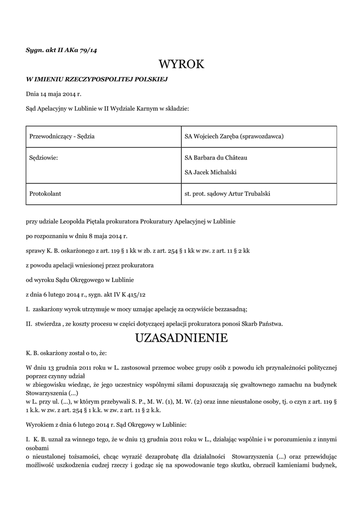 Sygn. akt II AKa 79/14 WYROK W IMIENIU RZECZYPOSPOLITEJ POLSKIEJ Dnia 14 maja 2014 r. Sąd Apelacyjny w Lublinie w II Wydziale Karnym w składzie: Przewodniczący - Sędzia SA Wojciech Zaręba (sprawozdawca) Sędziowie: SA Barbara du Château SA Jacek Michalski Protokolant st. prot. sądowy Artur Trubalski przy udziale Leopolda Piętala prokuratora Prokuratury Apelacyjnej w Lublinie po rozpoznaniu w dniu 8 maja 2014 r. sprawy K. B. oskarżonego z art. 119 § 1 kk w zb. z art. 254 § 1 kk w zw. z art. 11 § 2 kk z powodu apelacji wniesionej przez prokuratora od wyroku Sądu Okręgowego w Lublinie z dnia 6 lutego 2014 r., sygn. akt IV K 415/12 I. zaskarżony wyrok utrzymuje w mocy uznając apelację za oczywiście bezzasadną; II. stwierdza , ze koszty procesu w części dotyczącej apelacji prokuratora ponosi Skarb Państwa. UZASADNIENIE K. B. oskarżony został o to, że: W dniu 13 grudnia 2011 roku w L. zastosował przemoc wobec grupy osób z powodu ich przynależności politycznej poprzez czynny udział w zbiegowisku wiedząc, że jego uczestnicy wspólnymi siłami dopuszczają się gwałtownego zamachu na budynek Stowarzyszenia (...) w L. przy ul. (...), w którym przebywali S. P., M. W. (1), M. W. (2) oraz inne nieustalone osoby, tj. o czyn z art. 119 § 1 k.k. w zw. z art. 254 § 1 k.k. w zw. z art. 11 § 2 k.k. Wyrokiem z dnia 6 lutego 2014 r. Sąd Okręgowy w Lublinie: I. K. B. uznał za winnego tego, że w dniu 13 grudnia 2011 roku w L., działając wspólnie i w porozumieniu z innymi osobami o nieustalonej tożsamości, chcąc wyrazić dezaprobatę dla działalności Stowarzyszenia (...) oraz przewidując możliwość uszkodzenia cudzej rzeczy i godząc się na spowodowanie tego skutku, obrzucił kamieniami budynek, położony przy ul. (...) w L., stanowiący własność Miasta L., mieszczący siedzibę tego Stowarzyszenia, wskutek czego wybite zostały szyby w trzech oknach i uszkodzona została rama w jednym oknie, a wyrządzona w ten sposób szkoda wyniosła 1750 złotych, przy czym zachowanie oskarżonego polegało na rzuceniu kamieniem w drzwi budynku, oskarżony działał publicznie i z oczywiście błahego powodu, okazując przez to rażące lekceważenie porządku prawnego, tj. występku z art. 288 § 1 k.k. w zw. z art. 57a § 1 k.k. i za to skazał go na podstawie powołanych przepisów na karę 6 (sześć) miesięcy pozbawienia wolności; na podstawie art. 69 § 1, 2 i 4 k.k., art. 70 § 2 k.k., art. 73 § 2 k.k. wykonanie tej kary warunkowo zawiesił tytułem próby na okres 3 (trzech) lat, oddając oskarżonego w tym okresie pod dozór kuratora; na podstawie art. 71 § 1 k.k. w zw. z art. 33 § 1 i 3 k.k. wymierzył oskarżonemu grzywnę w wysokości 100 (sto) stawek dziennych, ustalając stawkę dzienną na kwotę 20 (dwadzieścia) złotych; na podstawie art. 57a § 2 k.k. orzekł od oskarżonego na rzecz Miasta L. nawiązkę w kwocie 1000 (tysiąc) złotych; II. zwolnił oskarżonego od zapłaty na rzecz Skarbu Państwa kosztów sądowych. Powyższy wyrok w całości zaskarżył na niekorzyść oskarżonego prokurator. W apelacji zarzucił: 1. obrazę prawa karnego materialnego, a mianowicie art. 288 § 1 kodeksu karnego, polegającą na niesłusznym jego zastosowaniu w konsekwencji błędnego uznania, że czyn oskarżonego K. B. wyczerpuje znamiona tego artykułu, podczas gdy prawidłowa analiza przeprowadzonych w toku postępowania przygotowawczego i sądowego dowodów i stanu faktycznego prowadzi do wniosku, że prawidłową kwalifikacją prawną czynu zarzucanego oskarżonemu winien być art. 119 § 1 kk w zb. z art. 254 § 1 kk w zw. z art. 11 § 2 kk 2. błąd w ustaleniach faktycznych przyjętych za podstawę wyroku, mający wpływ na jego treść, poprzez błędne zinterpretowanie materiału dowodowego, polegające na wyrażeniu poglądu, iż w świetle zebranych dowodów brak jest podstaw, pozwalających na przypisanie oskarżonemu K. B. zarzucanego mu przestępstwa z art. 19 § 1 kk w zb. z art. 254 § 1 kk w zw. z art. 11 § 2 kk i przypisanie mu występku z art. 288 § kk w zw. z art. 57a § 1 kk, w sytuacji gdy prawidłowa analiza całokształtu ustalonych okoliczności przedmiotowego zdarzenia – prowadzi nieodparcie do przeciwnego wniosku. Stawiając te zarzuty prokurator wnosił o uchylenie zaskarżonego wyroku przekazanie sprawy Sądowi Okręgowemu w Lublinie do ponownego rozpoznania. Sąd Apelacyjny zważył, co następuje: Apelacja jest bezzasadna w stopniu oczywistym. Przede wszystkim stwierdzić należy, że skarżący błędnie postawił zarzut obrazy przepisu prawa materialnego. W judykaturze ugruntowany jest bowiem pogląd, który podziela również orzekający w niniejszej sprawie Sąd Apelacyjny, iż nie ma obrazy prawa materialnego, gdy wada orzeczenia jest wynikiem błędnych ustaleń przyjętych za jego podstawę. Jeżeli więc autor apelacji kwestionuje przyjętą w wyroku kwalifikację prawną czynu, ponieważ w działaniu oskarżonego dopatruje się innego od przypisanego mu działania, to podstawą takiej apelacji może być tylko zarzut błędu przyjętego za podstawę wyroku (postanowienie Sądu Najwyższego z dnia 18 marca 2003 r. w sprawie IV KKN 207/00, Lex nr 77446). Podobnie wypowiadał się Sąd Apelacyjny w Łodzi: jeżeli skarżący kwestionuje zastosowaną w wyroku kwalifikację prawną, ponieważ w działaniu oskarżonego dopatruje się innego od przypisanego mu przestępstwa, to podstawą takiej apelacji może być tylko zarzut błędu w ustaleniach faktycznych przyjętych za podstawę wyroku, a nie obrazy prawa materialnego (wyroki z dnia 25 marca 2002 r. w sprawie II AKa 21/03, Prokuratura i Prawo 2004/6/23, 15 stycznia 2002 r. w sprawie II AKa 182/01, Prokuratura i Prawo 2004/6/25). W tej sytuacji oczywiste staje się, że prokurator nie ma możliwości wykazania podnoszonej przez siebie wadliwości zaskarżonego wyroku przy odwołaniu się do zarzutu obrazy prawa materialnego. Owej wadliwości nie jest w stanie wy