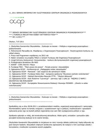 11_2011 SERWIS INFORMACYJNY OLSZTYNSKIEGO CENTRUM ORGANIZACJI POZARZADOWYCH *** SERWIS INFORMACYJNY OLSZTYŃSKIEGO CENTRUM ORGANIZACJI POZARZĄDOWYCH*** *** I FUNDACJI INICJATYWA KOBIET AKTYWNYCH FIKA*** *** NR 11/2011*** Olsztyn, 7.07.2011 ================================= 1. Olsztyńska Kawiarenka Obywatelska - Dyskusje na tarasie – Polityka a organizacje pozarządowe podsumowanie 2. Pełnomocnik Marszałka ds. Współpracy z Organizacjami Pozarządowymi - Rozstrzygniecie konkursu na wkład własny 3. Praca nad Programem współpracy na 2012 rok 4. Nabór wniosków na projekty MAŁE w ramach Funduszu dla Organizacji Pozarządowych 5. Urząd Ochrony Konkurencji i Konsumentów - konkurs dla konsumenckich organizacji pozarządowych 6. Profesjonalne doradztwo dla NGO 7. ESWIP - COPy Warmii i Mazur 8. Fundacja FIKA - "Mam prawo do prawa" - Porady prawne i obywatelskie 9. Ogłoszenia OCOP – Konferencja pt. „Pedagogika wobec stereotypów” 10. Ogłoszenia OCOP - Mamanet – sieć wsparcia dla samotnych matek 11. Ogłoszenia OCOP - Fundacja Dobra Sieć - kampania społeczna "Kluczowe wartości wolontariatu" 12. Ogłoszenia OCOP - Oddział Warmińsko-Mazurski PTTK - "Olsztyn Aktywnie" 13. Ogłoszenia OCOP - Koło Rodzinne "Laurencja" - pierwszy rajd z cyklu pt. "WĘDRUJ Z NAMI I ZACHWYCAJ SIĘ ROŚLINAMI" 14. Ogłoszenia OCOP - Europejskie Stowarzyszenie Edukacji i Rozwoju PIONIER - „Otwórz w sobie wolontariuszkę” ================================= -----------------------------------------------------------------1. Olsztyńska Kawiarenka Obywatelska - Dyskusje na tarasie – Polityka a organizacje pozarządowe podsumowanie -----------------------------------------------------------------Spotkaliśmy się w dniu 28.06.2011 z przedstawicielami mediów, organizacji pozarządowych i samorządu. Wymienialiśmy opinie na tematy związane z uczestnictwem ngo w polityce, możliwościami i sposobami wpływania przez ngo na kształt polityki regionalnej oraz sam fakt występowania polityki w ngo. Spotkanie upłynęło w miłej, ale konstruktywnej atmosferze. Wiele opinii, wniosków i pomysłów dało początek koniecznej dyskusji na te ważne tematy. Olsztyńskie Kawiarenki Obywatelskie to inicjatywa na rzecz rozwoju debaty publicznej i będą odbywały się pod różnymi hasłami. Wszystkich chętnych serdecznie zapraszamy do wzięcia w nich czynnego udziału i korzystania z możliwości wyrażania swoich poglądów. Ostatnie spotkanie pokazało, że jest taka potrzeba a co najważniejsze chęć dyskusji i wspólnej pracy. Jest to doskonała okazja, by posłuchać i przedstawić swoje pomysły. Im większe zainteresowanie i udział Państwa w tego typu przedsięwzięciach, tym większy nasz wpływ na to co dzieje się wokół i mniejsze rozczarowanie, że nie wygląda to tak jak byśmy tego chcieli. Moderatorami spotkania byli Marek Jarmołowicz i Monika Falej, którzy mają nadzieję kolejne spotkania z Państwem. Informacje o zbliżających się spotkaniach zamieścimy na naszej stronie internetowej, zapraszamy do jej śledzenia i kontaktowania się z nami. Debata została nagrana i wkrótce zostanie umieszczona na stronie internetowej OCOP w formie pliku mp3. Zdjęcia ze spotkania >> --------------------------------------------------------------------2. Pełnomocnik Marszałka ds. Współpracy z Organizacjami Pozarządowymi - Rozstrzygniecie konkursu na wkład własny --------------------------------------------------------------------Pełnomocnik Marszałka ds. Współpracy z Organizacjami Pozarządowymi informuje, że Zarząd Województwa Warmińsko-Mazurskiego w dniu 27 czerwca br. przyznał dotacje na dofinansowanie zadań Samorządu Województwa realizowanych przez organizacje pozarządowe w zakresie wkładu własnego do projektów finansowanych z funduszy zewnętrznych. Rozdysponowano kwotę 60 tys. zł. Zgodnie z podjętą uchwałą dotacje przyznawane będą wg. kolejności na liście rankingowej umieszczonej na stronie: http://bip.warmia.mazury.pl w zakładce: „otwarte konkursy ofert – rozstrzygnięcia” w przypadku uzyskania dofinansowania z funduszu zewnętrznego i do wyczerpania środków finansowych. Warunkiem przekazania dotacji jest dostarczenie umowy zawartej z funduszem zewnętrznym. Kontakt: Joanna Glezman Pełnomocnik Marszałka ds. Współpracy z Organizacjami Pozarządowymi Tel. 600 196 566 --------------------------------------------------------------------3. Praca nad Programem współpracy na 2012 rok --------------------------------------------------------------------Biuro Pełnomocnika zachęca organizacje pozarządowe prowadzące swoją działalność w Olsztynie, do zgłaszania propozycji działań/zadań do projektu Programu współpracy Gminy Olsztyn z organizacjami pozarządowymi oraz podmiotami wymienionymi w art. 3 ust. 3 ustawy o działalności pożytku publicznego i o wolontariacie na rok 2012. Propozycje i uwagi proszę zgłaszać na adres [email protected] do dnia 15.08.2011 formularz_zmian.doc >> Więcej na: www.ngo.olsztyn.eu --------------------------------------------------------------------4. Nabór wniosków na projekty MAŁE w ramach Funduszu dla Organizacji Pozarządowych --------------------------------------------------------------------Rozpoczął się nabór wniosków na projekty MAŁE w ramach Funduszu dla Organizacji Pozarządowych ECORYS Polska Sp. z o.o. w partnerstwie ze Stowarzyszeniem Gmin RP Euroregion Bałtyk w ramach Funduszu dla Organizacji Pozarządowych Szwajcarsko-Polskiego Programu Współpracy. Zobacz więcej >> Serdecznie zapraszamy do korzystania z bezpłatnego doradztwa specjalistów Olsztyńskiego Centrum Organizacji Pozarządowych w zakresie przygotowywania oferty. Kontakt: [email protected] Tel. 512 558 349 --------------------------------------------------------------------5. Urząd Ochrony Konkurencji i Konsumentów - konkurs dla konsumenckich organizacji pozarządowych ------------------------------------------